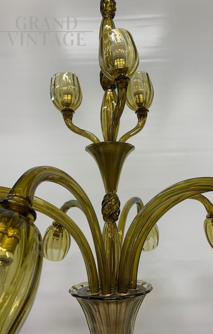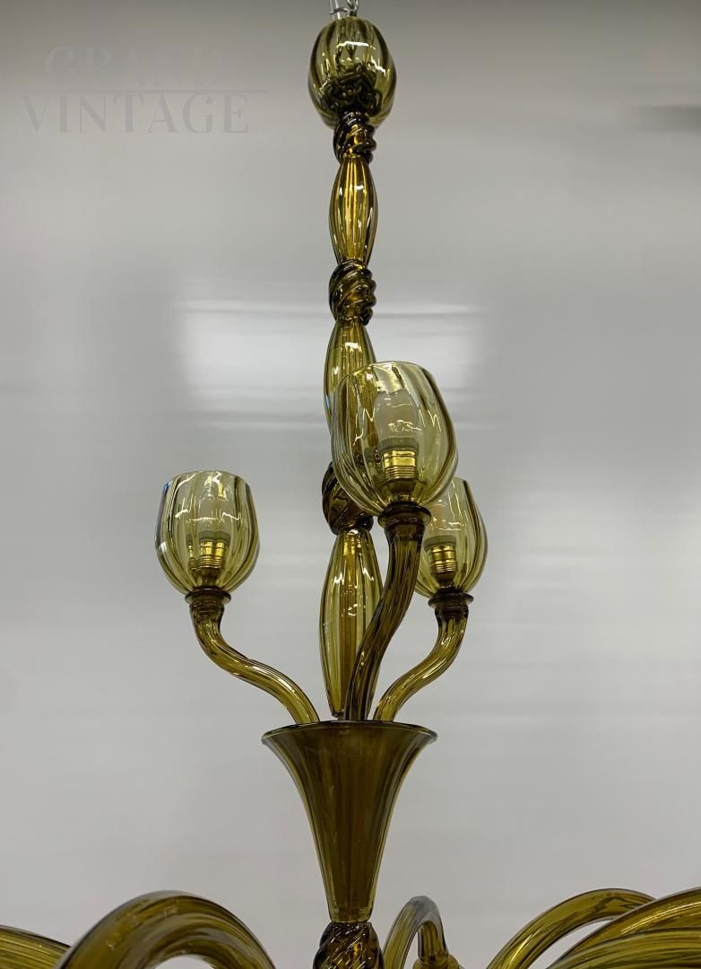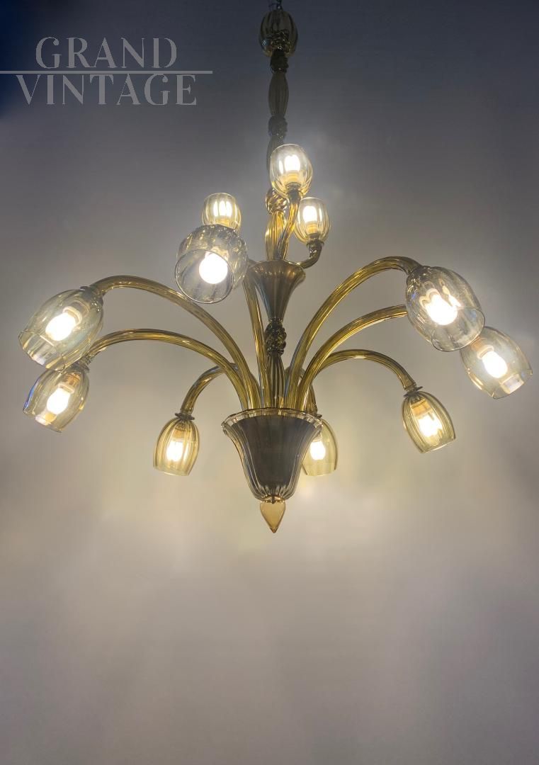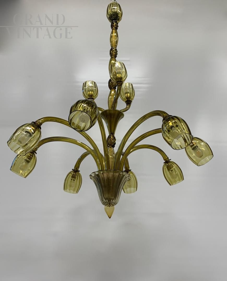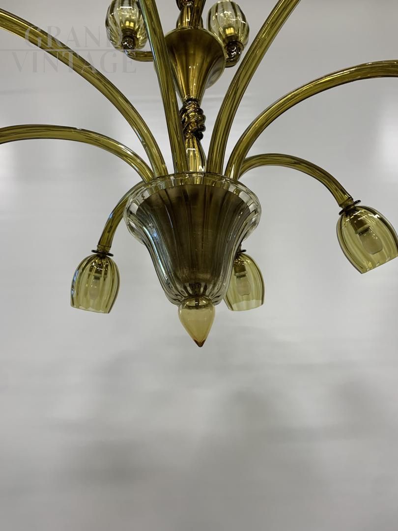 Elegante lampadario vintage attribuito a Venini caratterizzato da bracci curvi e una struttura in vetro trasparente di tonalità gialla tendente al verde. Ogni braccio termina con un paralume che ricorda un calice, creando un effetto delicato e raffinato. La base del lampadario è decorata e aggiunge un tocco di raffinatezza all'insieme. E' un vetro elegante e pulito tipico degli anni 1930. Lampadario a 2 piani. E' stato restaurato totalmente. E'stato cambiato l'impianto elettrico, alcune braccia son state rigessate ed è stato rifatto un fondino di legno. Anni 1930 circa.