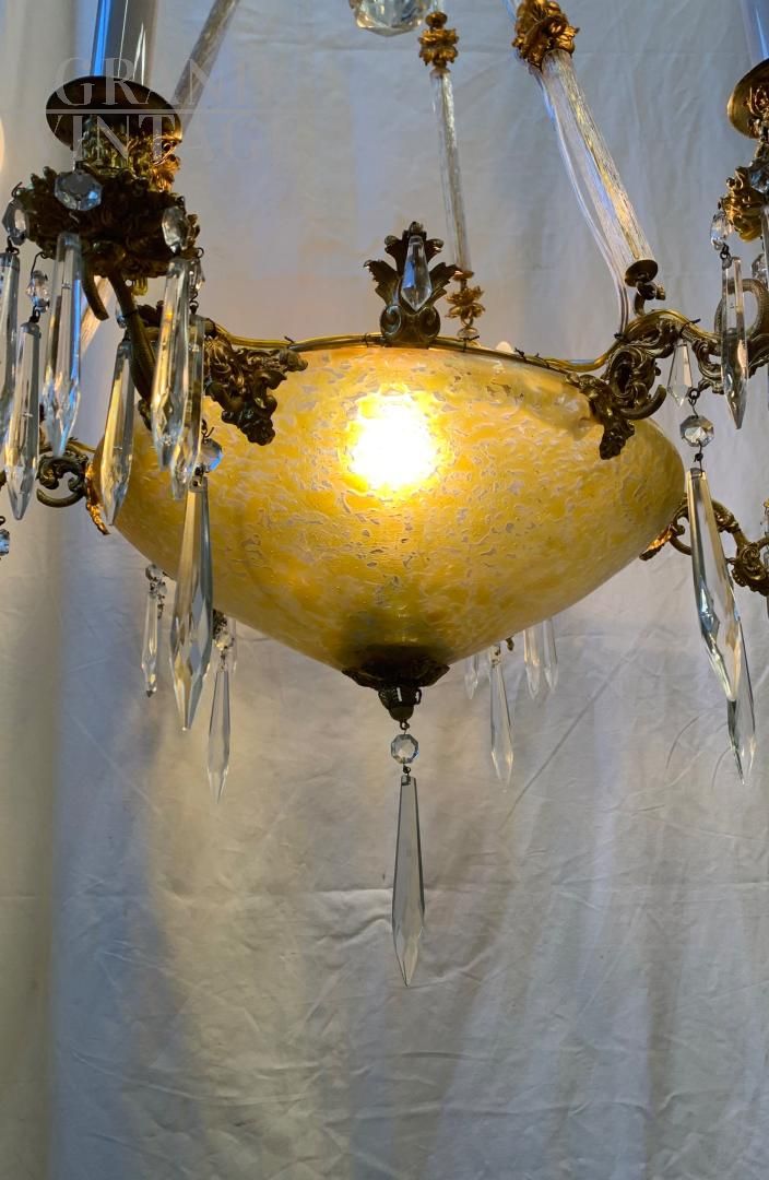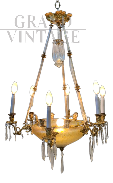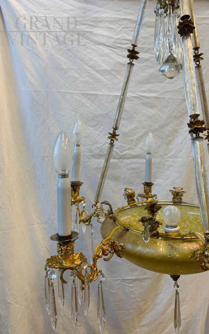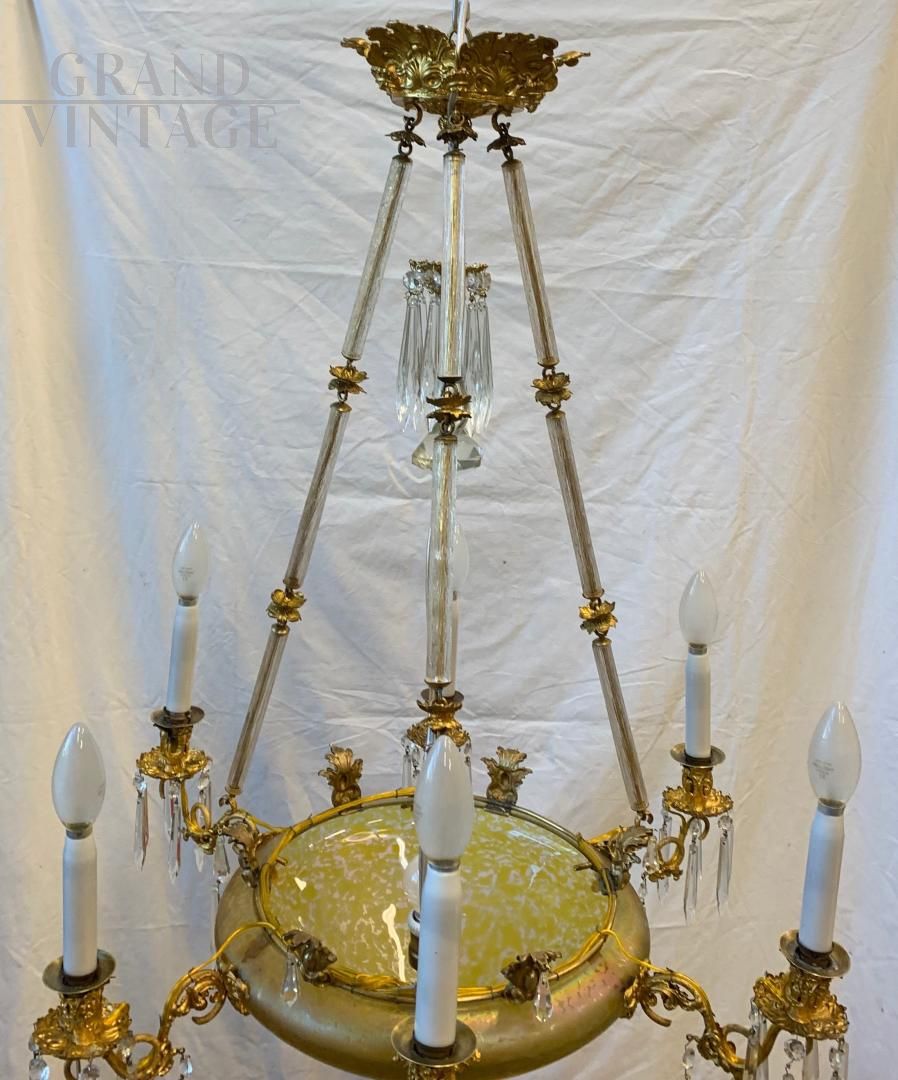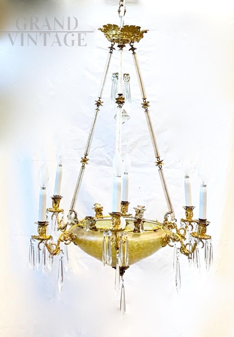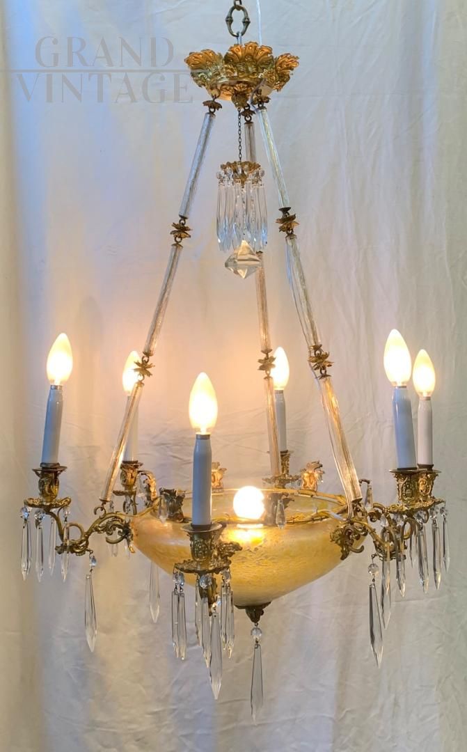 Bellissimo lampadario austriaco di inizio '900 con 6 luci con lampadina E14 e una luce centrale con lampadina E27. Lampadario di medie dimensioni, Le luci esterne sono comprese di candele in vetro. Ha una linea bella e delicata tipica dell'inizio del '900, vetro acidato color ocra e trasparente. La struttura è in ottone dipinto oro. Impianto elettrico nuovo, adatto all'utilizzo di lampadine a Led. Il lampadrio presenta qualche naturale segno del tempo, ma i vetri sono in perfetto stato. Ottimo pezzo per arredare diverse stanze, non abbaglia se vengono montate lampadine bianco latte.