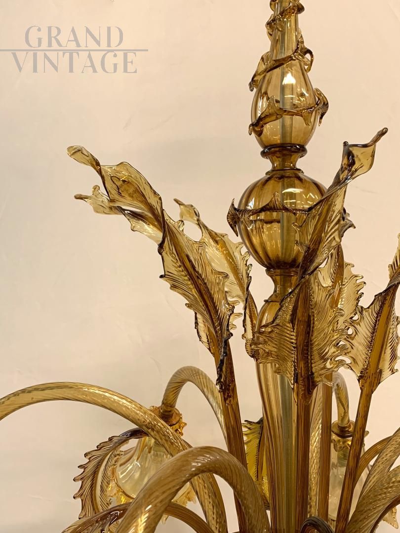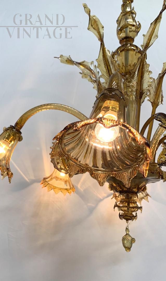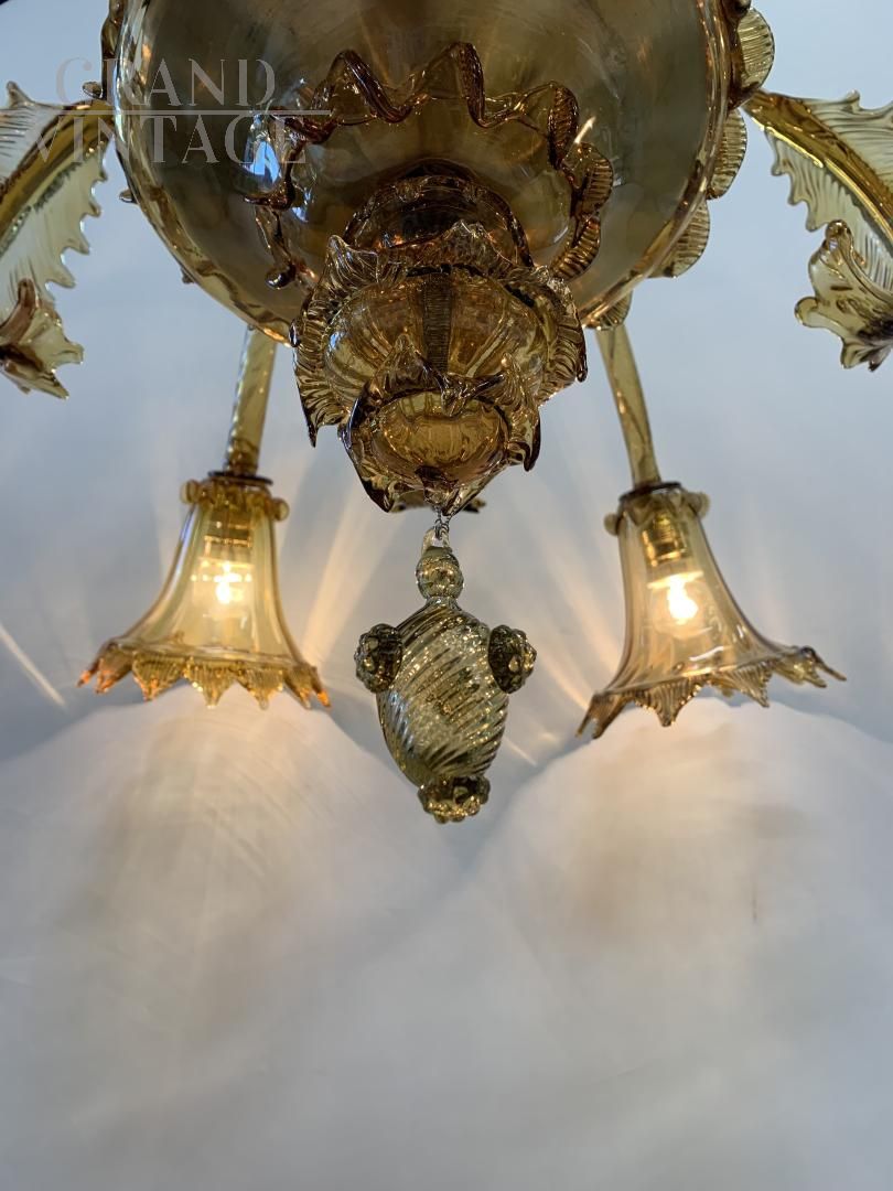 Lampadario Avem in vetro di Murano color ambra, anni '30, a 6 luci