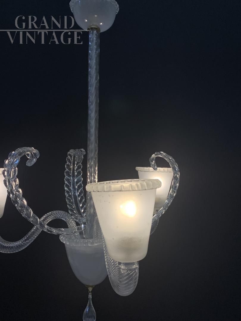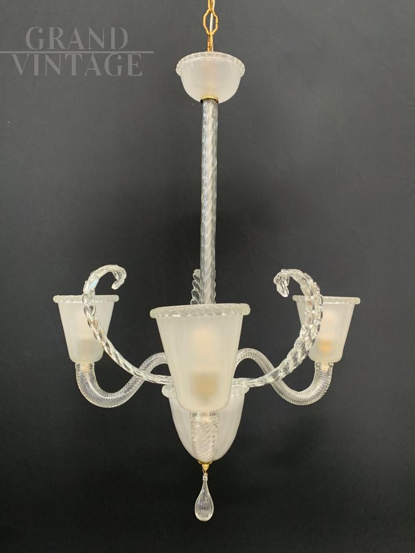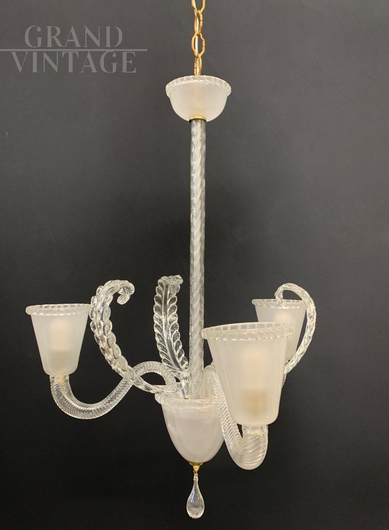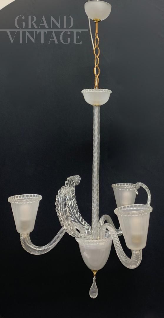 Fantastico lampadario in vetro di Murano trasparente sabbiato a tre bracci, attribuito alla ditta Barovier, degli anni '50 circa. In buone condizioni, tutto originale con pochissimi segni del tempo, impianto elettrico rifatto e funzionante con 3 attacchi per lampadina di tipo E27. Meraviglioso vetro soffiato a mano trasparente e sabbiato su struttura portante in ferro. I vetri non sono crepati, risultano intatti. Ottimo elemento che può arredare diverse stanze: dalla cucina alla sala, dall'entrata alla camera e bagno. Si consiglia l'utilizzo di lampadine al led.