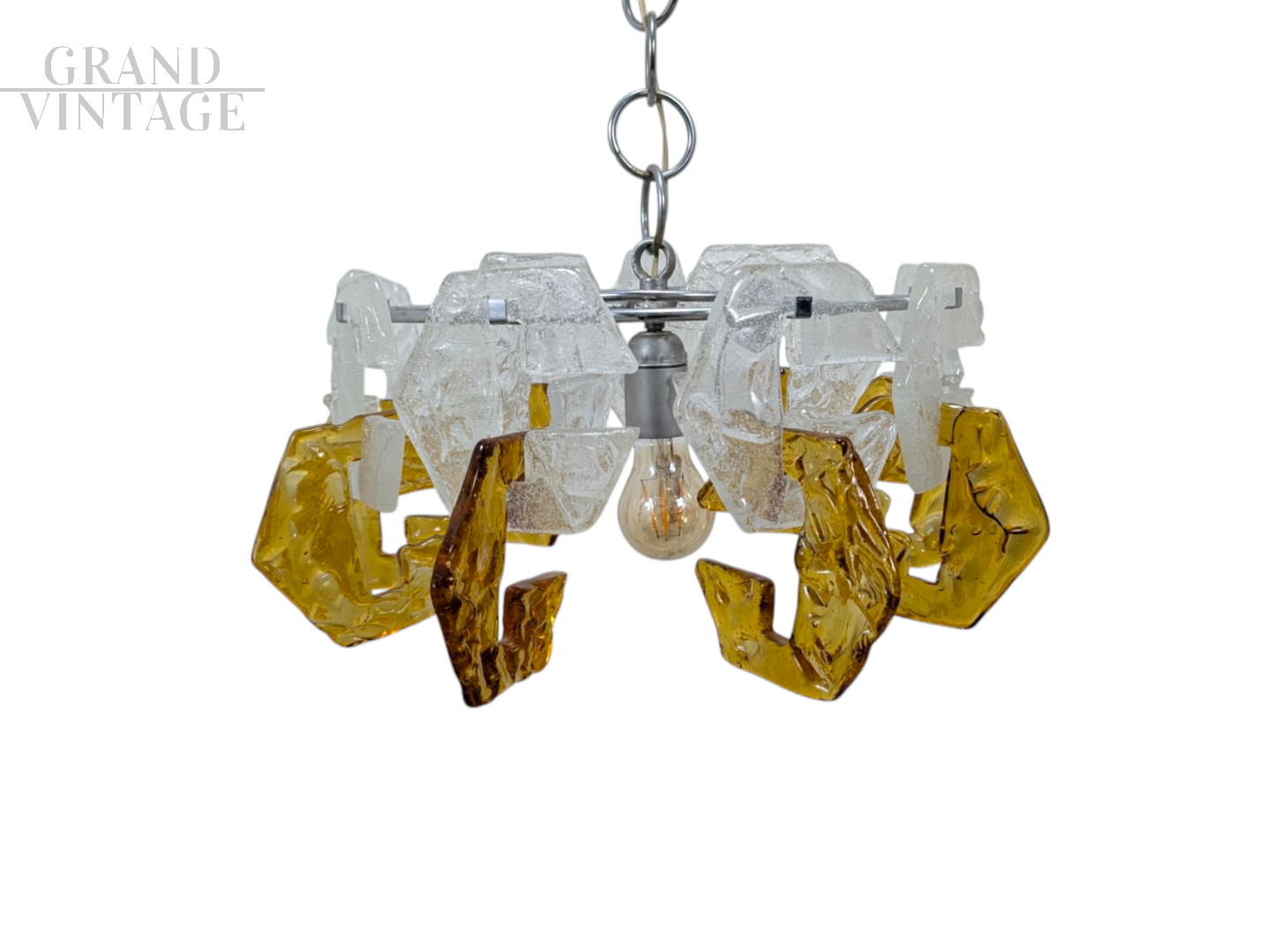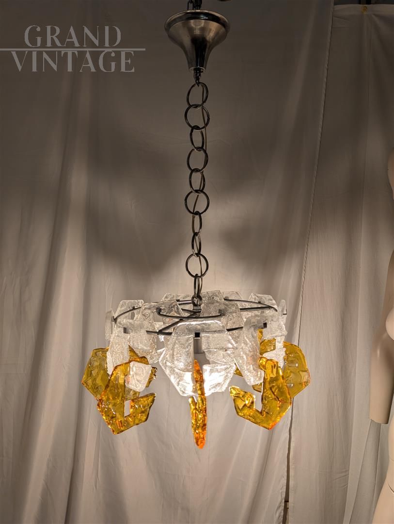 Lampadario a sospensione vintage con steli in vetro di Murano nei colori trasparente e ambra con bollicine in sospensione, dal particolare motivo geometrico, Italia anni '70. In ottime condizioni generali, elettronicamente testato e funzionante. Va montata una lampadina con attacco E27.