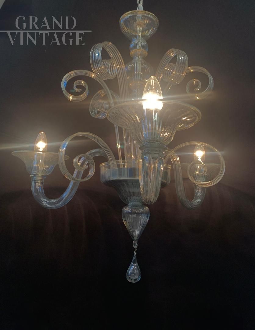 Bellissimo lampadario in vetro di Murano trasparente e oro a tre bracci, attribuito alla ditta Cesare Toso, degli anni '80 circa. In buone condizioni, tutto originale con pochissimi segni del tempo, impianto elettrico rifatto e funzionante con 3 attacchi per lampadina di tipo E14. Meraviglioso vetro soffiato a mano trasparente e con poco oro su struttura portante in ferro. I vetri non sono crepati, risultano intatti.  Ottimo elemento che può arredare diverse stanze: dalla cucina alla sala, dall'entrata alla camera e bagno. Si consiglia l'utilizzo di lampadine al led.