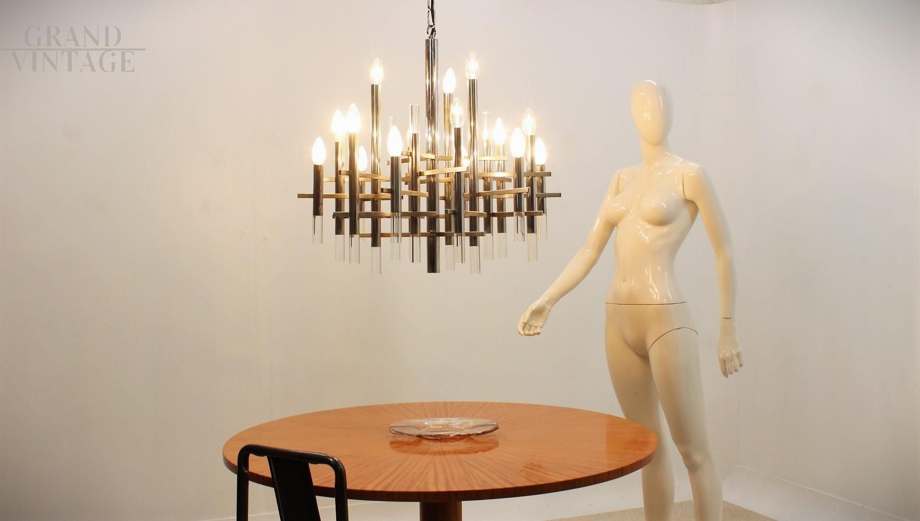 Un bel design geometrico per questo elegante lampadario di Gaetano Sciolari degli anni '70. Ha una struttura in metallo cromato e inserti in lucite, con 18 bracci e 15 luci. Impianto elettrico europeo completamente revisionato (220V). Compatibile con lampadine a LED con attacco E14. Si mantiene in ottime condizioni vintage, coerenti con l'uso e il tempo. Pronto per illuminare la vostra casa!