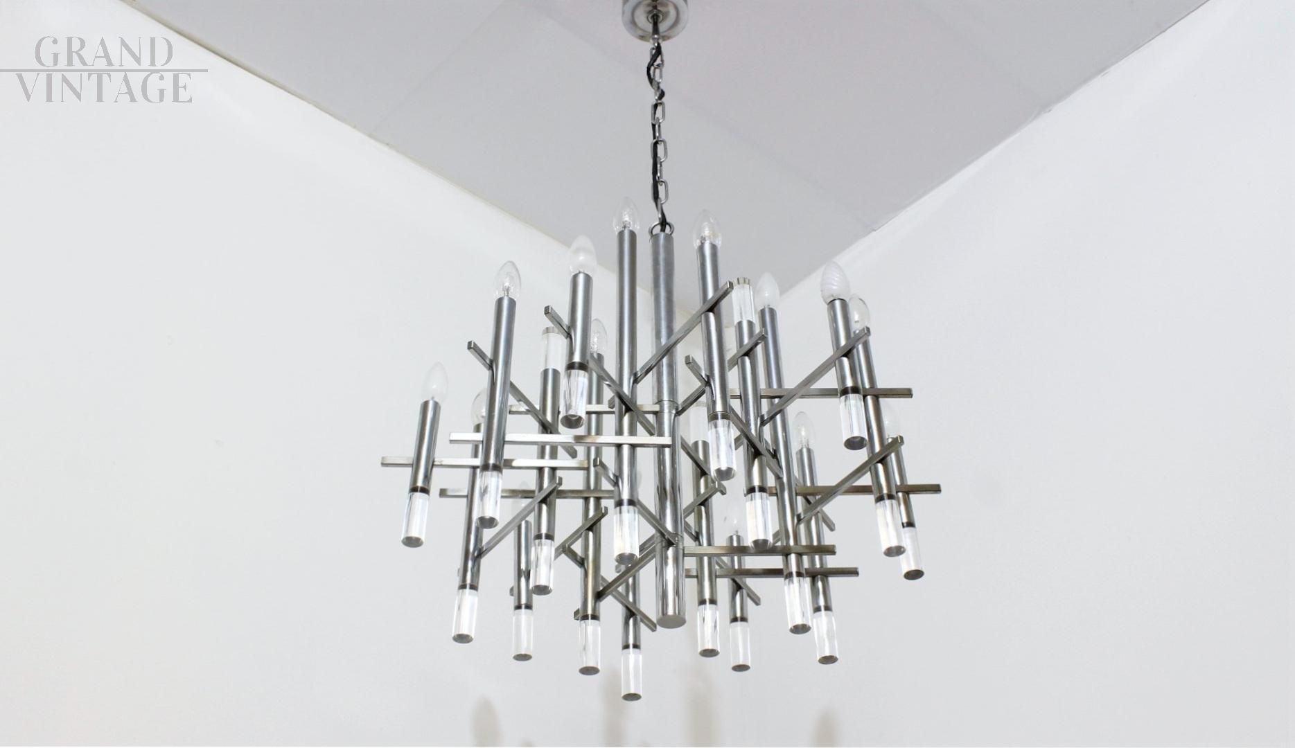 Lampadario di Gaetano Sciolari cromato a 15 luci, anni '70