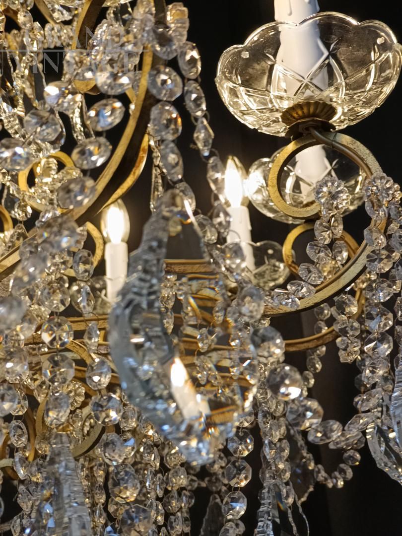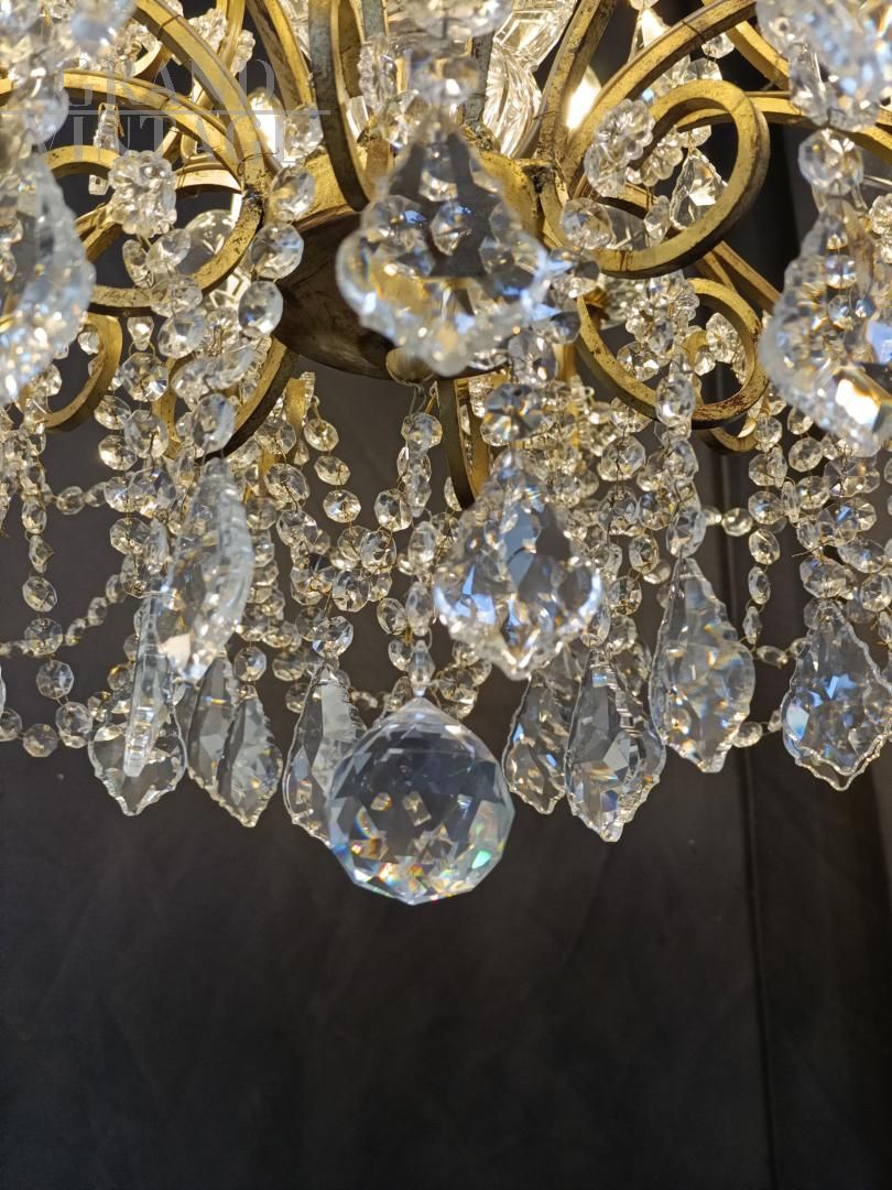 Lampadario finemente rifinito a mano,telaio in ferro con finitura in oro antico, pendagli in cristallo, legature dei cristalli realizzate a mano con filo di ottone. Il lampadario è dotato di 12 punti luce con forma a candela, ed è pronto per essere installato!