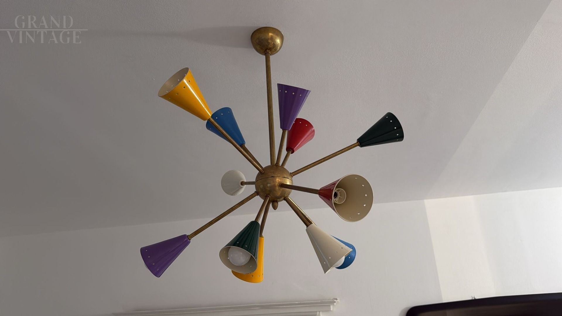 Lampadario in stile Sputnik di Stilnovo con struttura in ottone e 12 punti luce a cono in diversi colori: bianco, rosso, blu, giallo, viola e nero. In ottime condizioni, presenta lievi naturali segni del tempo. Non presenta marchi sulla struttura.