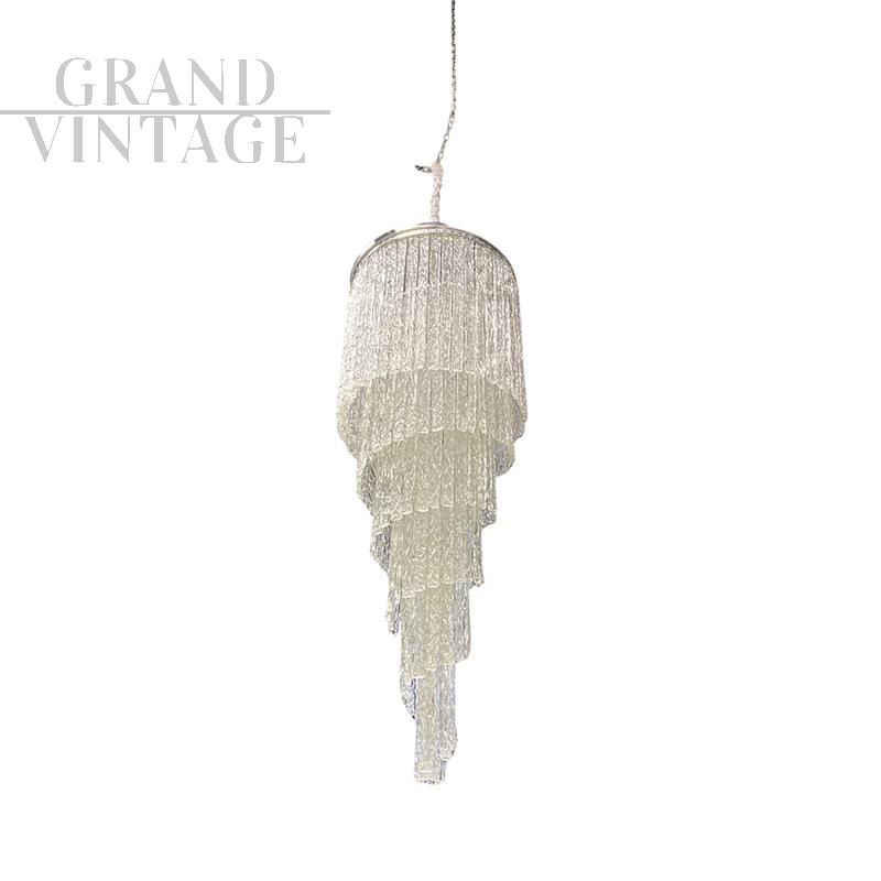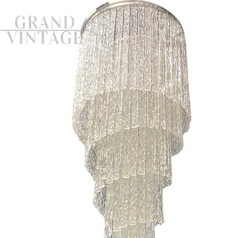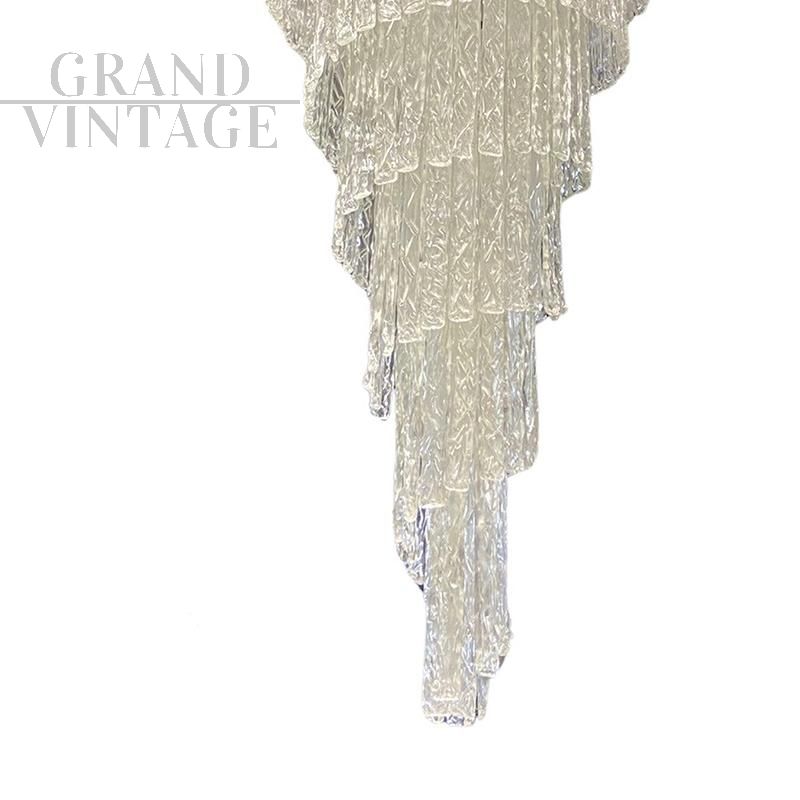 Sinuoso lampadario a cascata con forma a chiocciola composto da stecche di Vetro di Murano artistico trasparente con base in metallo rotondo.