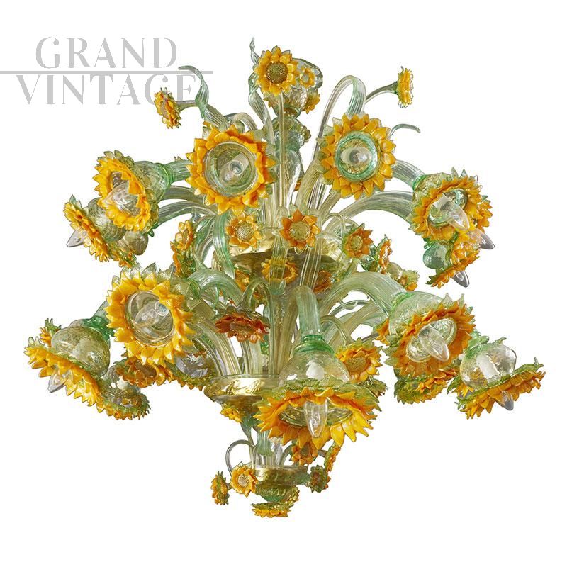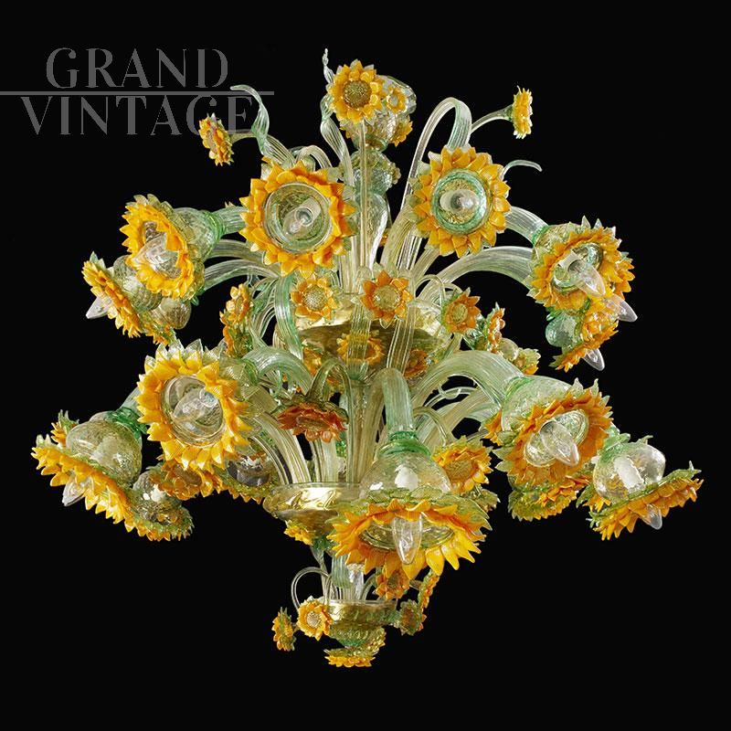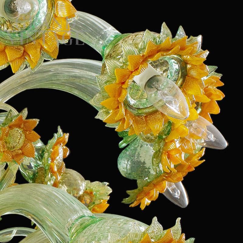 Maestoso lampadario in vetro artistico di Murano con girasoli gialli e foglie verdi su struttura dorata con oro 24 kt, molto luminoso grazie ai suoi 18 punti luce con attacchi per lampadine di tipo E14, max 40w.
