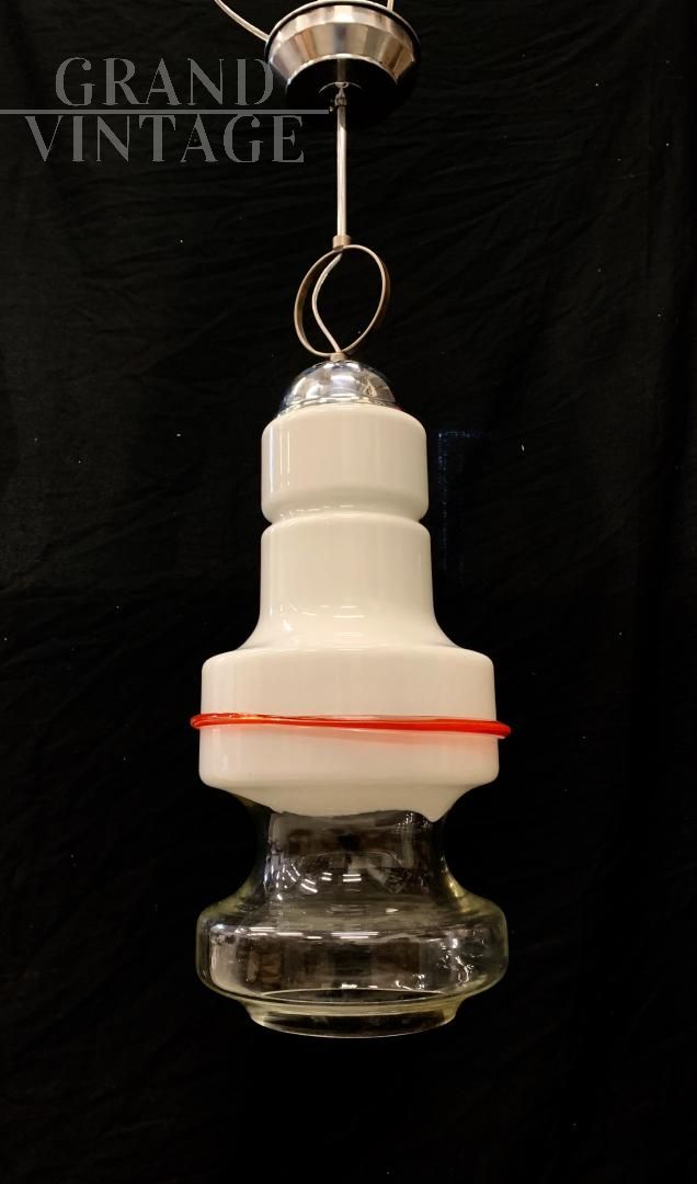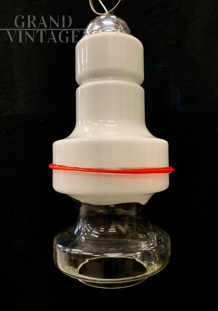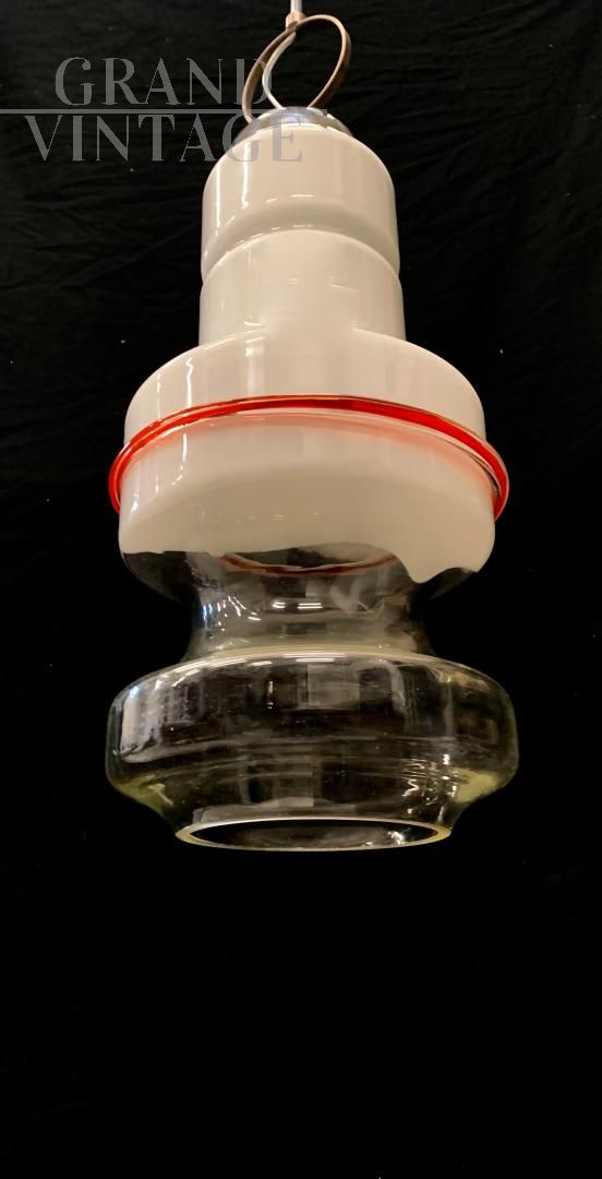 Bellissimo lampadario lampada a sospensione Leucos in vetro di Murano, anni '70, con 1 luce all'interno della coppa. Lampadario di medie dimensioni, ha una linea bella e delicata con un il bordo esterno rosso, tipico della ditta Leucos. Il vetro della coppa è trasparente nella parte inferiore, e color bianco panna con un bordo rosso nella superiore. Struttura in ottone e ferro, vetro intatto e non crepato, presenta qualche segno del tempo sulla struttura. Impianto elettrico rifatto, adatto all'utilizzo di lampadine a Led E27. Adatto a tutti gli ambienti, non abbaglia se vengono montate lampadine bianco latte.