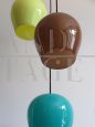 Lampada a sospensione italiana disegnata da Massimo Vignelli per Venini, diffusori in vetro colorato incamiciato e struttura superiore in ottone lucido, 1955 ca.