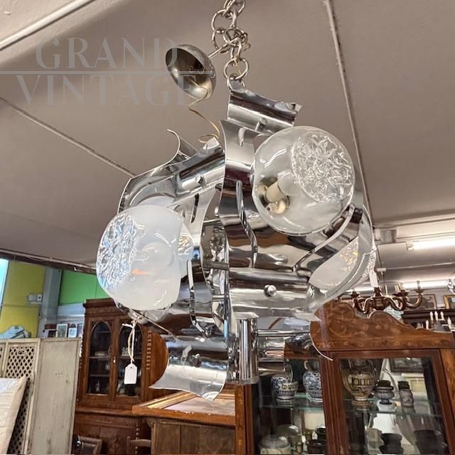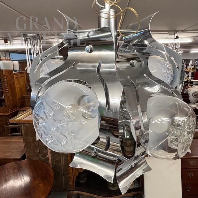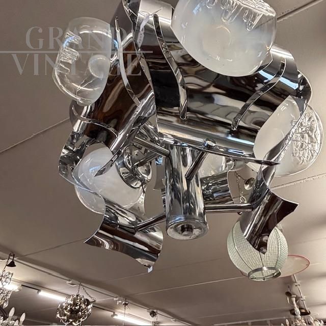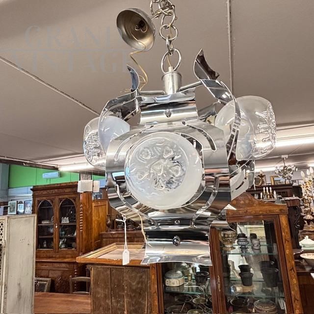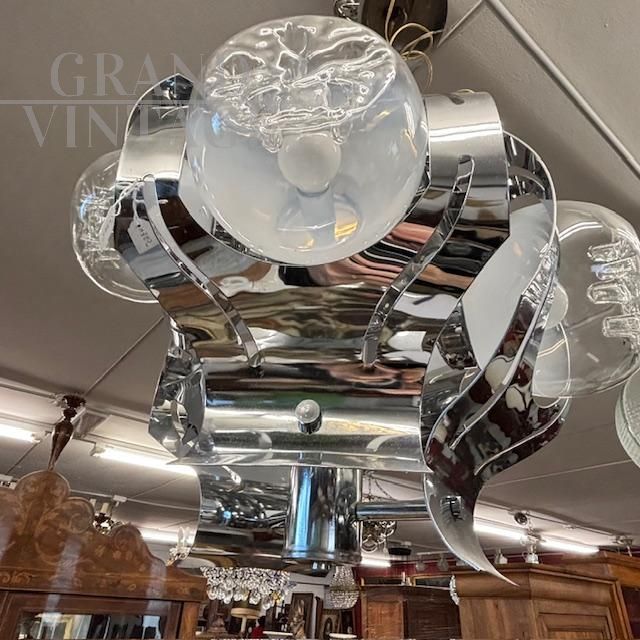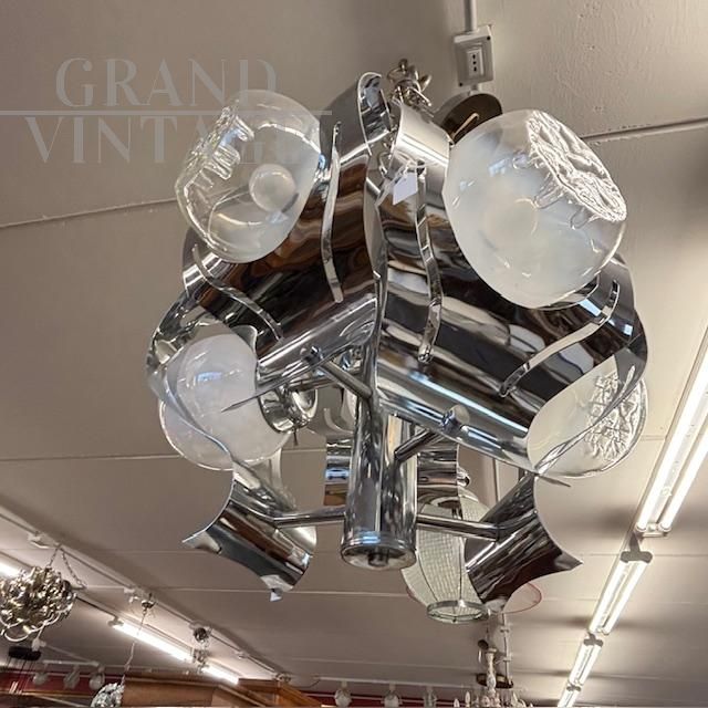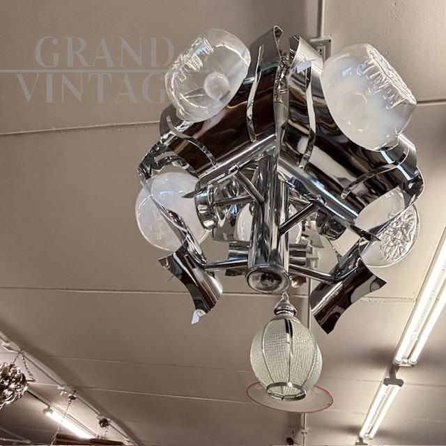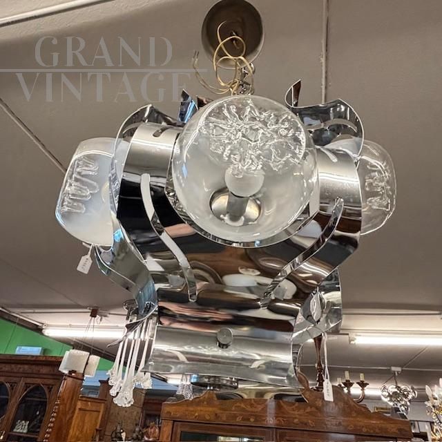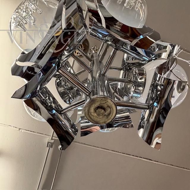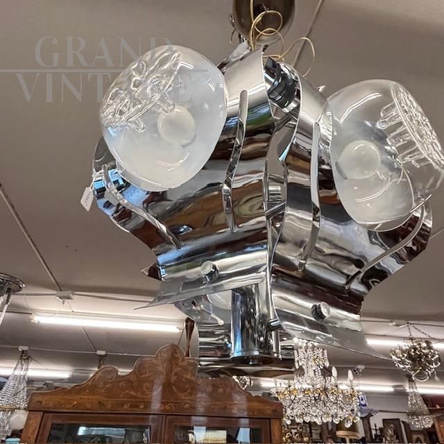 Lampadario design di Mazzega a sei luci in vetro di Murano e acciaio, in stile space age italiano degli anni '70. Impianto elettrico presente, in perfetto stato.