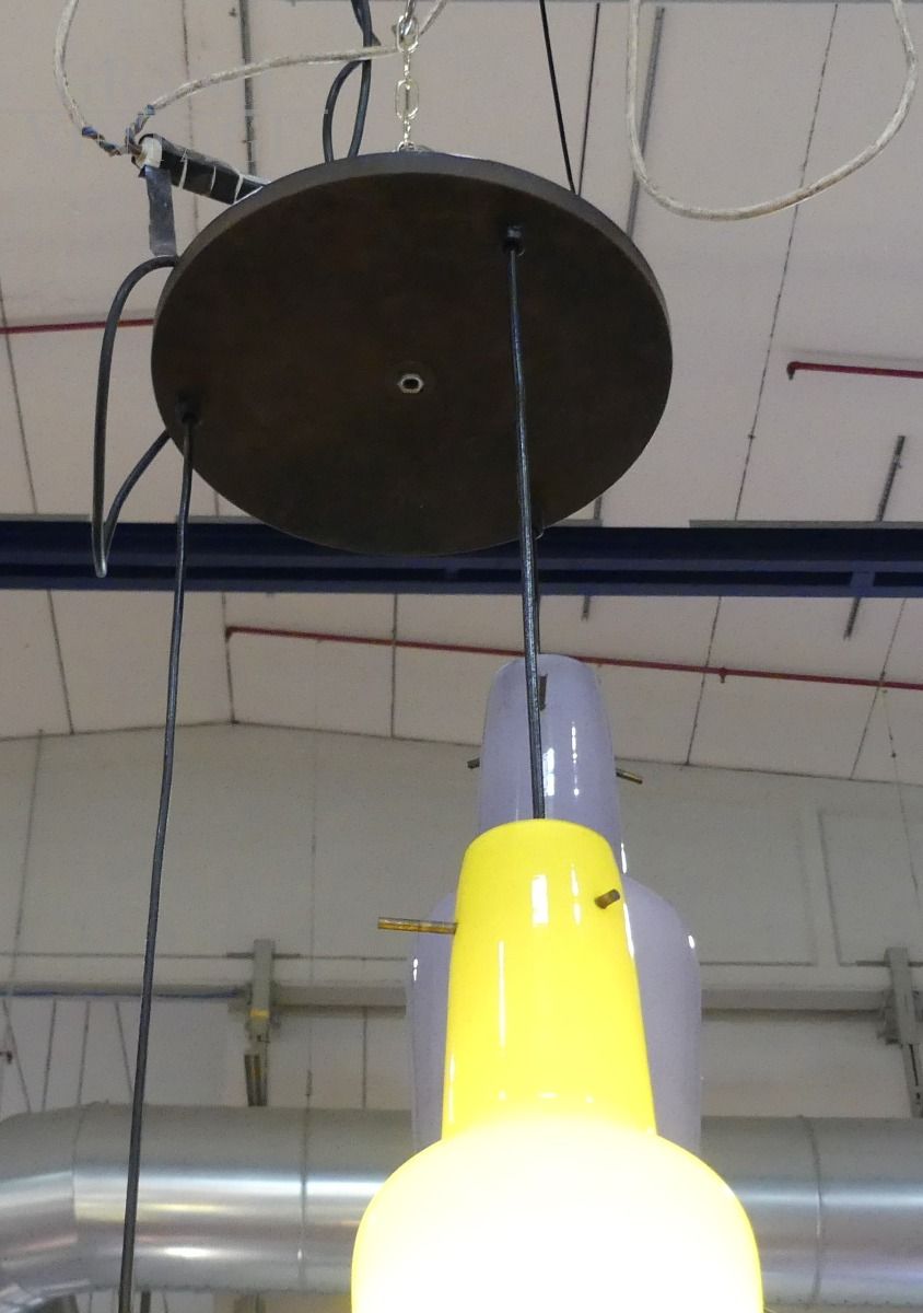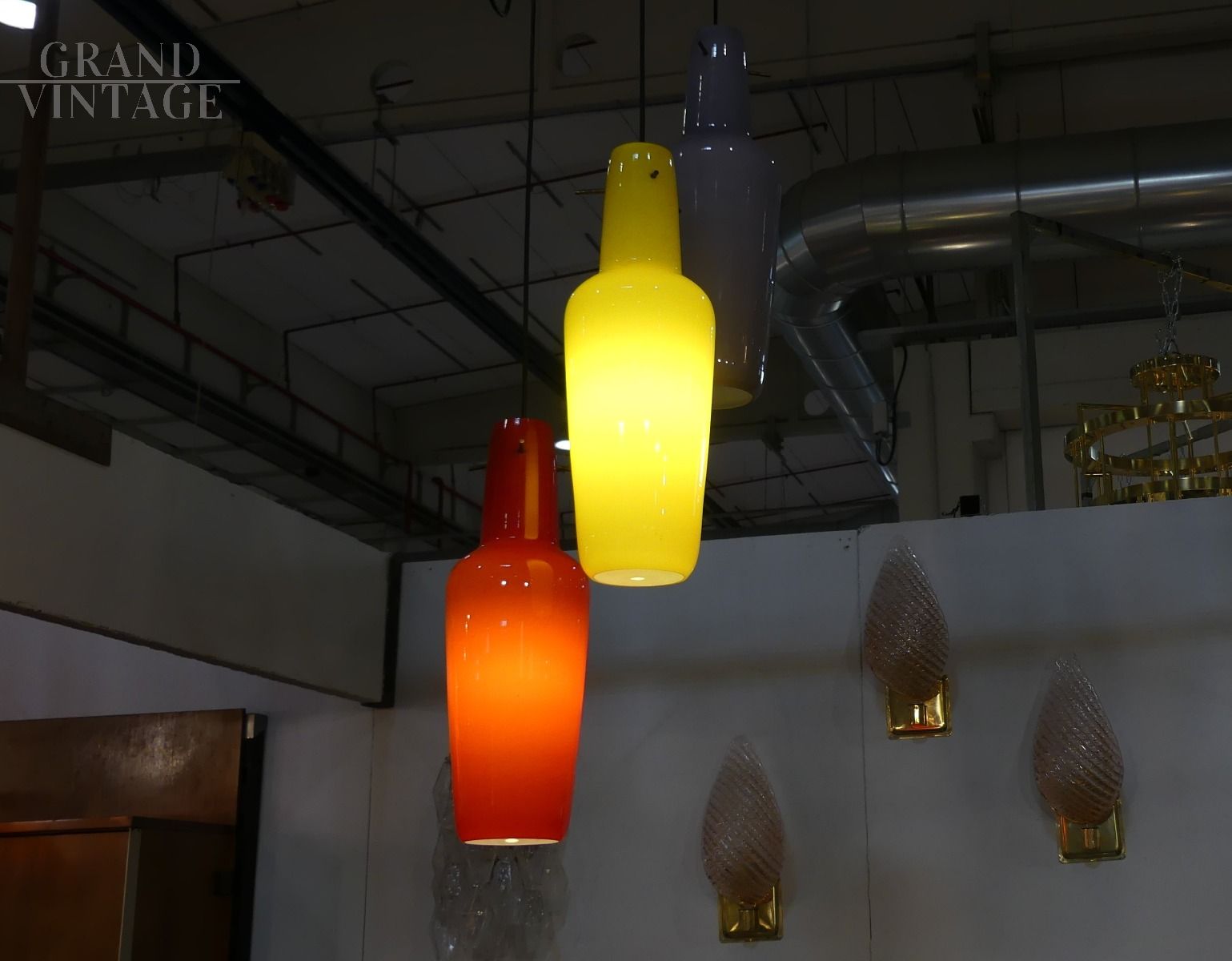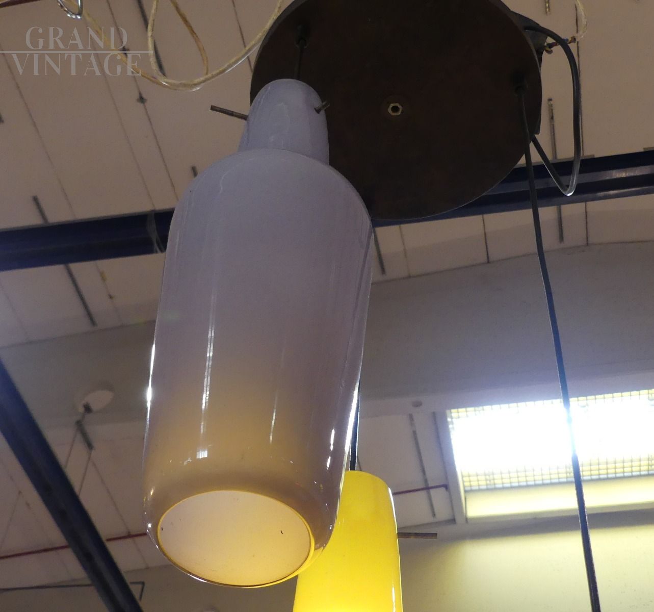 Lampadario mid century italiano, anni '50, con struttura in ottone e metallo e tre punti luce pendenti con paralumi in vetro incamiciato di tre colori diversi, giallo rosso e azzurro. Revisionato e funzionante.