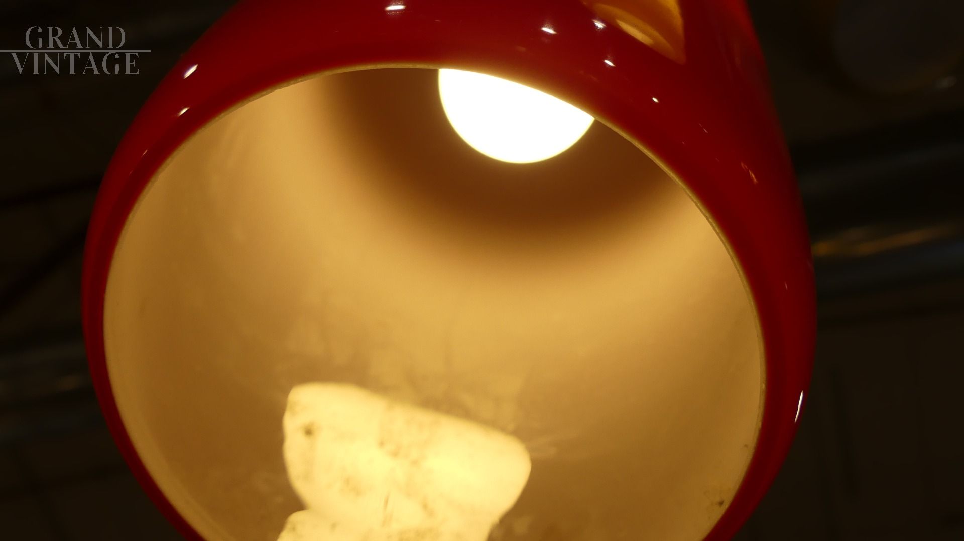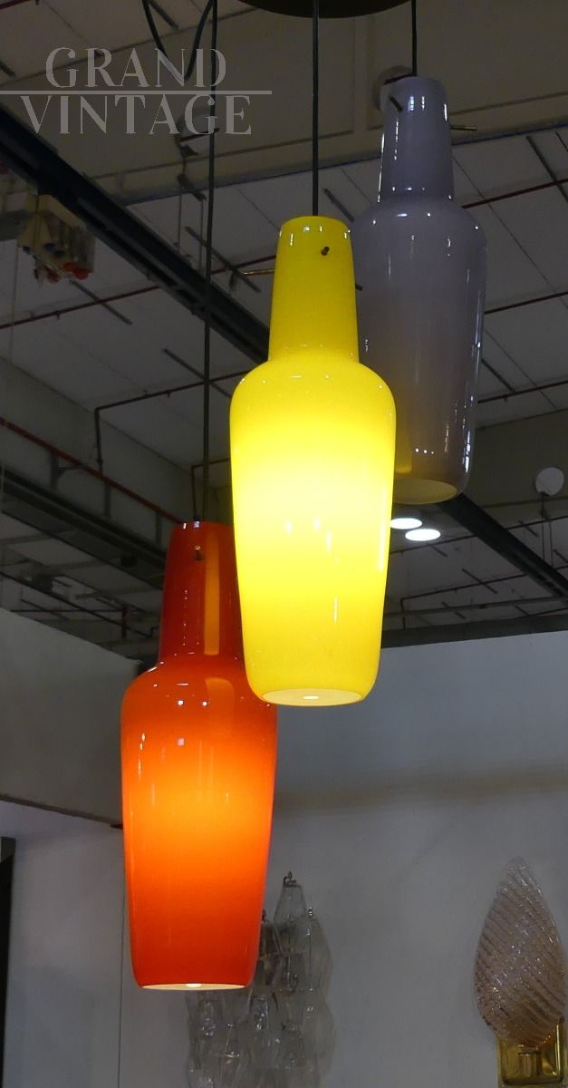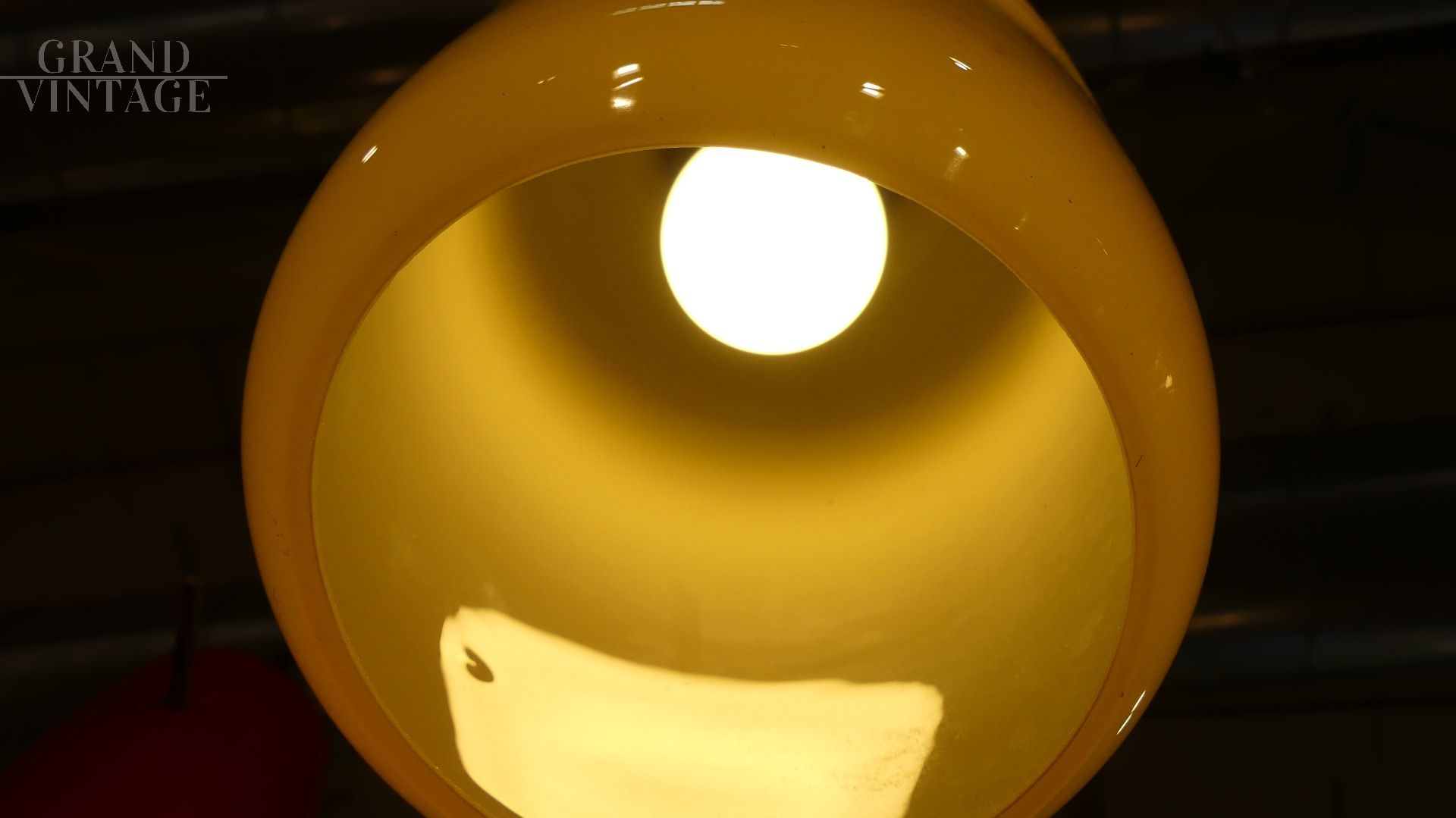 Lampadario mid century italiano, anni '50, con struttura in ottone e metallo e tre punti luce pendenti con paralumi in vetro incamiciato di tre colori diversi, giallo rosso e azzurro. Revisionato e funzionante.