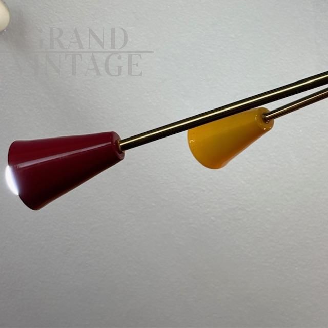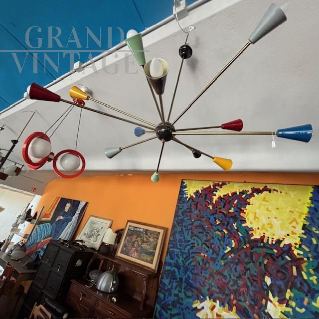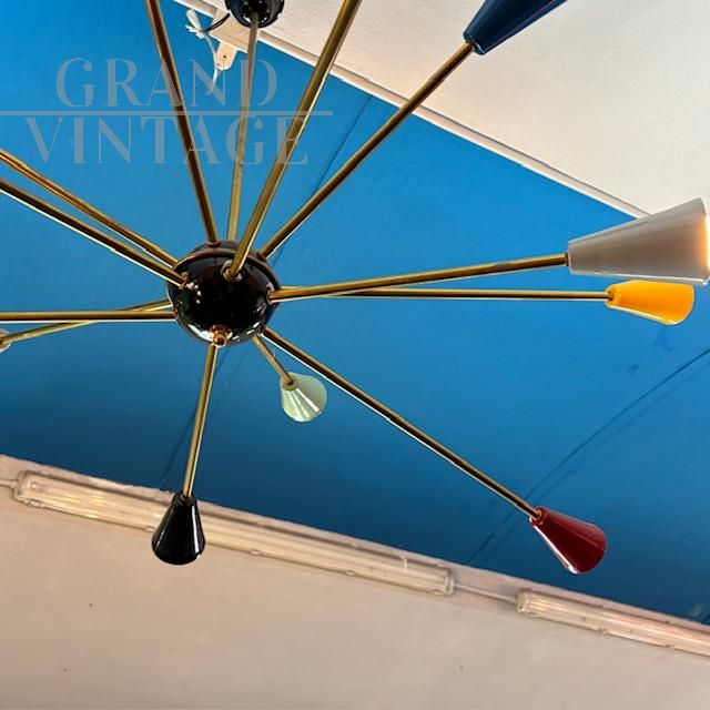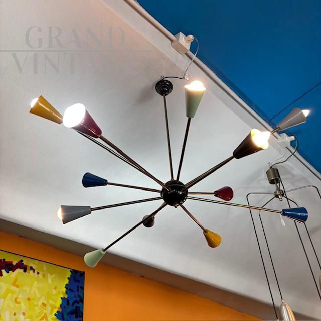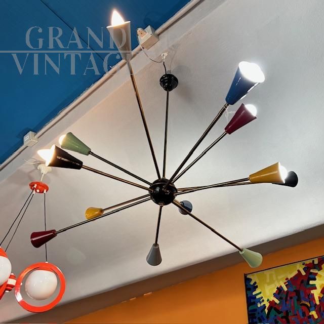 Lampadario Sputnik Arlecchino di Stilnovo originale anni '50 con 12 bracci con paralumi a cono colorati, elettrificato e restaurato anni fa, è in buono stato e consrva il marchio.