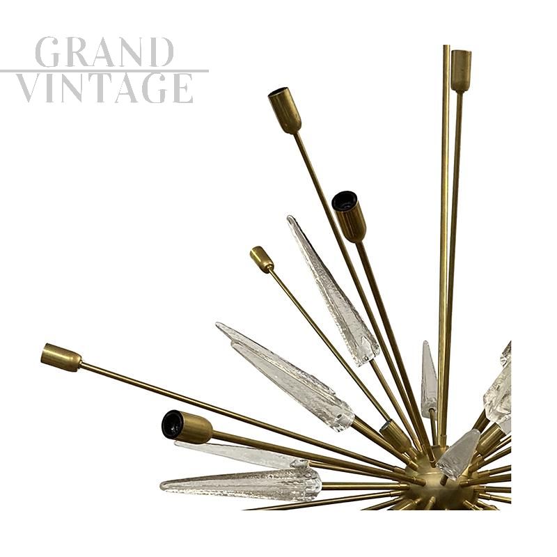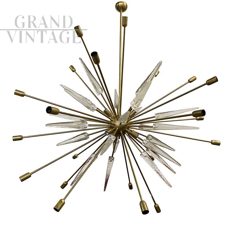 Lampadario moderno Sputnik con asta di ottone con un'estremità superiore semisferica che funge da supporto per una sfera alla quale sono attaccate numerose aste radiali disposte simmetricamente. Questi sono progettati in diverse lunghezze e servono in parte come punto di partenza per un perno in vetro trasparente bordato, in parte come asta filettata.