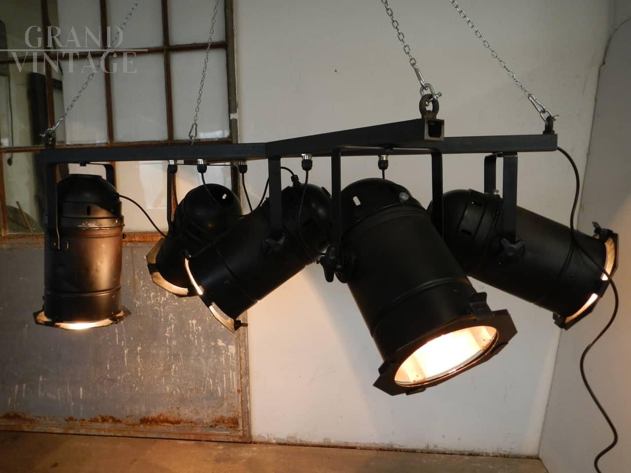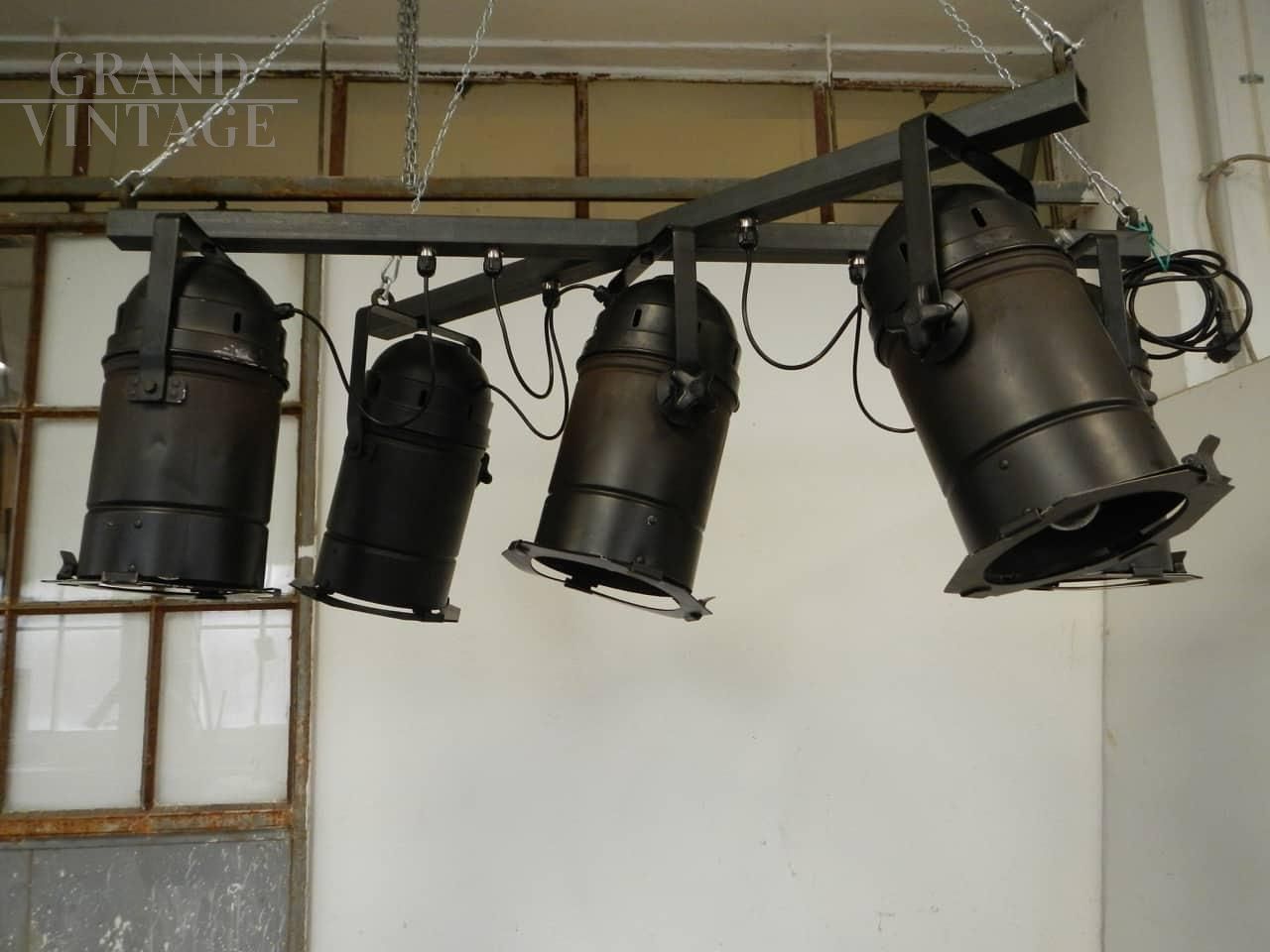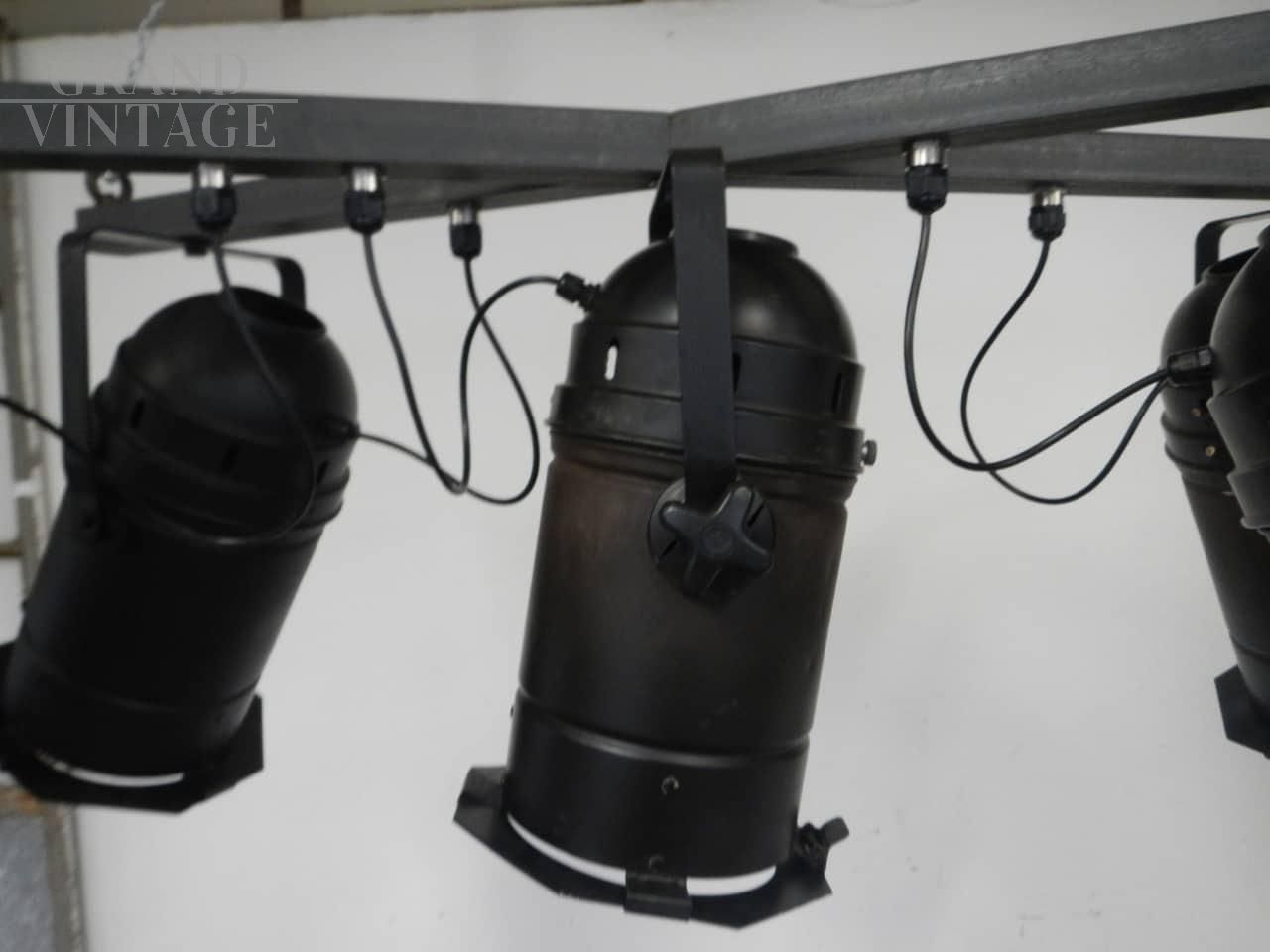 Lampadario costruito con trave ferro a c con 5 fari da teatro, funzionante con 4 golfare per fissare a soffitto, compreso nel prezzo anche la cassa per la spedizione.
