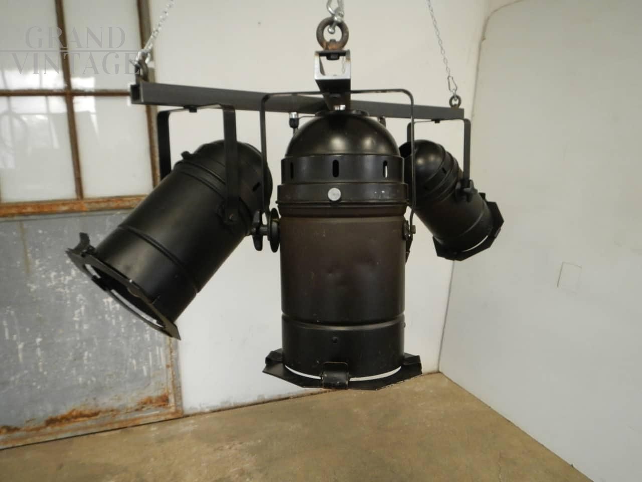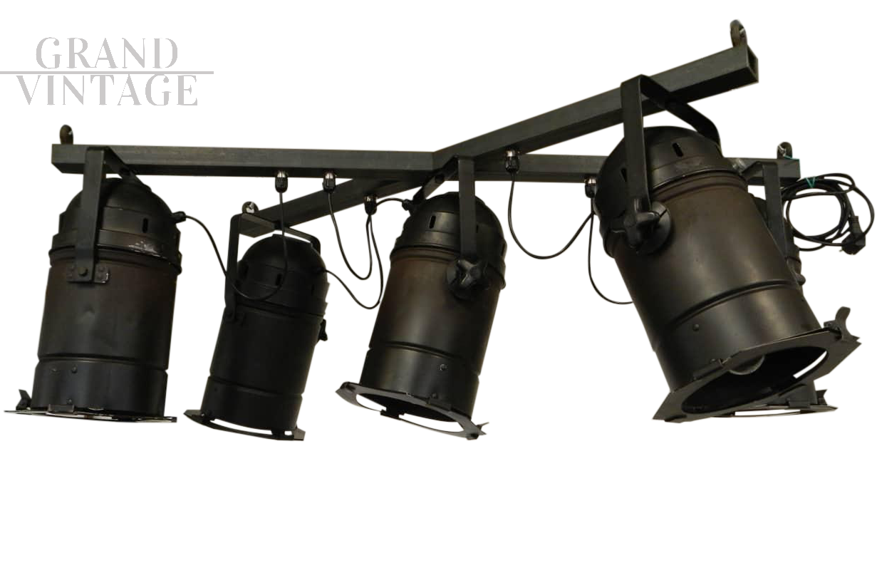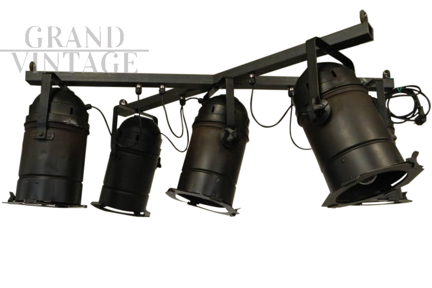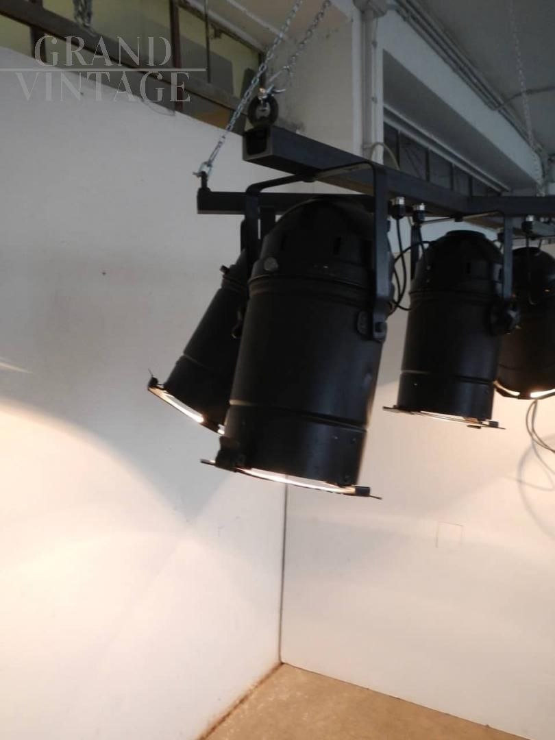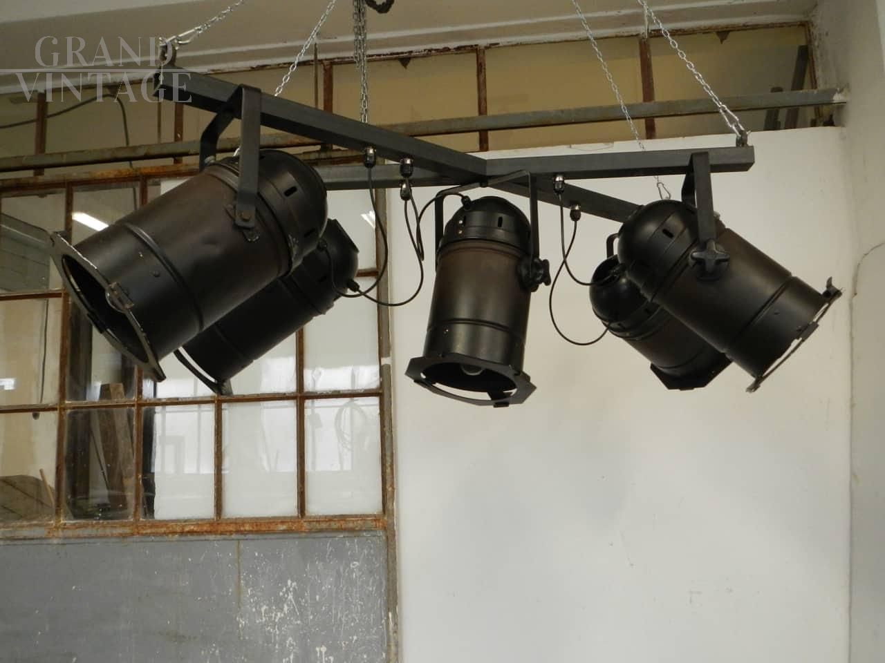 Lampadario costruito con trave ferro a c con 5 fari da teatro, funzionante con 4 golfare per fissare a soffitto, compreso nel prezzo anche la cassa per la spedizione.