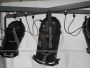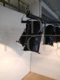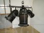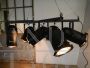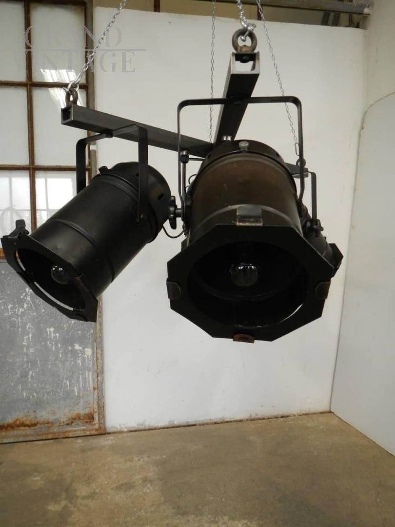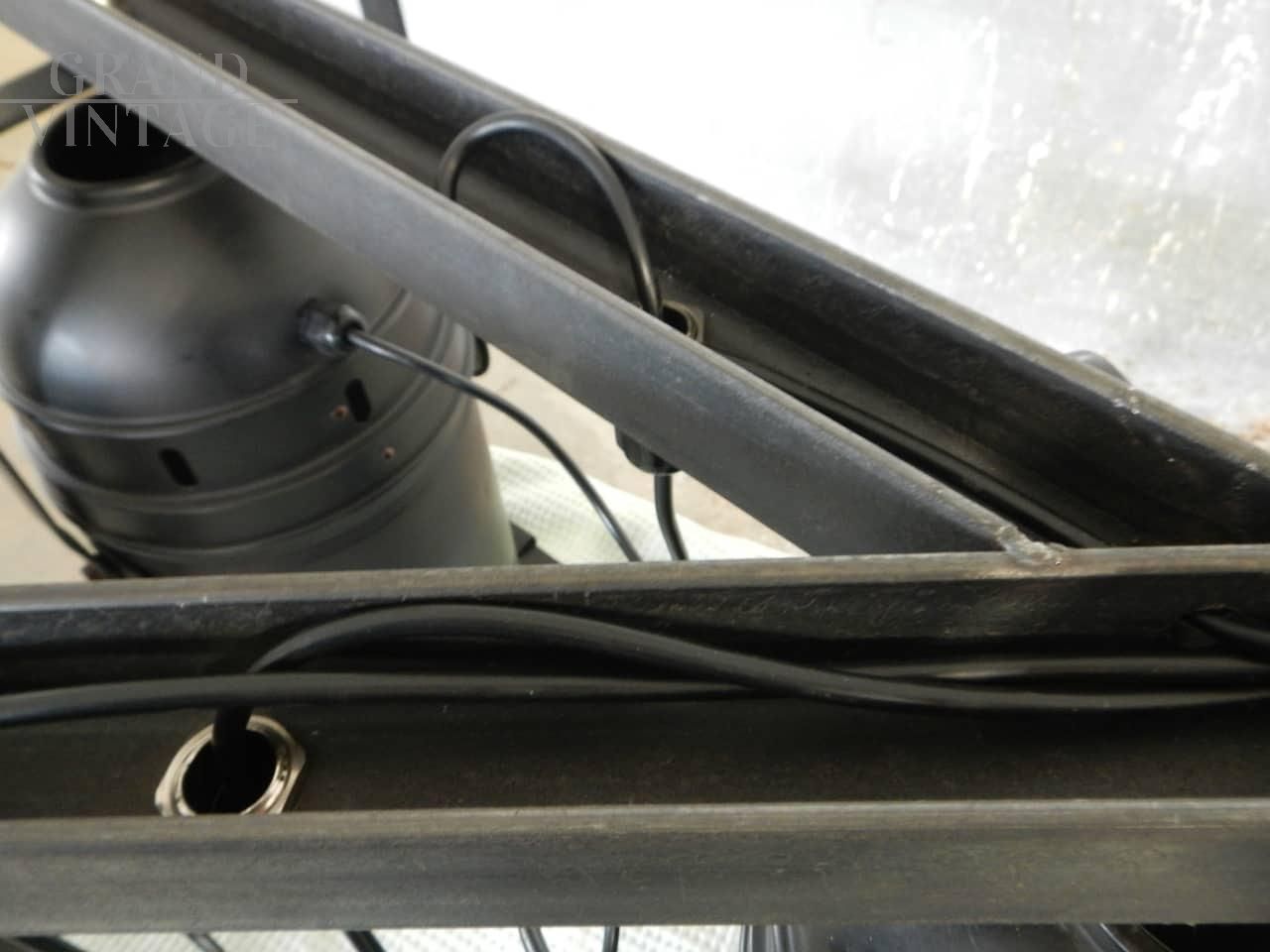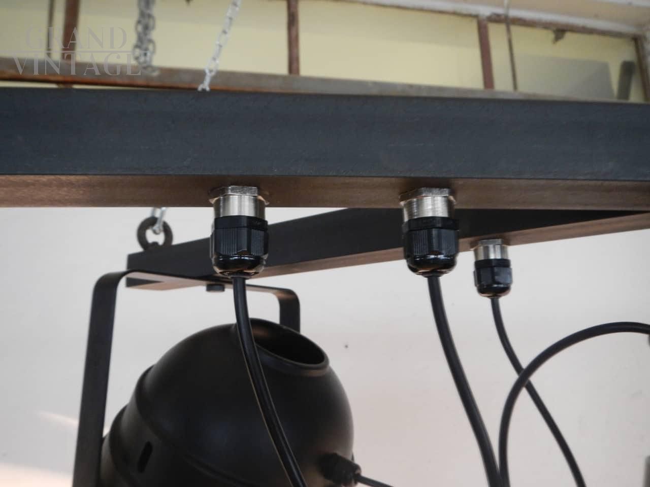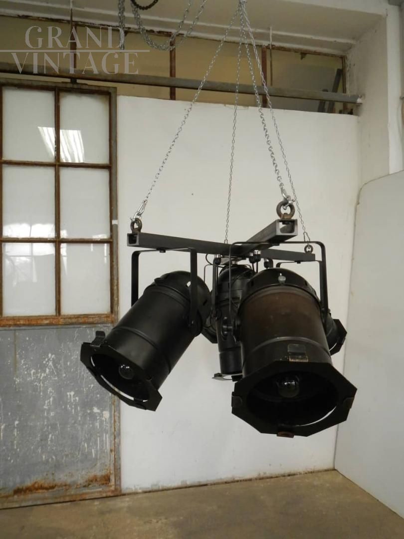 Lampadario costruito con trave ferro a c con 5 fari da teatro, funzionante con 4 golfare per fissare a soffitto, compreso nel prezzo anche la cassa per la spedizione.