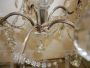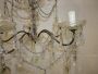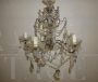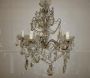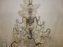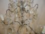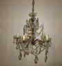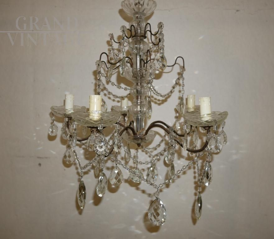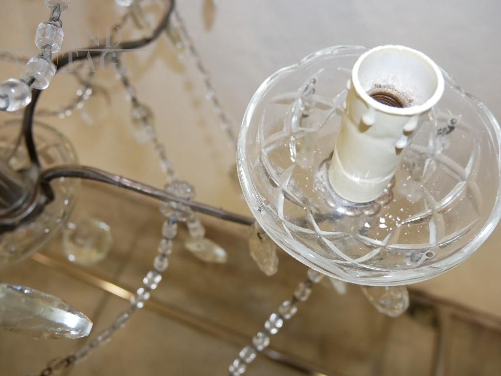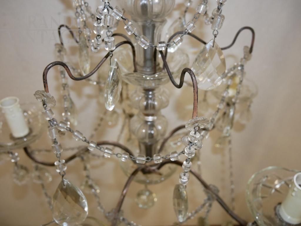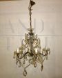 Lampadario anni '40 - 50 a 5 bracci con struttura in metallo color bronzo ricoperta da vari fili pendenti di prismi e gocce in cristallo. Impianto elettrico funzionante originale.