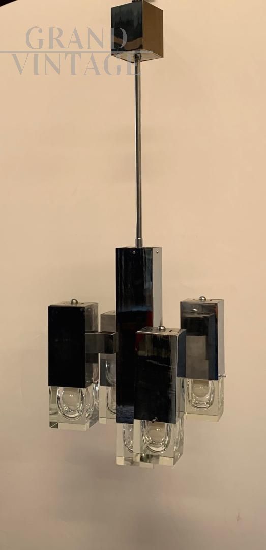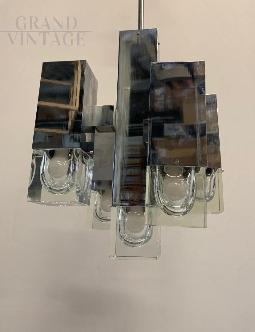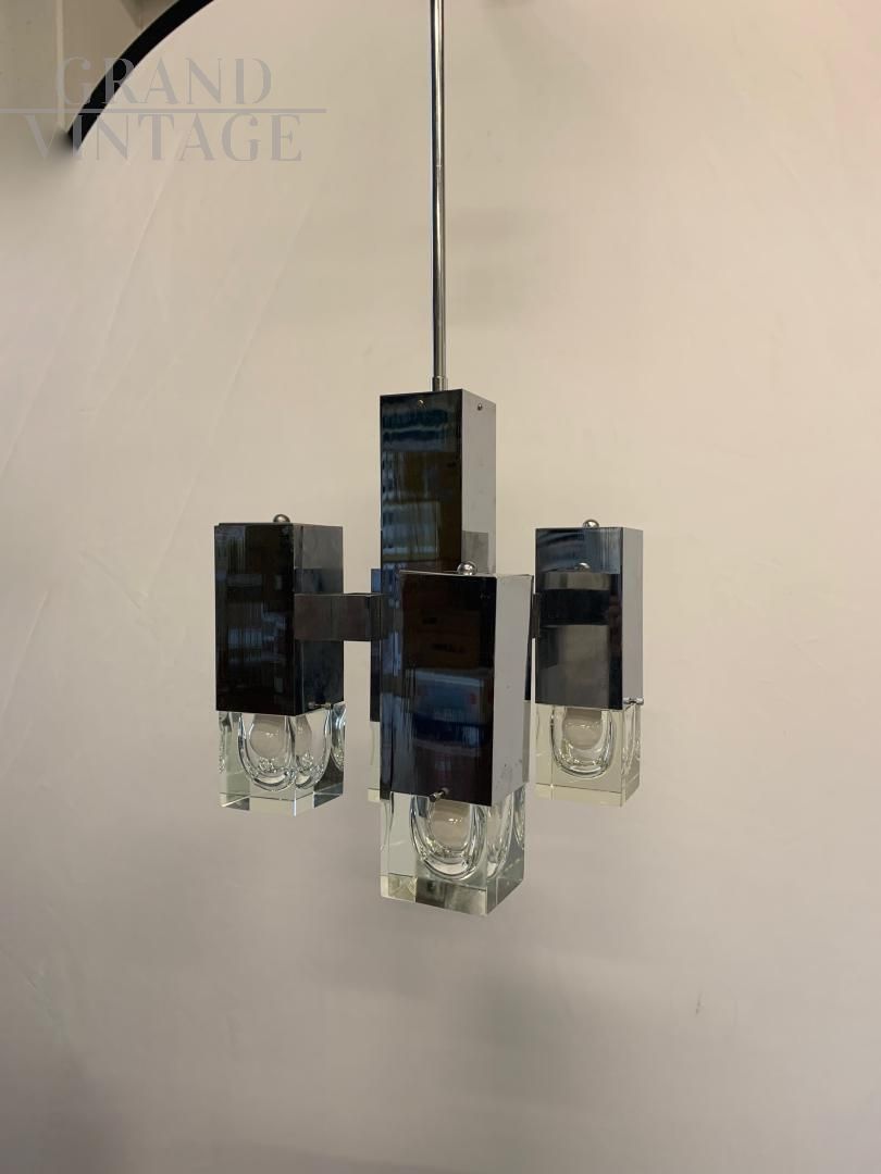 Lampadario geometrico di Murano anni '70 attribuito a Sciolari con struttura a cubi in ferro cromato e vetri di Murano trasparenti lavorati a mano su stampo, in eccellenti condizioni tutto restaurato, con vetri intatti ma che potrebbero avere piccole imperfezioni, presenta i naturali segni del tempo nella cromatura. I 5 punti luce presentano attacchi per lampadine di tipo E14 nuovi, con cavo elettrico interno nuovo. Le braccia e le foglie sono removibili per agevolarne un trasporto sicuro.