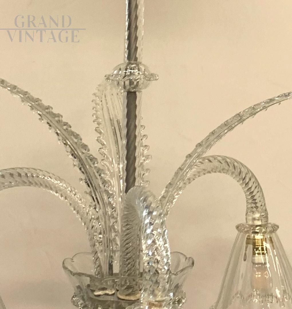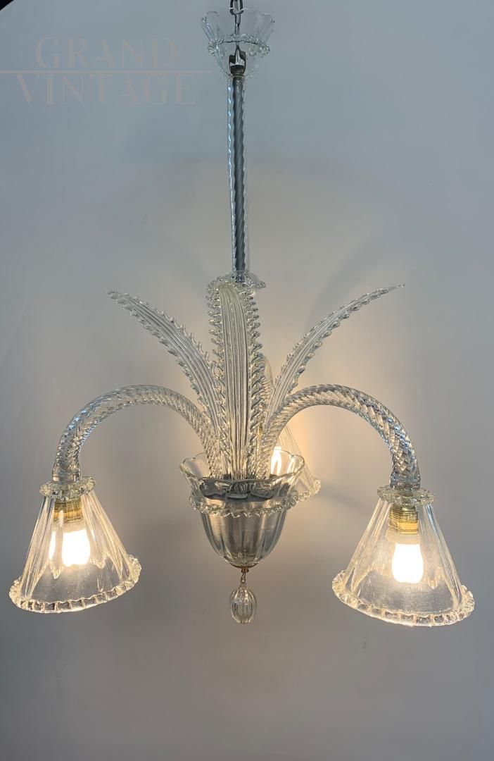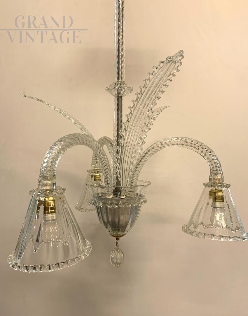 Elegante lampadario di Murano anni '50 attribuito a Seguso con struttura in legno e metallo rivestita con meraviglioso vetro di Murano trasparente lavorato, caratterizzato da tre bracci e tre punti luce con paralume a campana, decorato da foglie finemente lavorate. Il lampadario è in eccellenti condizioni tutto restaurato, con vetri intatti e non crepati. I tre punti luce presentano attacchi per lampadine di tipo E27 originali, riguardati e testati con cavo elettrico interno nuovo. Le braccia e le foglie sono removibili per agevolarne un trasporto sicuro.
