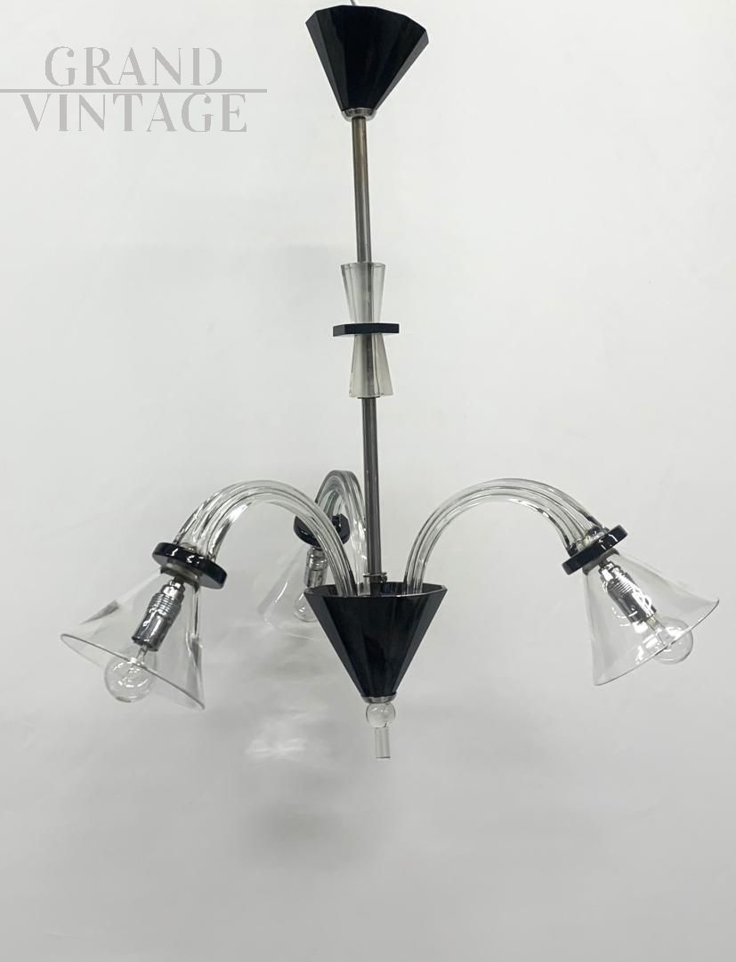 Elegante lampadario di Murano Art Déco anni '30 attribuito a Venini con struttura in legno e metallo rivestita con meraviglioso vetro di Murano lavorato a mano nei colori trasparente e nero, caratterizzato da tre bracci e tre punti luce con paralume a campana, decorato da foglie finemente lavorate. Il lampadario è in eccellenti condizioni tutto restaurato, con vetri intatti e non crepati. I tre punti luce presentano attacchi per lampadine di tipo E14 nuovi, con cavo elettrico interno nuovo. Le braccia sono removibili per agevolarne un trasporto sicuro, considerando la delicatezza del lampadario.