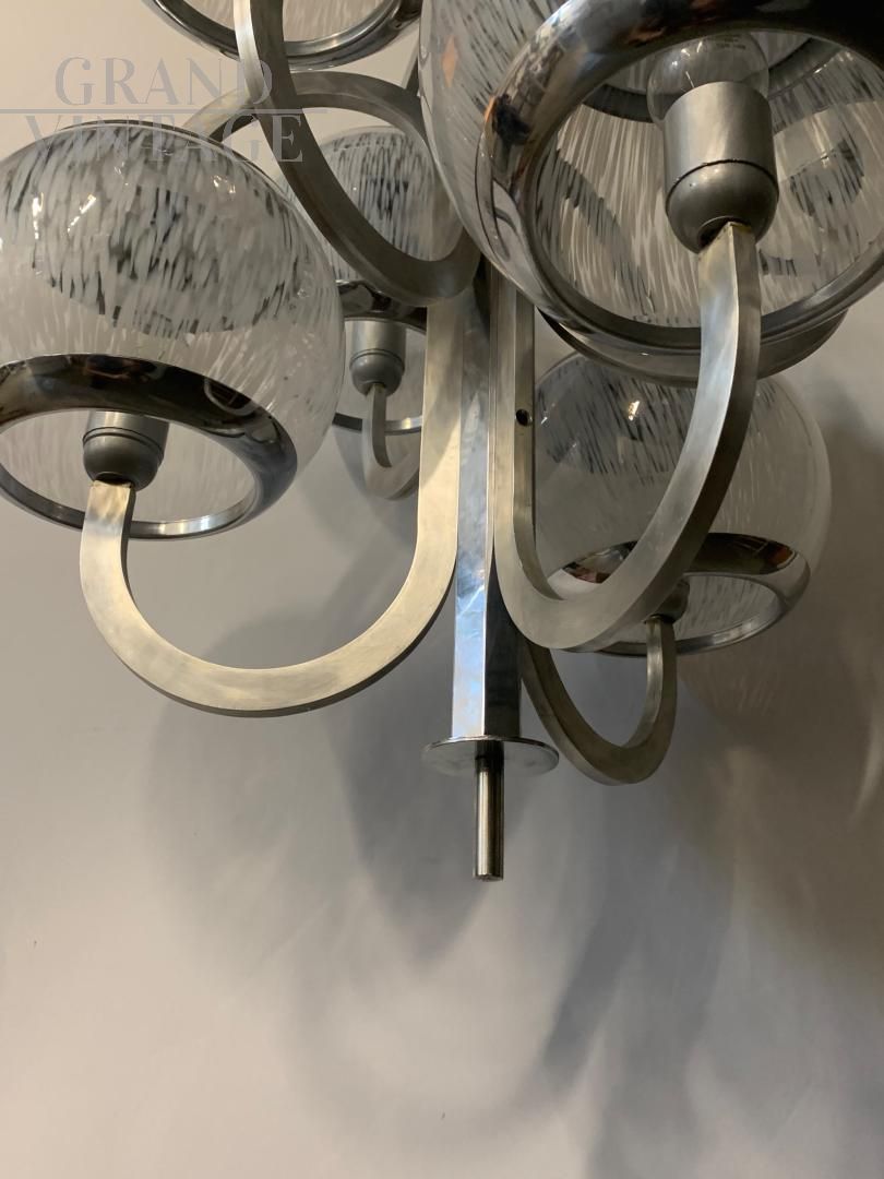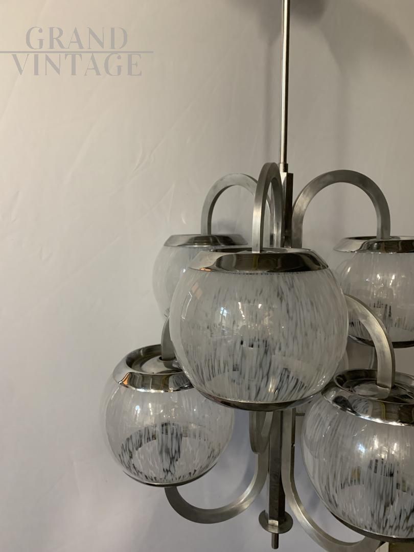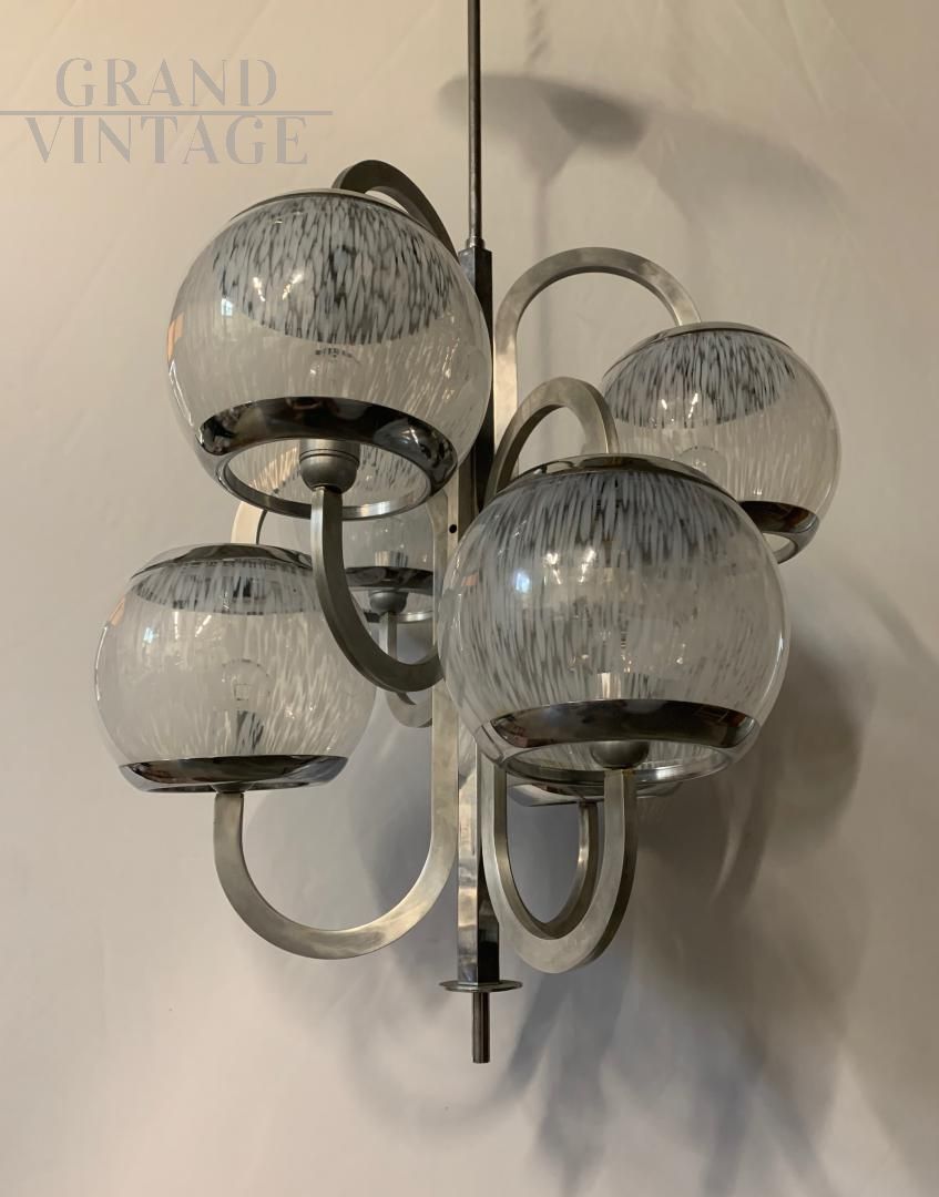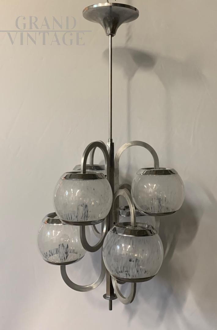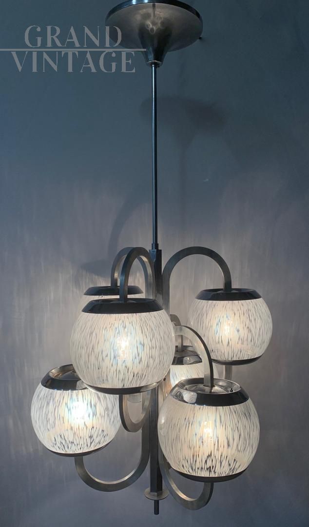 Bellissimo lampadario design in vetro di Murano con 6 punti luce a sfera, del 1960 circa, probabilmente un design di Carlo Nason, con struttura in metallo. Il lampadario è in ottimo stato, è stato totalmente pulito, ha pochi segni del tempo, i vetri non sono rotti nè crepati. Il lampadario è funzionante con impianto elettrico nuovo, dotato di 6 attacchi per lampadine di tipo E27, adatti per lampadine al Led. Nel prezzo dell'oggetto è compreso anche il restauro eseguito da personale competente e qualificato da oltre 40 anni. Se spedito, verranno smontati i vetri e l'asta, e naturalmente verrà imballato con cura in una scatola rinforzata.