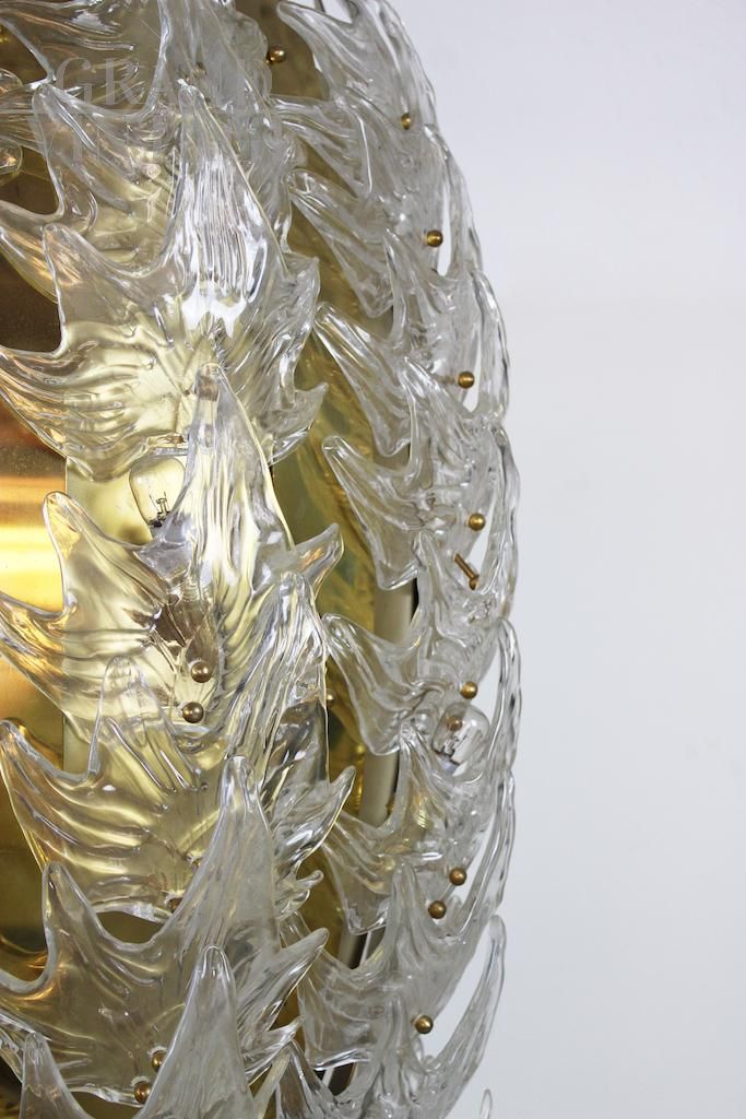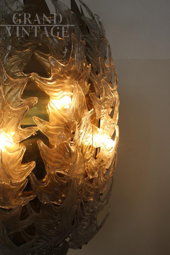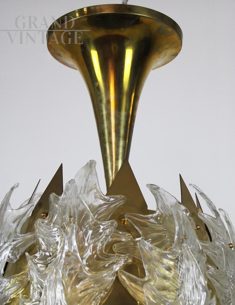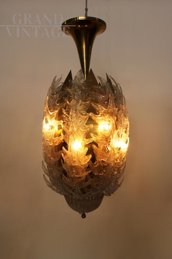 Particolare lampadario vintage con struttura in ottone rivestita in foglie in vetro artistico dorato, Italia anni '70.