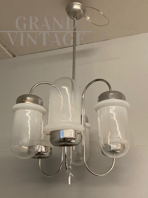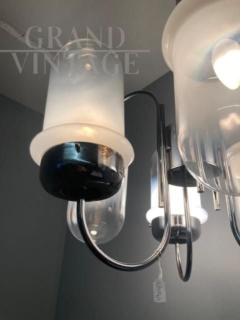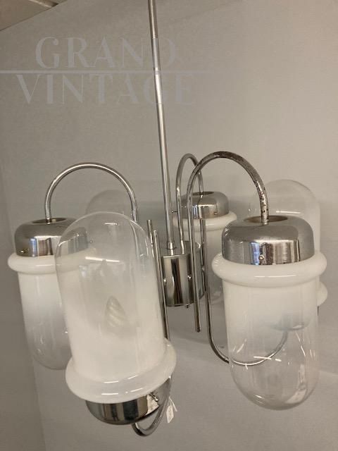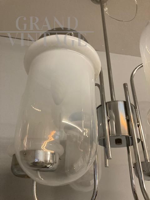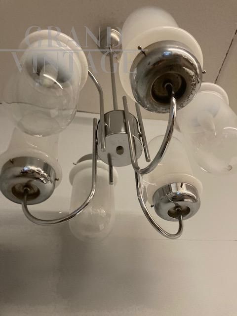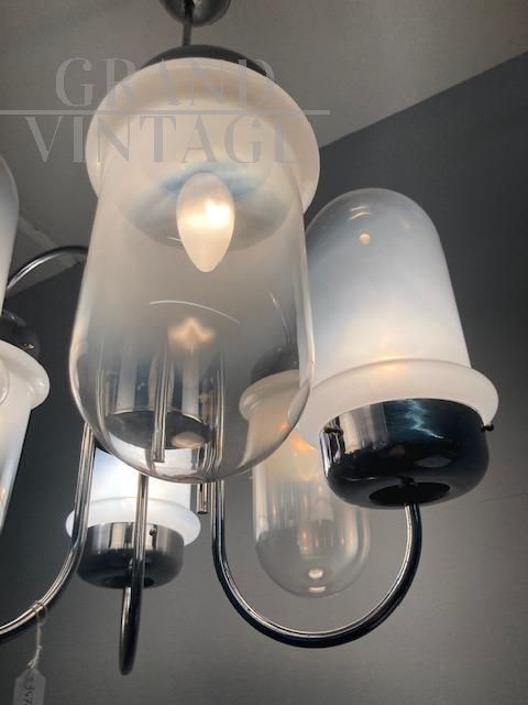 Lampadario vintage anni '70 in vetro di Murano trasparente sfumato bianco con sei luci su struttura cromata. In buono stato, con segni di vissuto nella cromatura. Impianto revisionato.