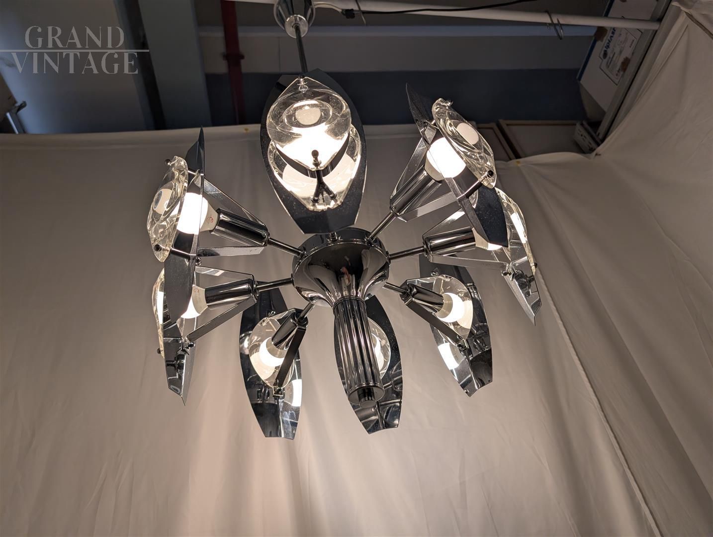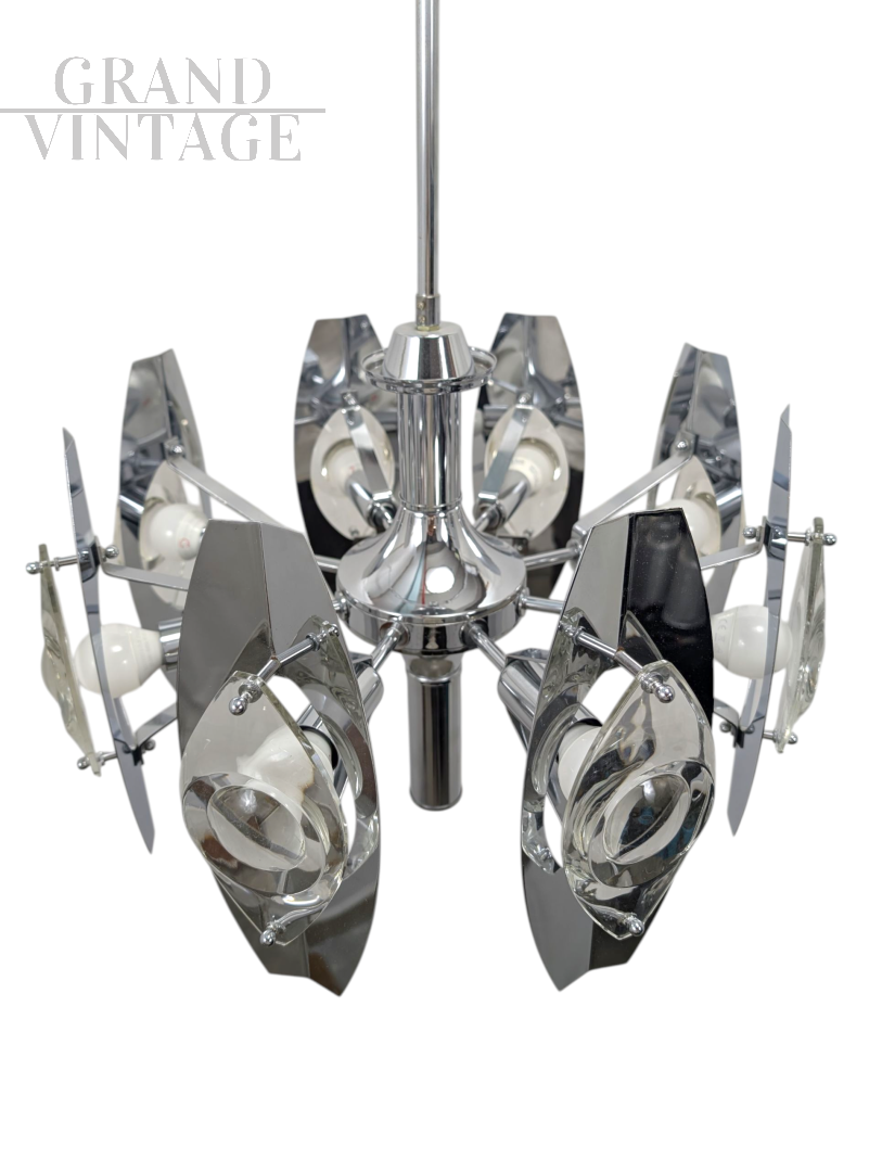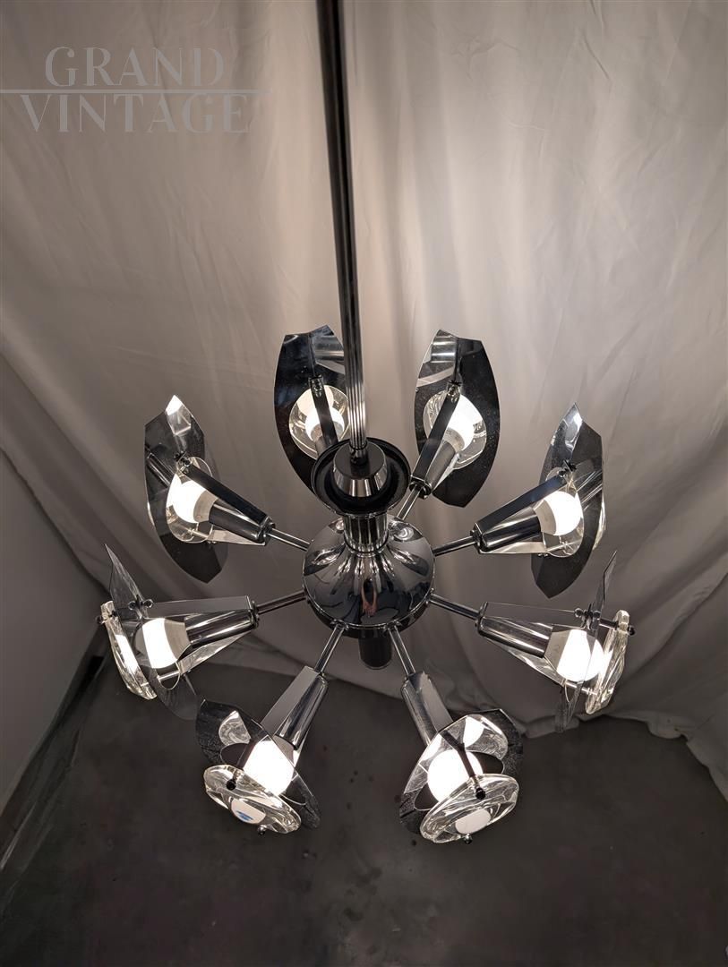 Splendido lampadario cromato del famoso designer italiano Oscar Torlasco. La finitura cromata di alta qualità offre un equilibrio sorprendente tra lucentezza e durata, con uno splendido gioco di forme geometriche e linee pulite che completano qualsiasi interno moderno o contemporaneo. Le condizioni sono ottime, l'impianto elettrico revisionato e portato a nuovo.