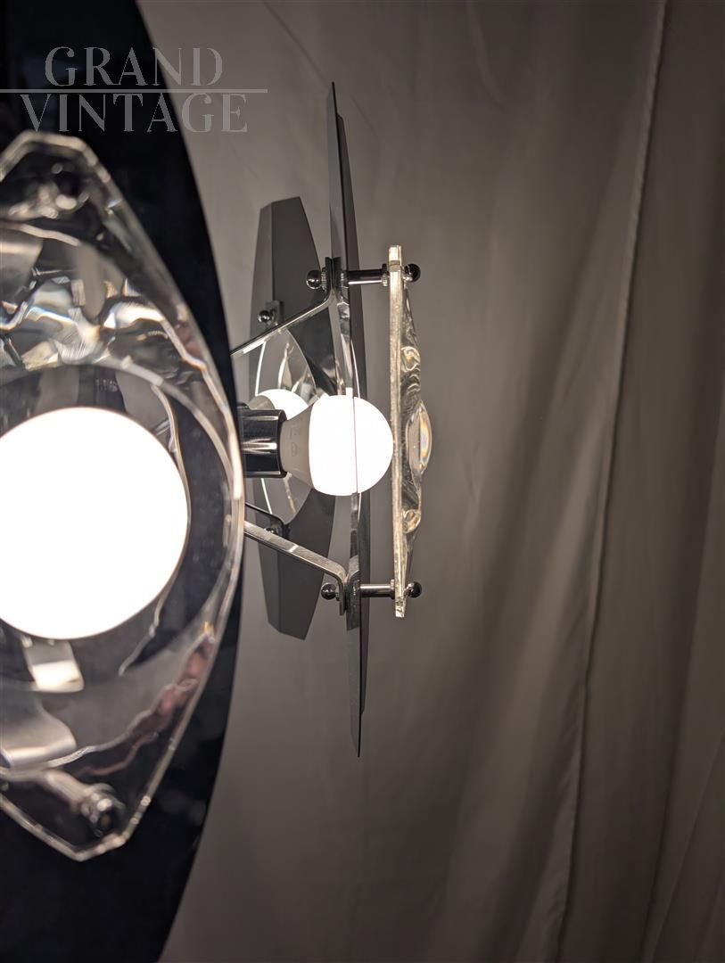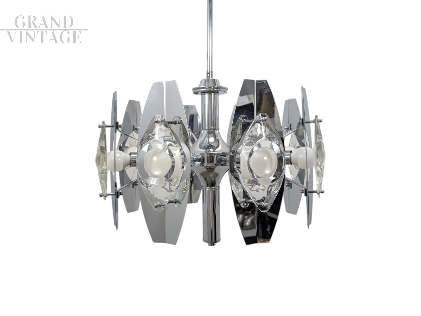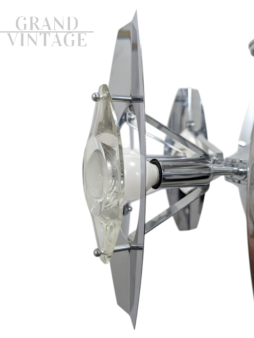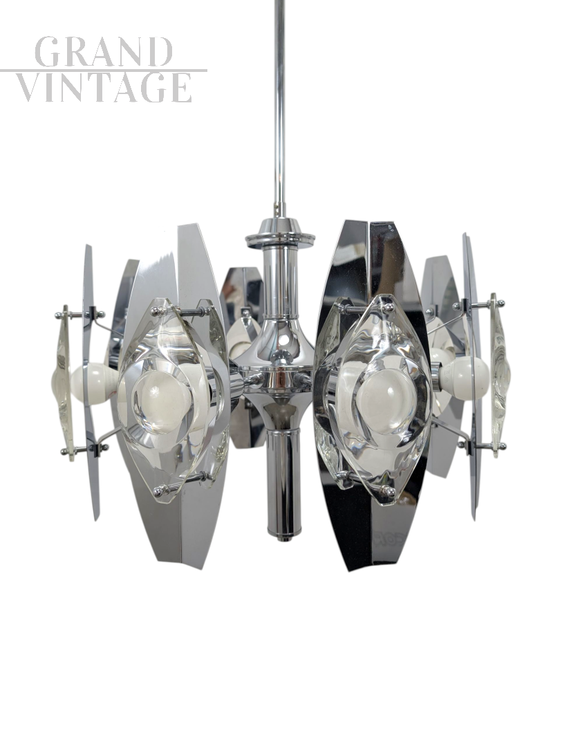 Splendido lampadario cromato del famoso designer italiano Oscar Torlasco. La finitura cromata di alta qualità offre un equilibrio sorprendente tra lucentezza e durata, con uno splendido gioco di forme geometriche e linee pulite che completano qualsiasi interno moderno o contemporaneo. Le condizioni sono ottime, l'impianto elettrico revisionato e portato a nuovo.