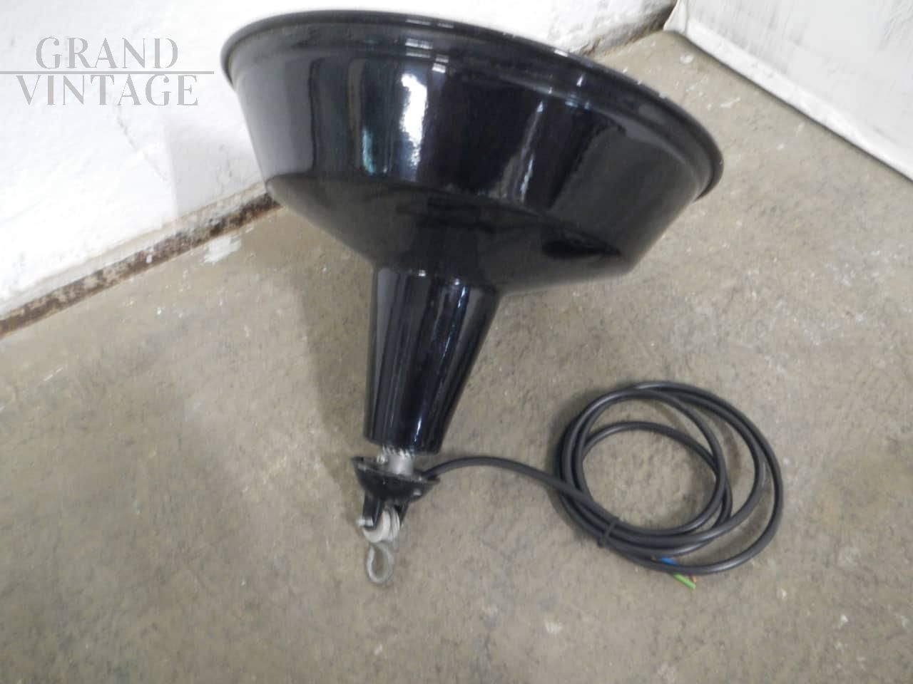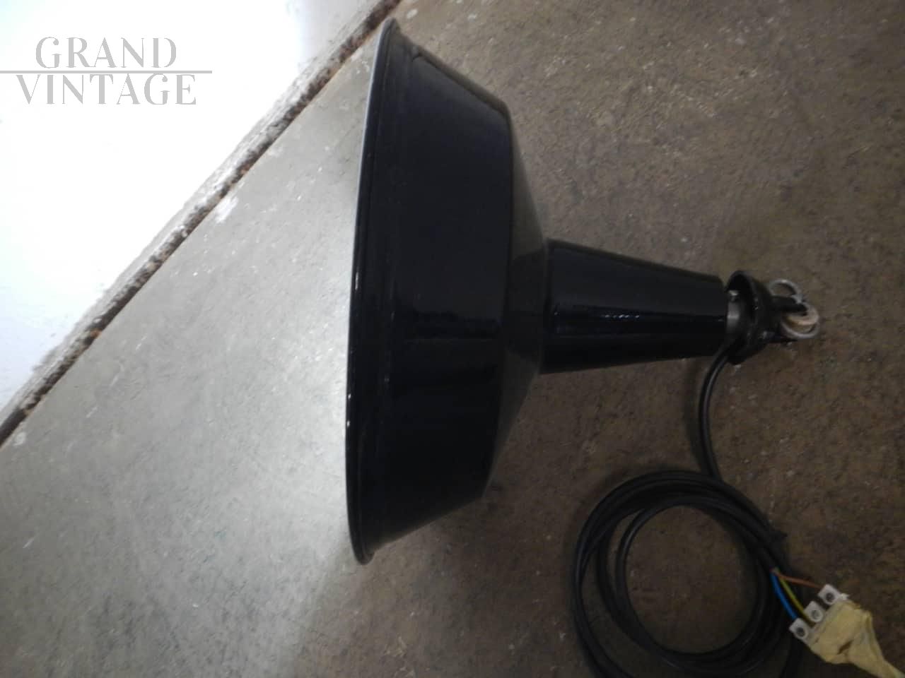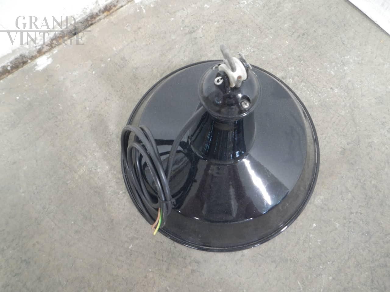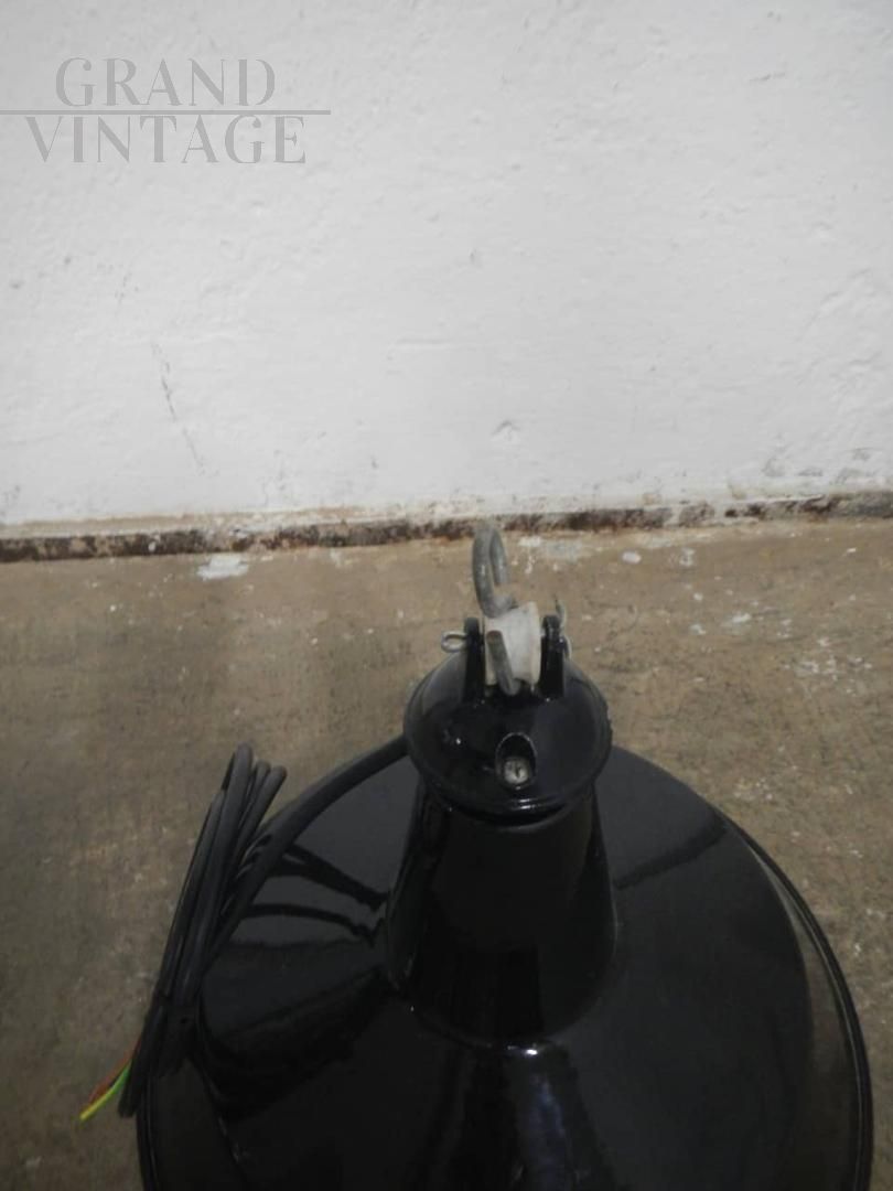 Lampade industriali vintage Nuova Seminara, anni '80, in metallo laccato nero con interno bianco e gancio in ceramica, impianto elettrico funzionante con lampadina E27.
