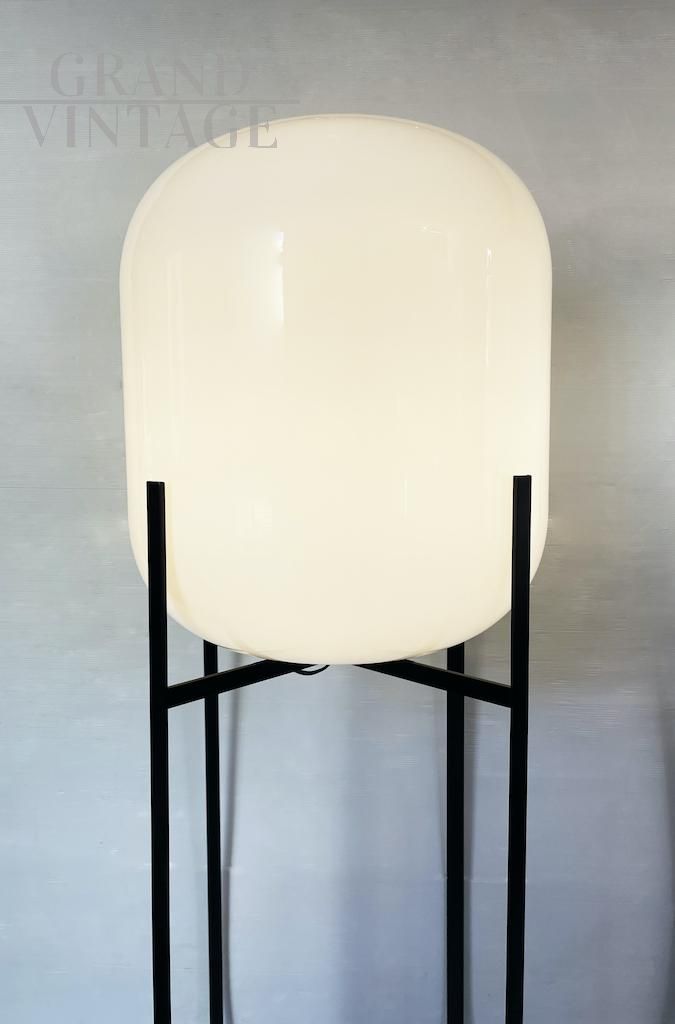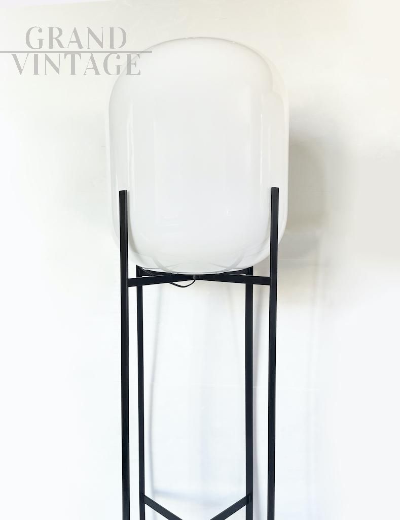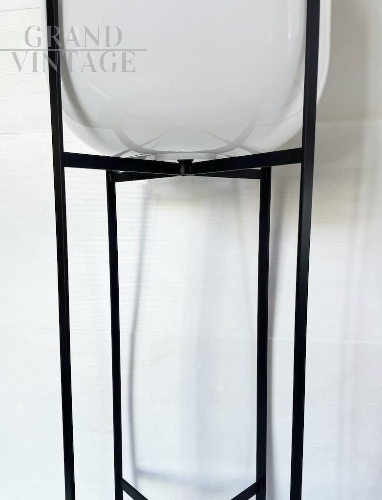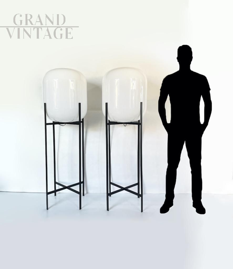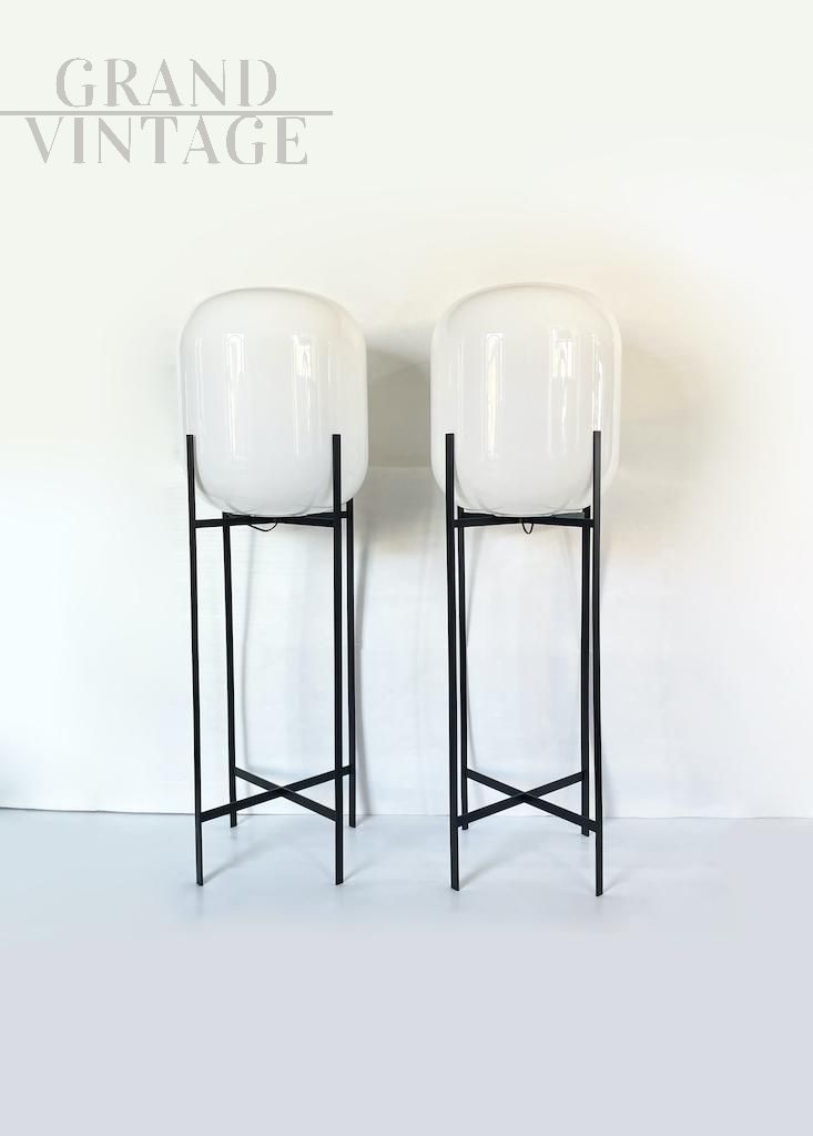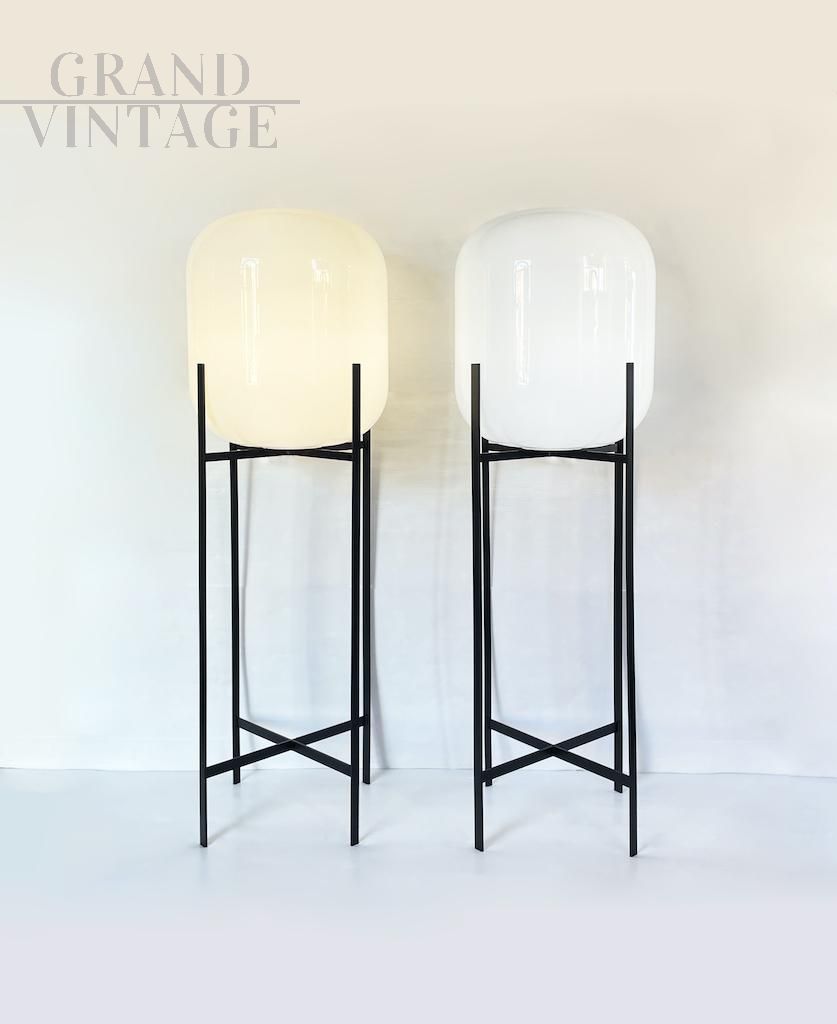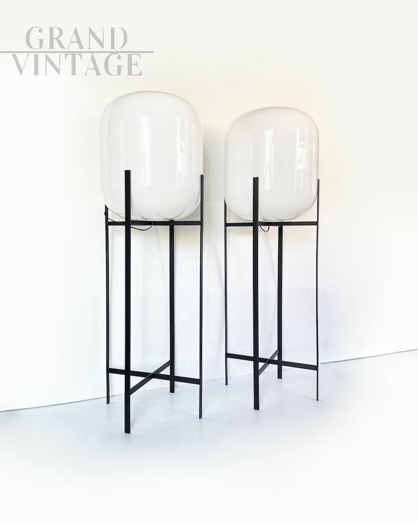 Particolare piantana contemporanea in stile Oda per Pulpo dello Studio Sebastian Herkner del 2014, caratterizzata da un globo luminoso in fine vetro soffiato bianco e una struttura in metallo semplice ed elegante che bilancia la grande “testa” sovrastante. Il design è ispirato alle fantastiche foto di torri d'acqua scattate dai fotografi tedeschi Bernd e Hilla Becher. Disponibile la coppia, il prezzo si intende cadauno.