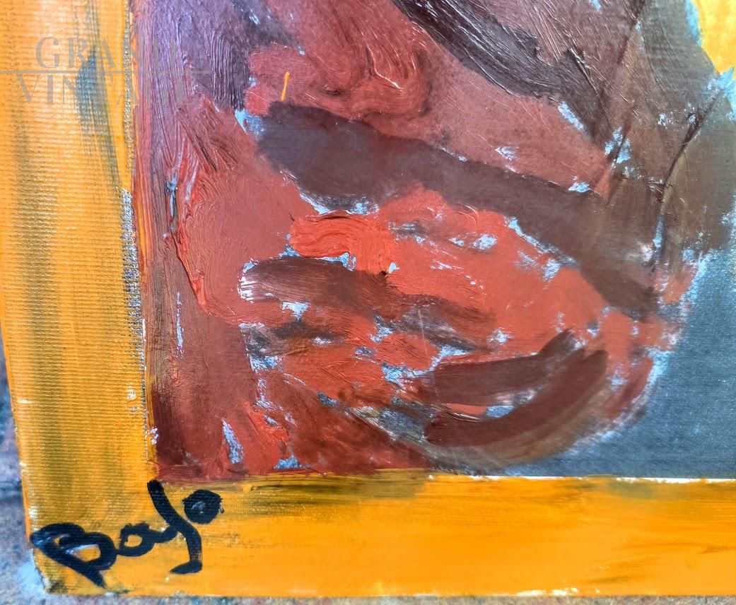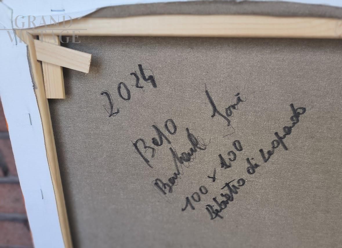 Leopardo e Danzatrice, dipinto acrilico su tela di Barbara Iori, in arte Bajo, realizzato nel 2025, misure 100 x 100 cm. "Leopardo con Danzatrice" di Barbara Iori (Bajo) è un’opera vivace e simbolica che unisce forza animale e grazia umana. Il grande volto frontale del leopardo domina la scena, con occhi verdi intensi che trasmettono un senso di vigilanza e potere. Alla sua destra, una danzatrice scura dai movimenti aggraziati e sensuali in abito verde sembra fondersi visivamente con la bestia, creando un dialogo tra istinto e armonia, ferocia e arte. I colori accesi, le linee marcate e la composizione frontale conferiscono energia e teatralità a un quadro che parla di natura e femminilità in chiave contemporanea.
