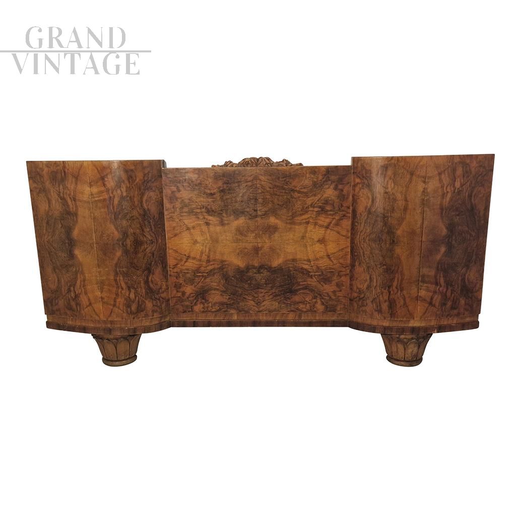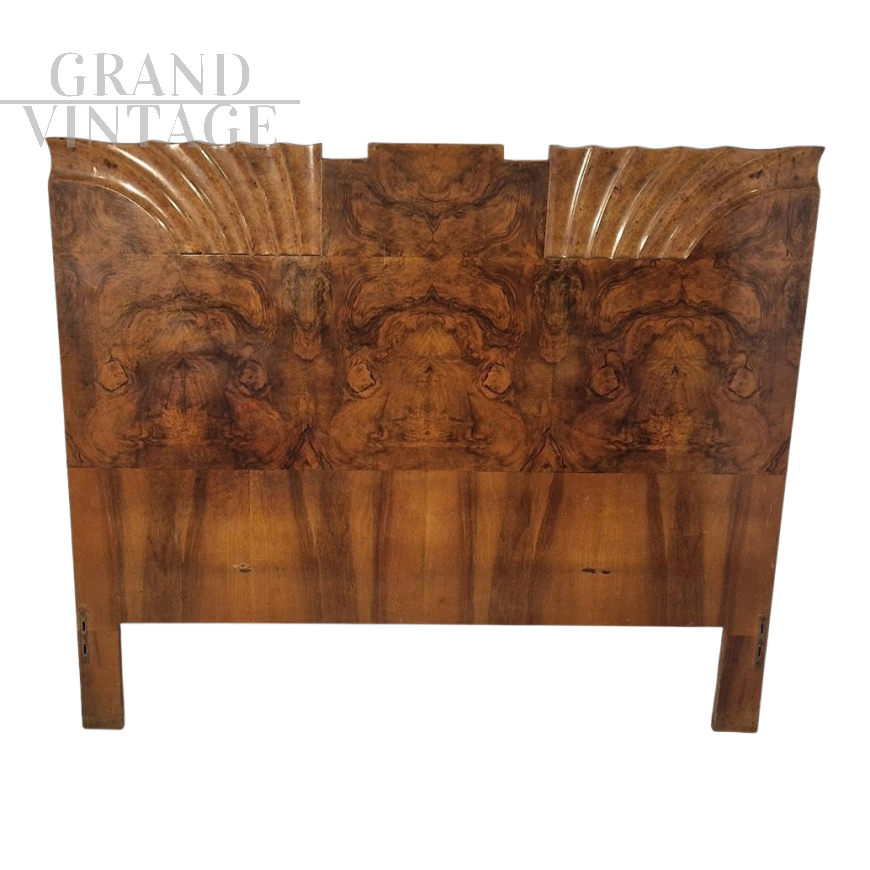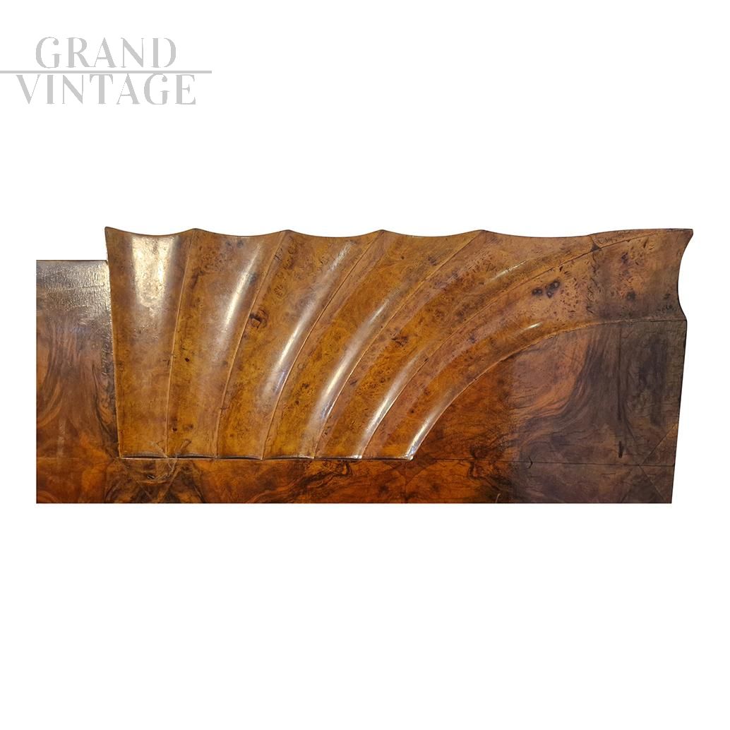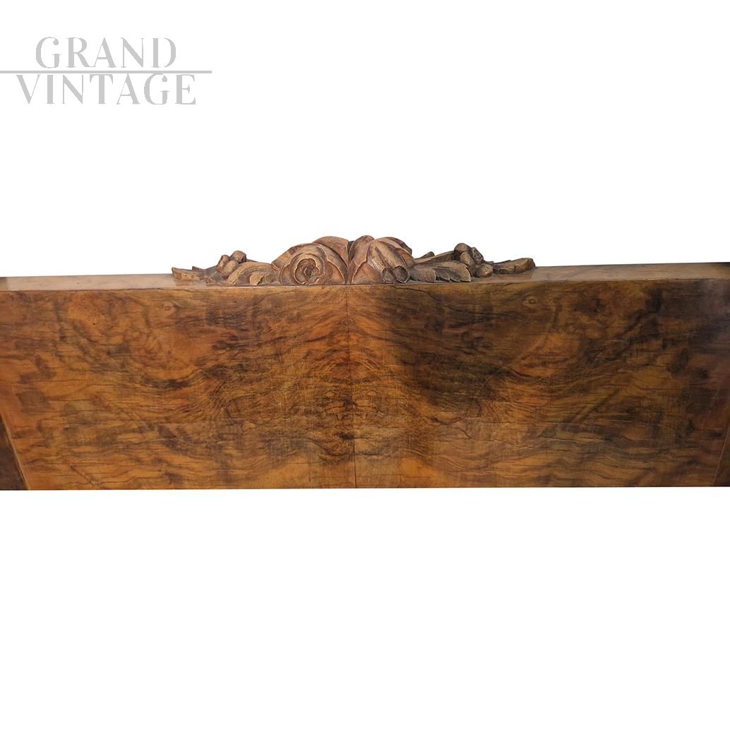 Letto Art Déco matrimoniale in noce e radica di noce.