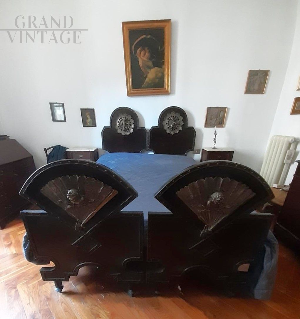 Splendido letto matrimoniale d’epoca, realizzato in ghisa e ferro battuto, risalente alla seconda metà dell’Ottocento. Il pezzo si distingue per la ricca decorazione con puttini in bronzo applicati su ventagli cesellati (pediera) e in medaglioni traforati floreali (testata). L’opera mostra l’eleganza e la raffinatezza tipiche dello stile eclettico / Liberty nascente, con influssi decorativi ottocenteschi.