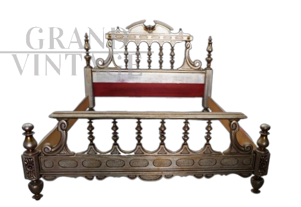Letto matrimoniale in stile antico intagliato e dorato a mecca, anni '70