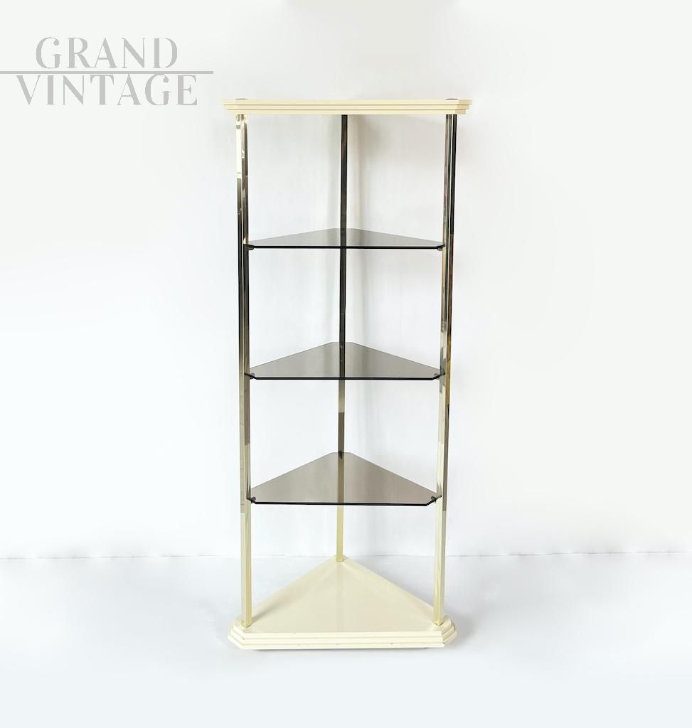 Libreria angoliera Stillglass in legno laccato avorio e vetro fumé, 1980