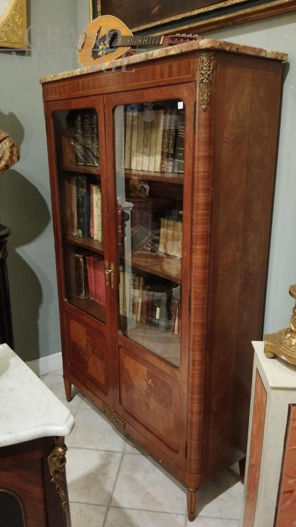 Libreria a vetrina antica di epoca Napoleone III in palissandro intarsiata a mano, in ottime condizioni.