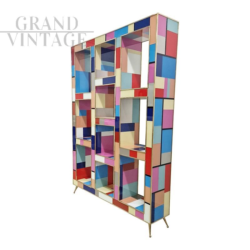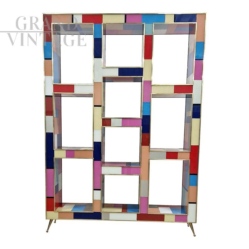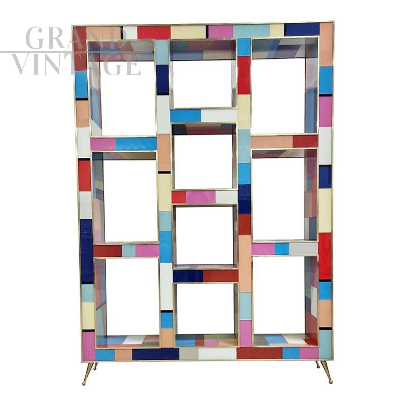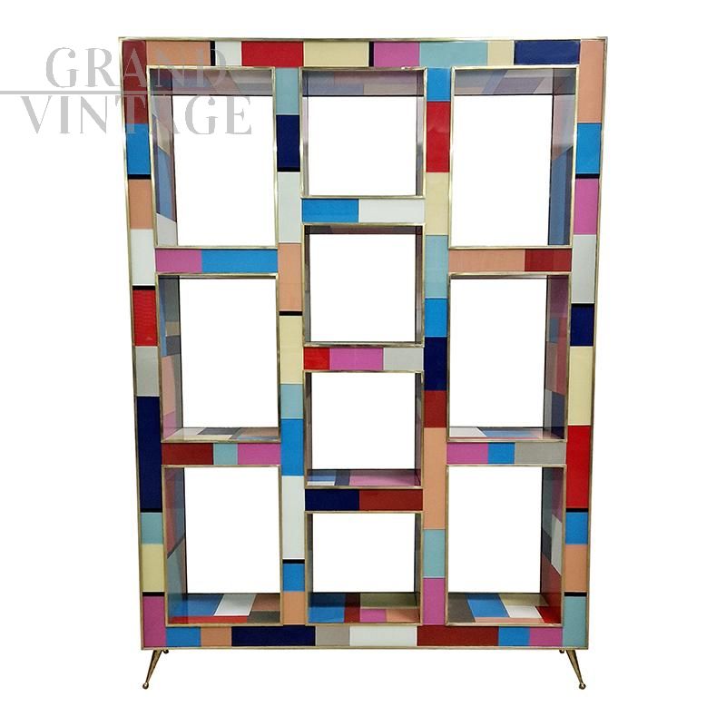 Libreria bifacciale a giorno, interamente realizzata a mano, con struttura in legno rivestita di tessere in vetro di Murano multicolore, con profili e piedi in ottone dorato.