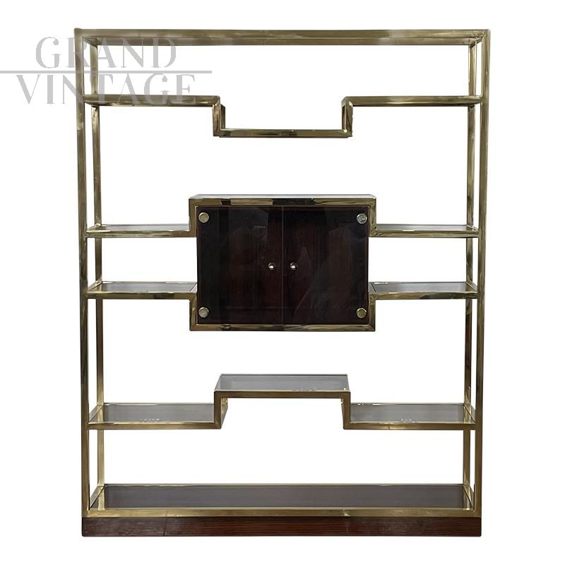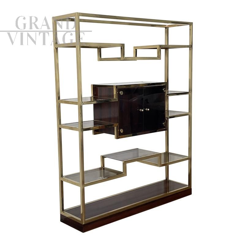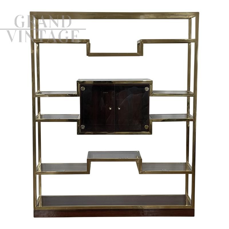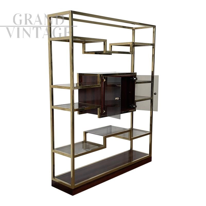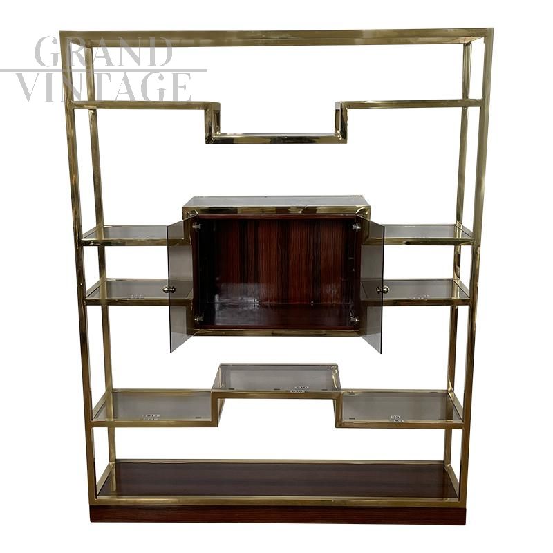 Libreria a giorno design in tubolare di ottone dorato, con basamento in legno di makassar, ripiani in vetro fumé e modulo centrale a vetrina in palissandro con ante in vetro fumé; pomellini in metallo cromato.