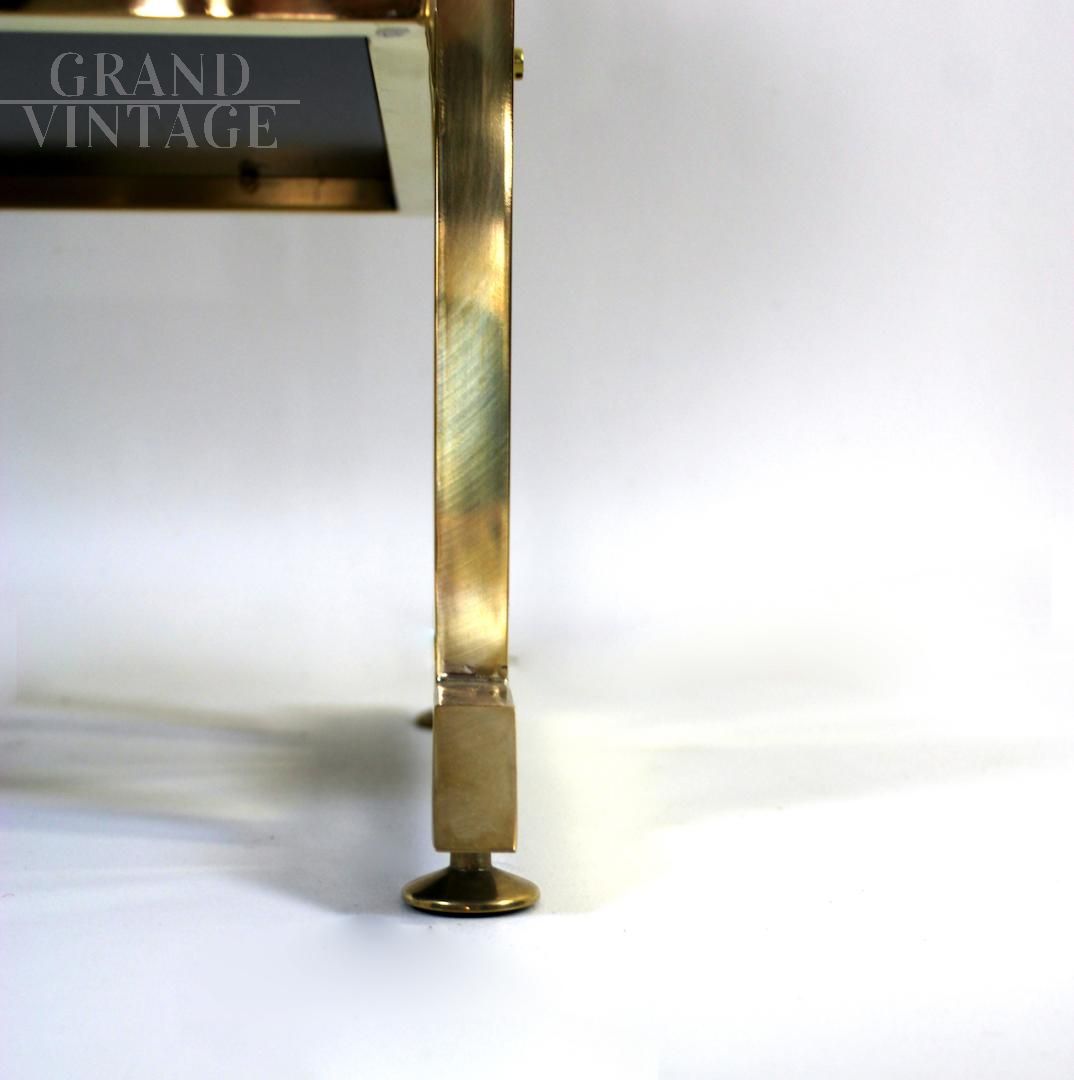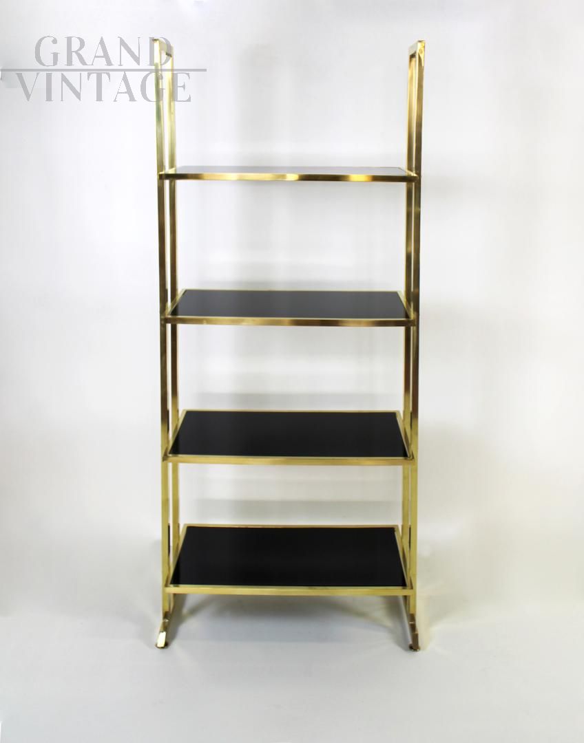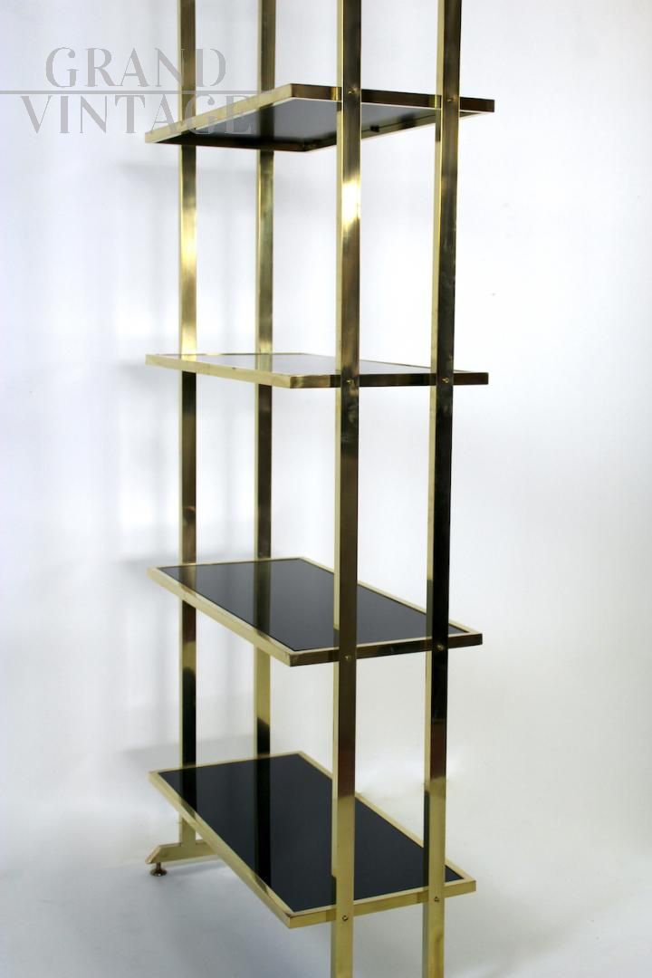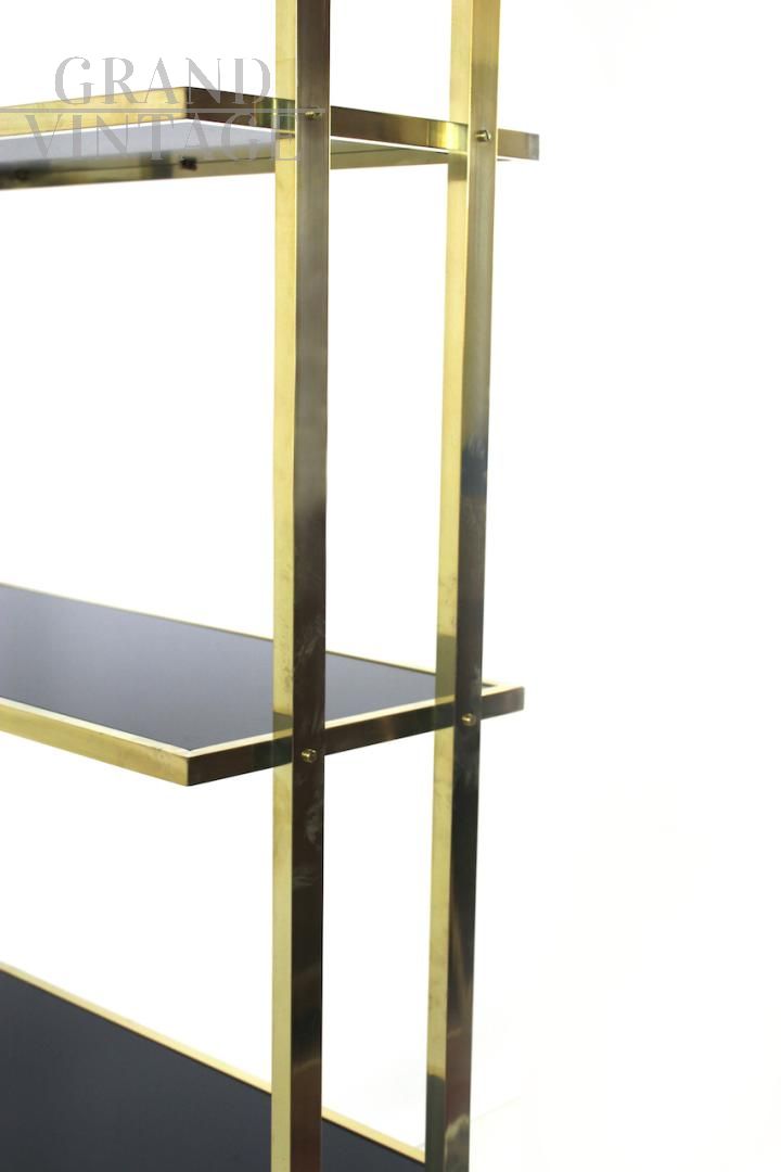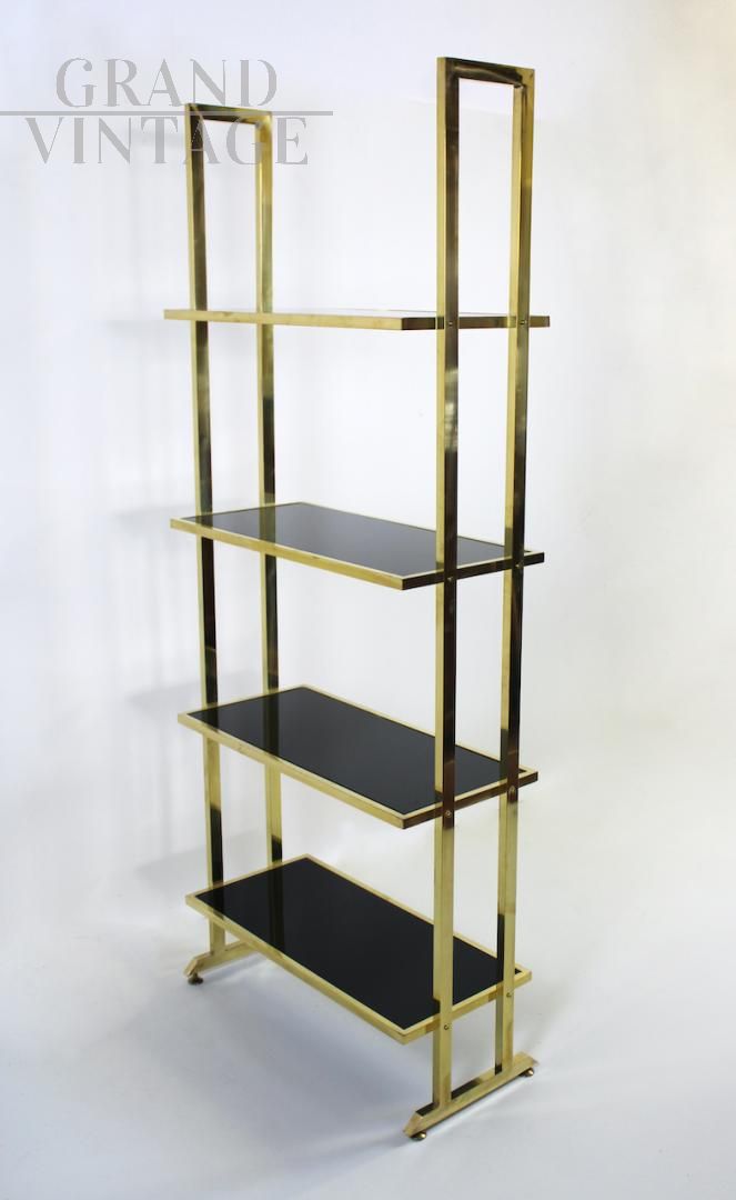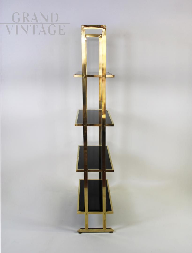 Elegante libreria design modernariato con struttura interamente in ottone e 4 ripiani in vetro nero, Italia anni '70.