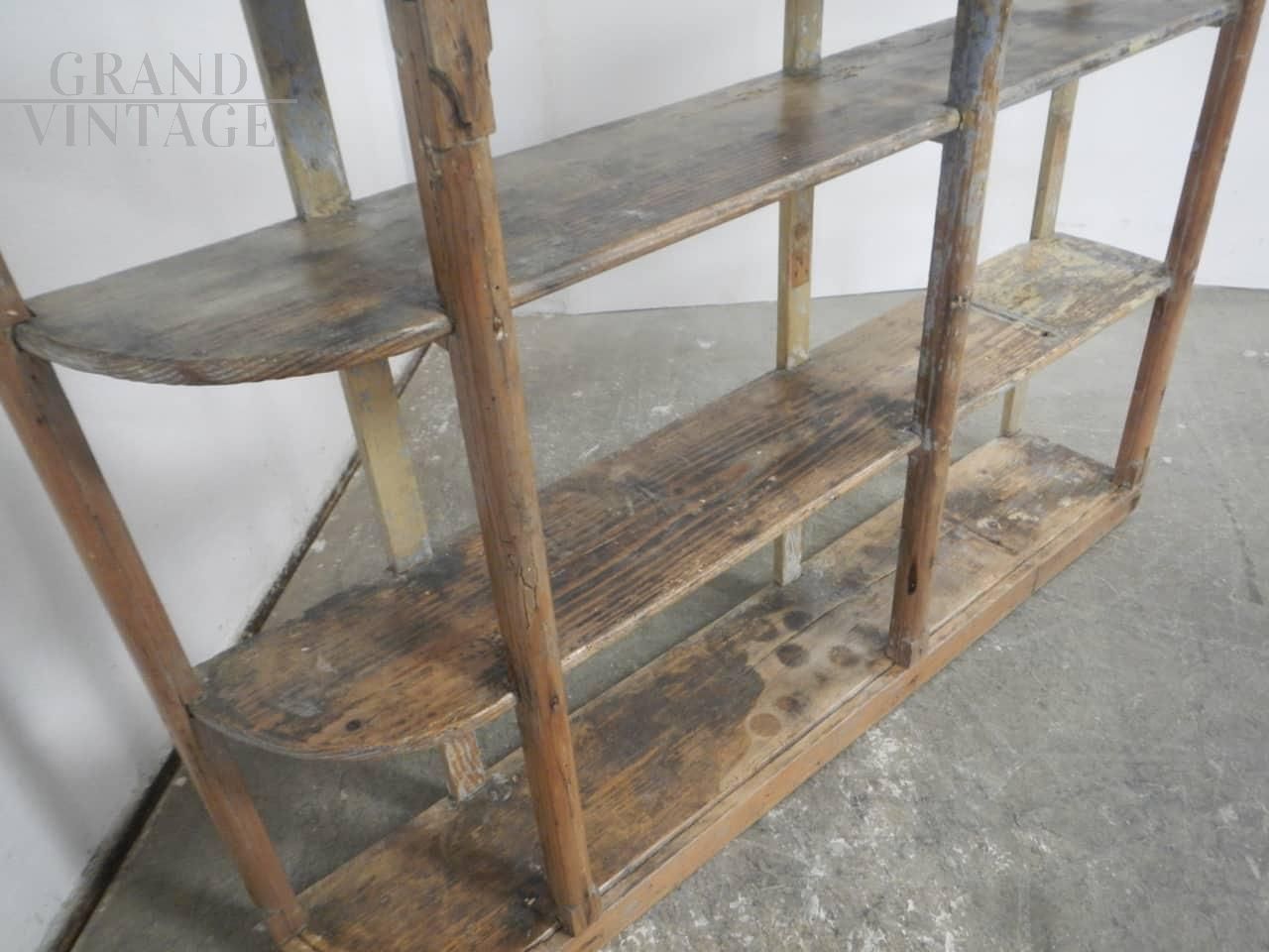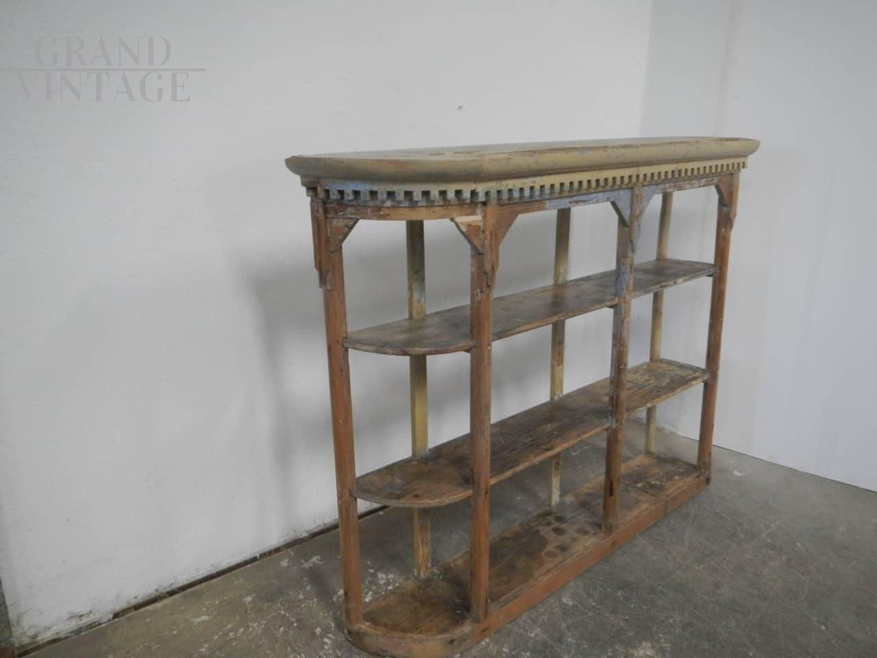 Libreria scaffale vintage a giorno in legno di abete intagliato e laccato, realizzato in Italia negli anni '40, con un lato stondato, perfetta da porre in un angolo del soggiorno o in un negozio. Completamente restaurata ma lasciata al naturale con difetti nel legno per non incidere nella struttura del mobile. Le mensole sono fisse.