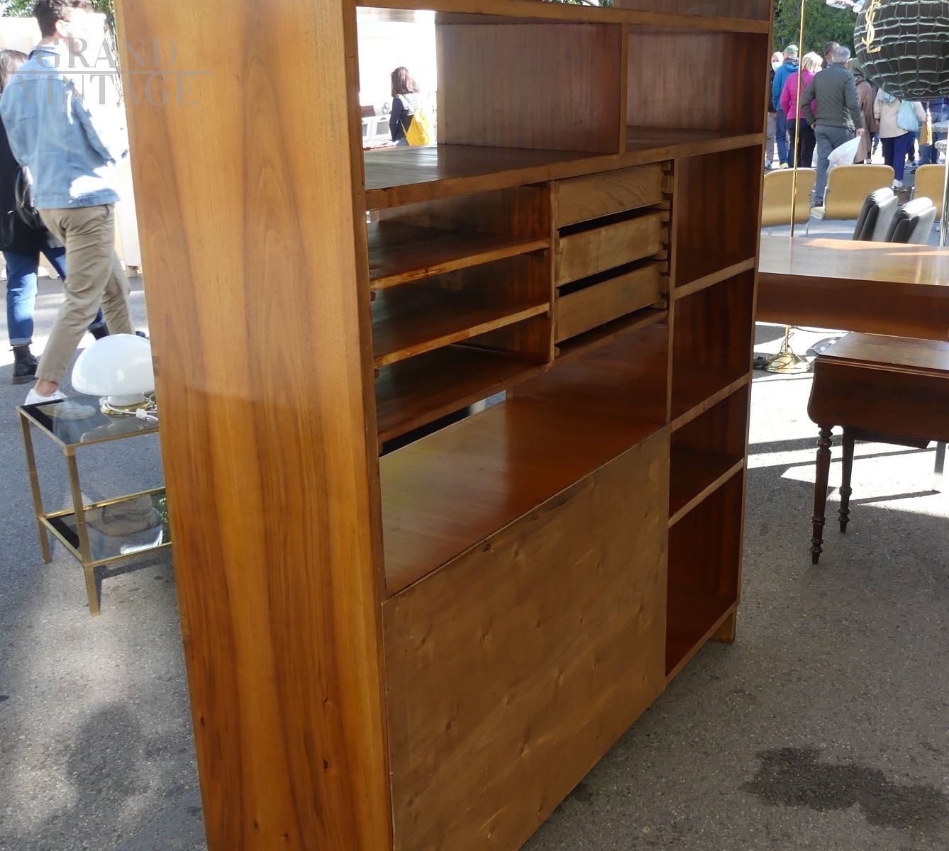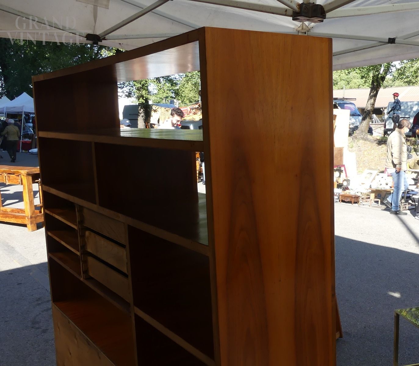 Libreria vintage anni '50 in legno di noce massello e mogano, con struttura a giorno e due moduli, uno con 3 cassetti e uno con doppia anta. Ottime condizioni vintage.