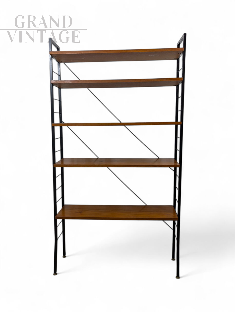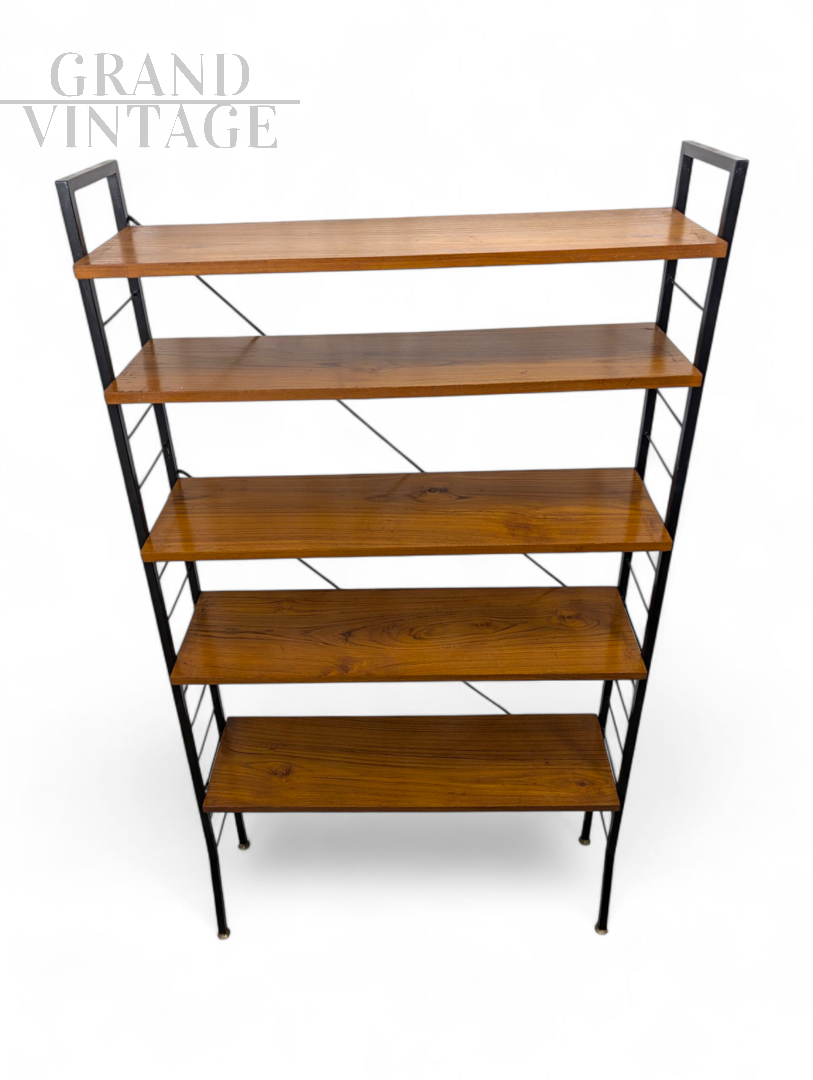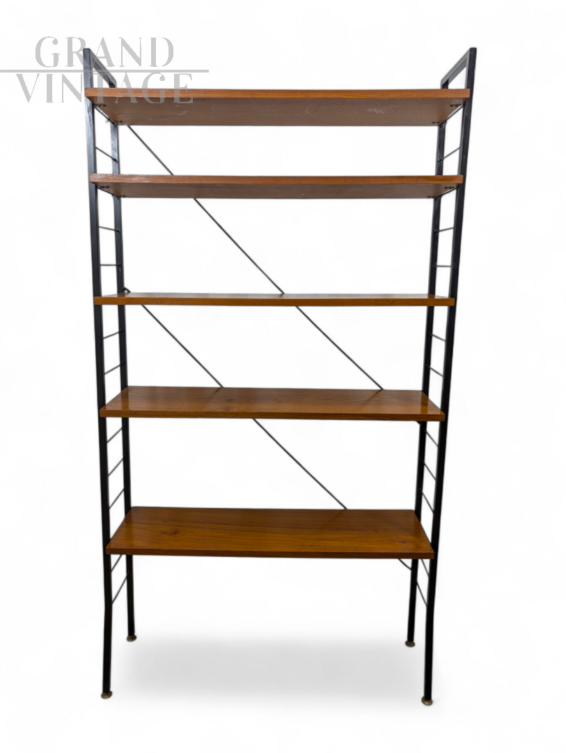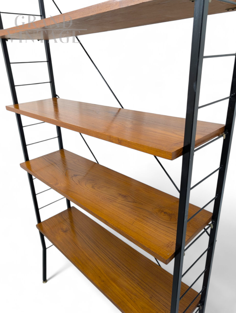 Libreria vintage svedese a giorno con 5 ripiani in legno teak e con struttura a montanti in ferro laccato nero, anni '60. Ottime condizioni, leggeri segni del tempo.