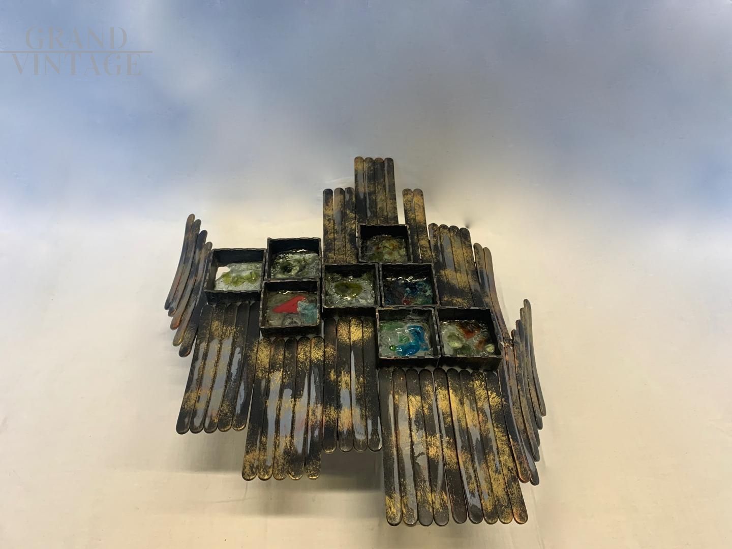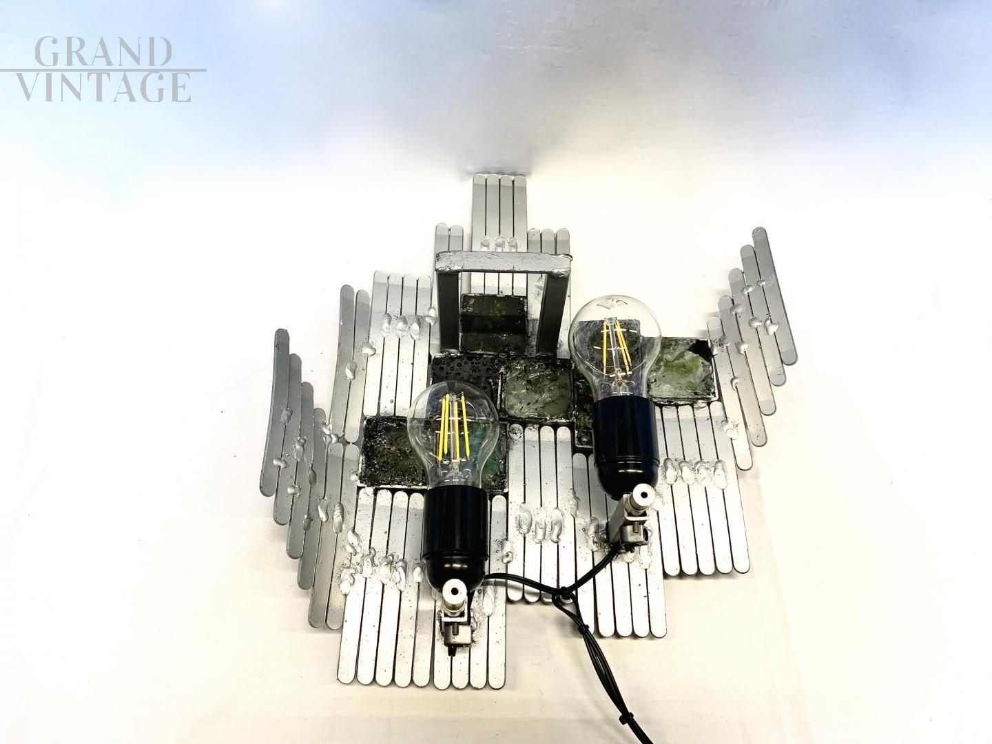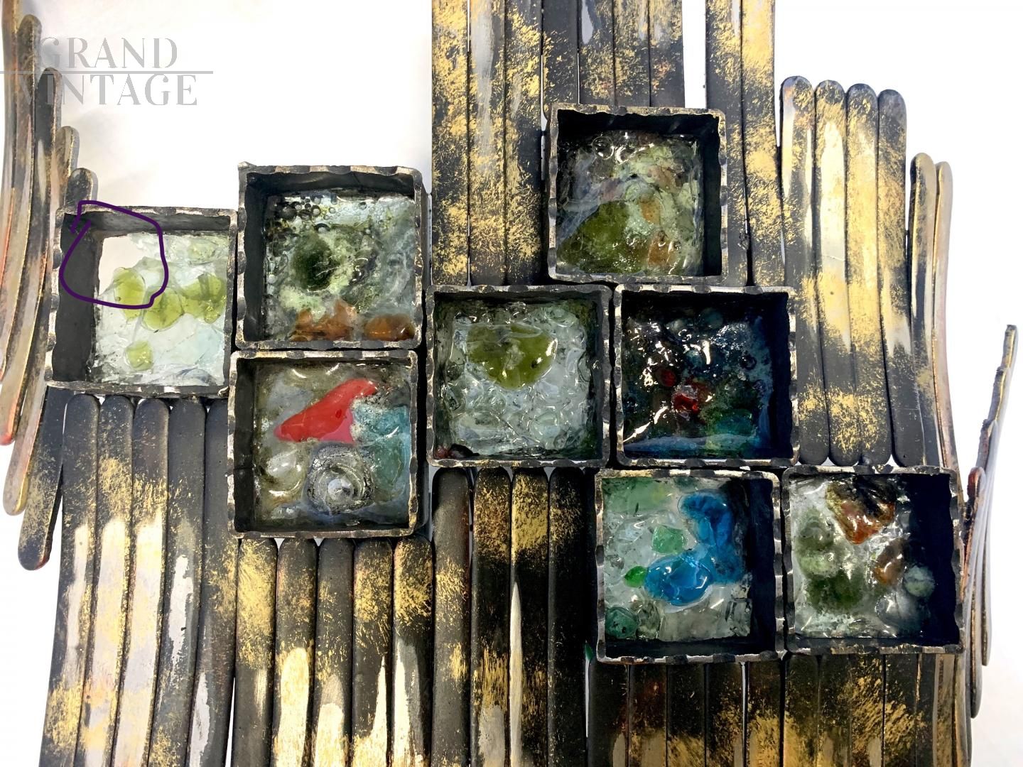 Applique singola di ferro battuto artigianale con vetri di Murano, ditta Longobard, con vetri tagliati a mano e incollati alla struttura, molto belli e particolari. La struttura è in ferro battuto lavorato a mano. La lampada ha 2 lampadine con attacco E27. Ottima lampada per ambienti rustici. Ha un quadrato con un vetro che ha una piccola mancanza, che non si nota molto.