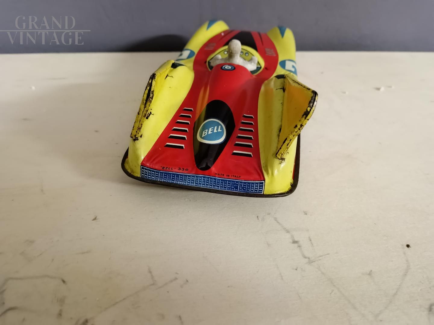 Bellissima macchinina di latta prodotta da Belloni Milano negli anni '60, nei colori giallo e rosso, presenta il simbolo della Ferrari e la scritta Bell 330, in perfette condizioni. Presenti il pilota e le pinne posteriori. Non ci sono ammaccature e i colori sono vividi e belli. Perfetto oggetto d'arredamento!