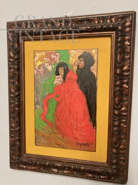 Antico dipinto raffigurante Maschere, olio su Cartone anni '20, firmato in basso a destra, datato sul retro con dedica.