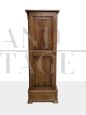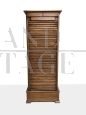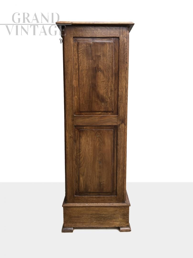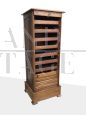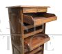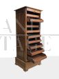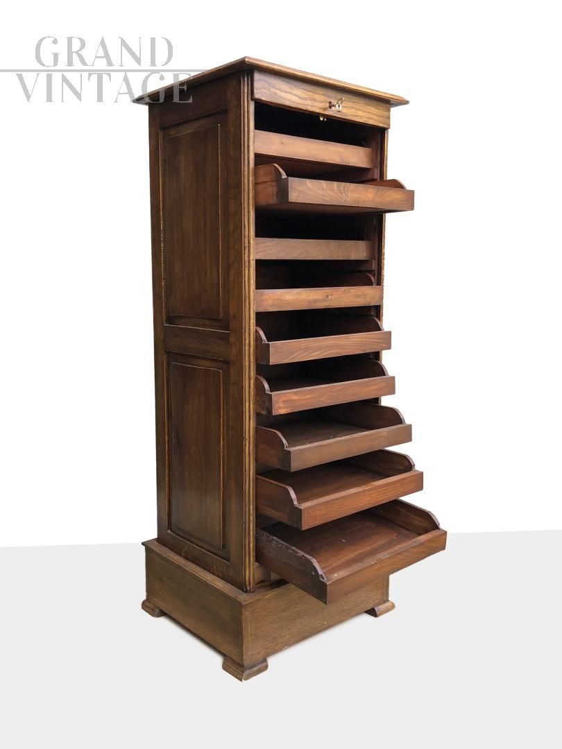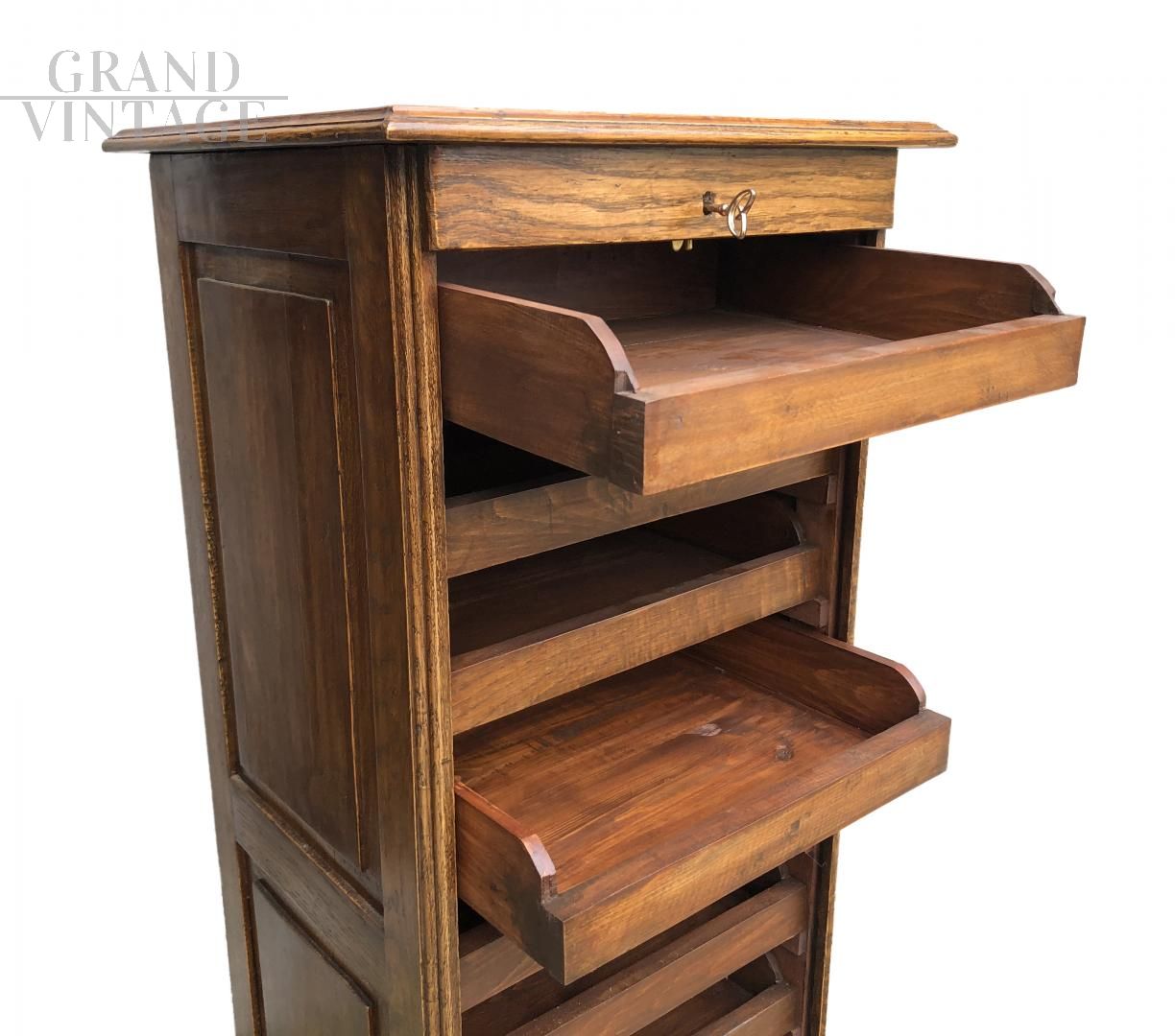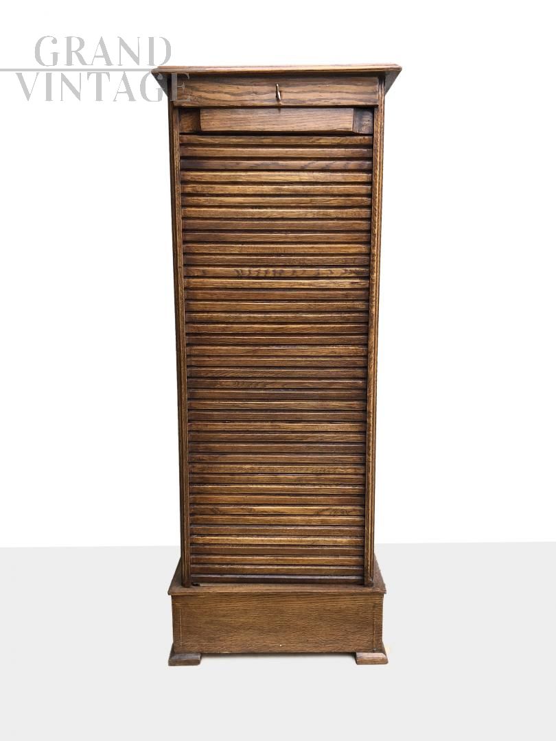 Mobile a serrandina da ufficio, stile vintage, in legno di castagno della prima metà del XX secolo, organizzato all’interno con classificatore scadenzario a nove cassetti, intagliato sui fianchi e sul retro a motivo geometrico, basamento rettangolare in appoggio su quattro piedi sagomati.