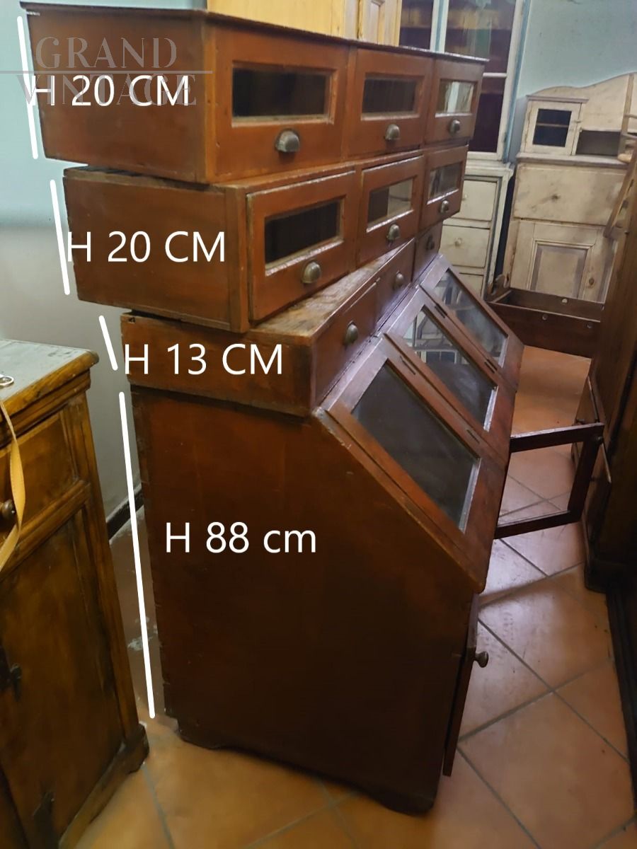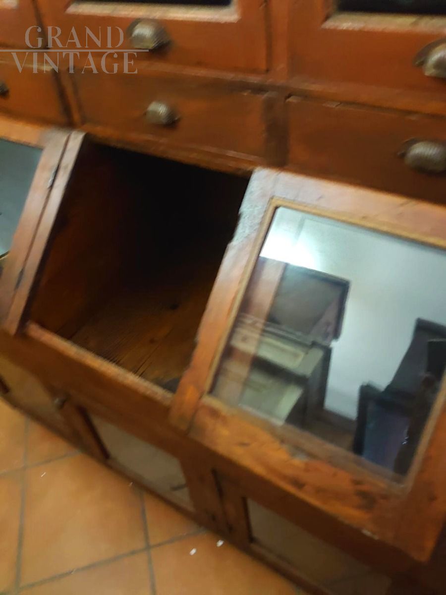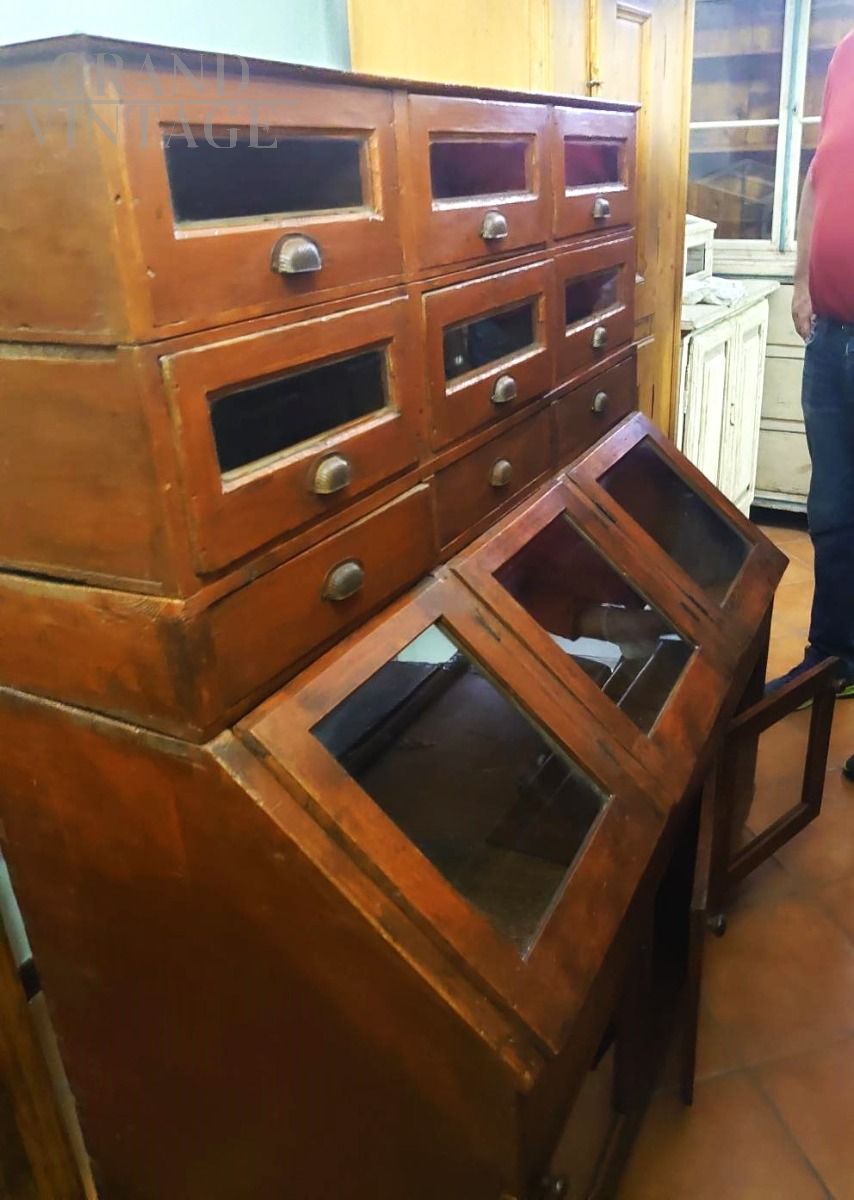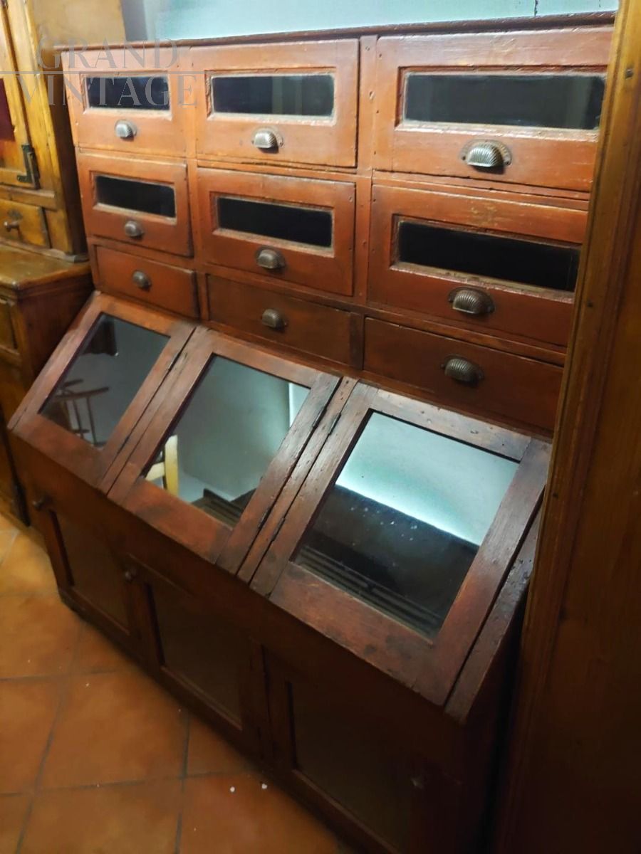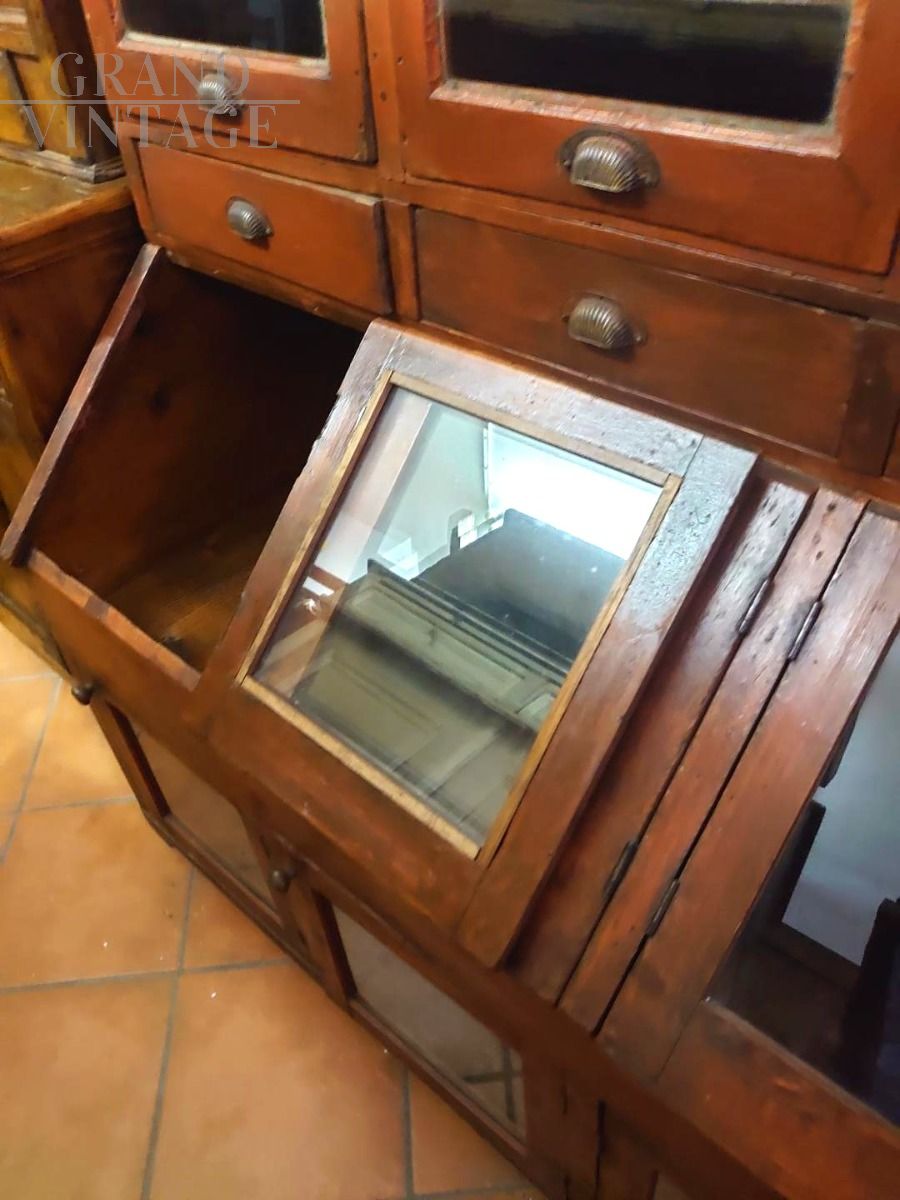 Mobile da negozio in abete, in pittura originale bordeaux, della fine dell'800, in 3 corpi. Il corpo superiore è caratterizzato da 6 cassetti con vetro e 3 piccoli cassetti in legno, il corpo centrale è composto da vani con ante a vetro apribili a ribalta, mentre la parte inferiore è caratterizzata da tre scomparti chiusi da antine in con vetro.